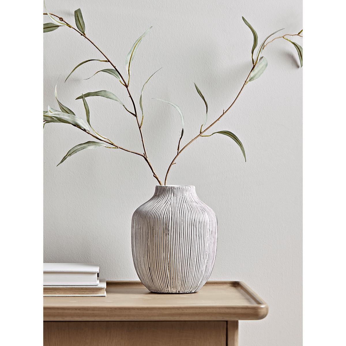 Crafted from polyresin with a simple urn shape, whitewashed finish and gently striated design, our elegant textured vase pairs beautifully with a wide variety of faux stems.