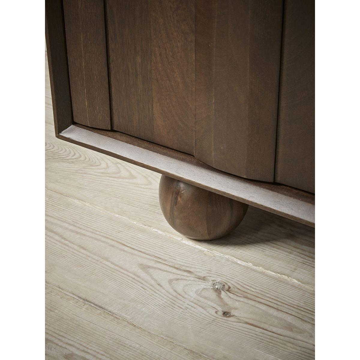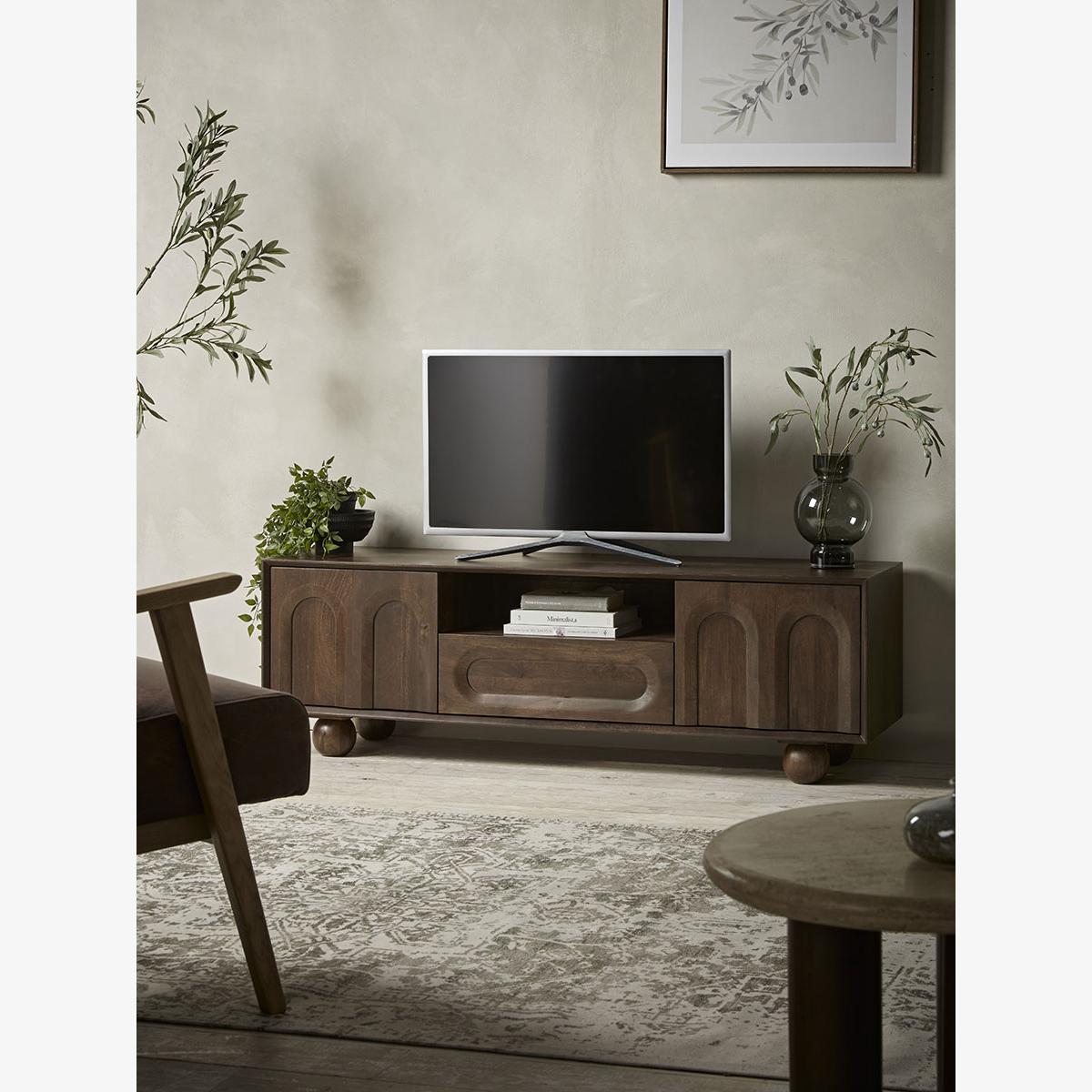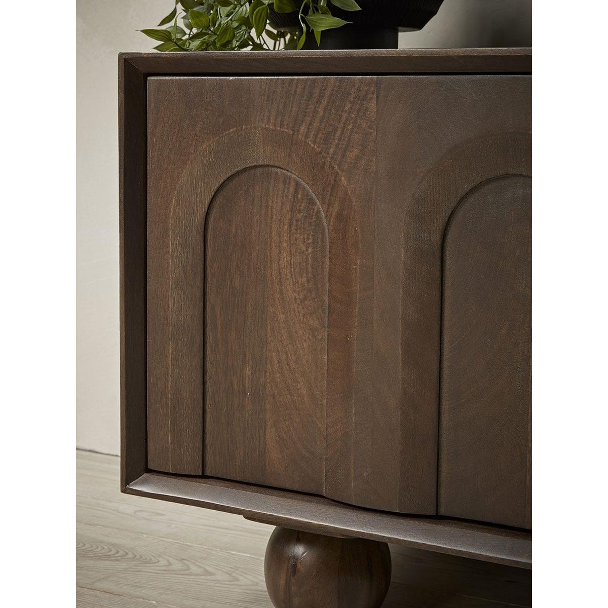 Made up of two cupboards and a drawer, our Teya media unit takes your living space beyond the ordinary. Crafted from a dark stained mango wood, soft arches in the doors and rounded ball feet work to add a 70s inspired style to your space for a timeless addition to your home. Also available as a sideboard, coffee table and console table.