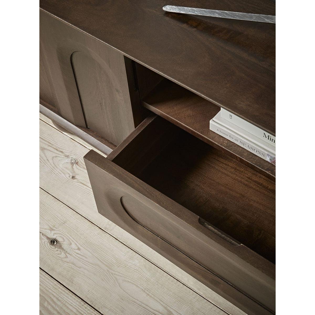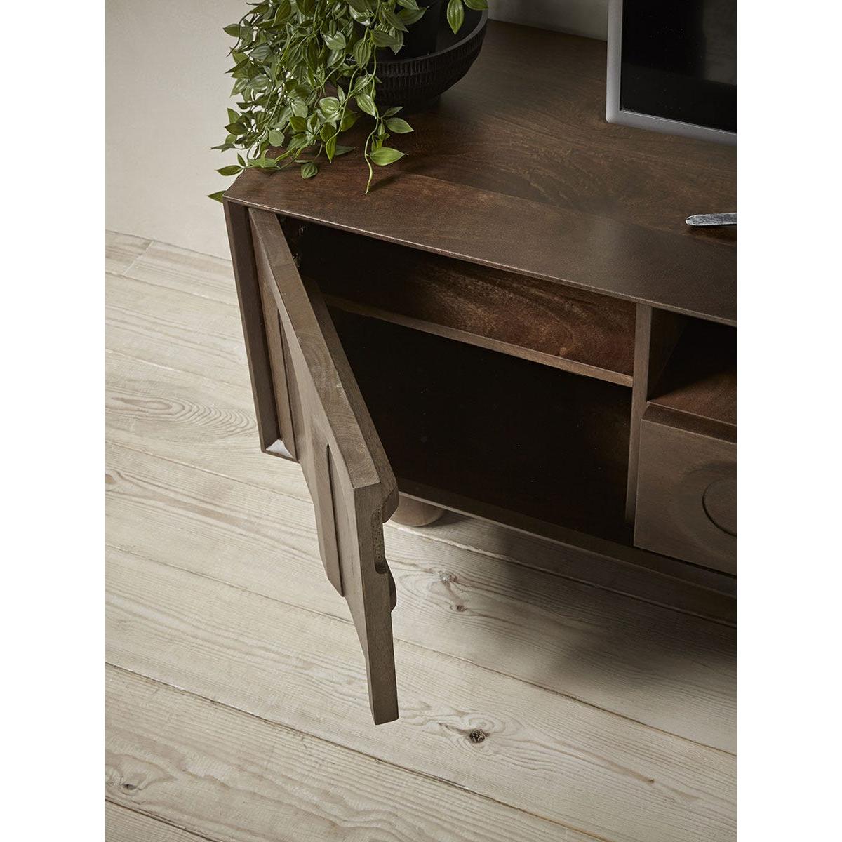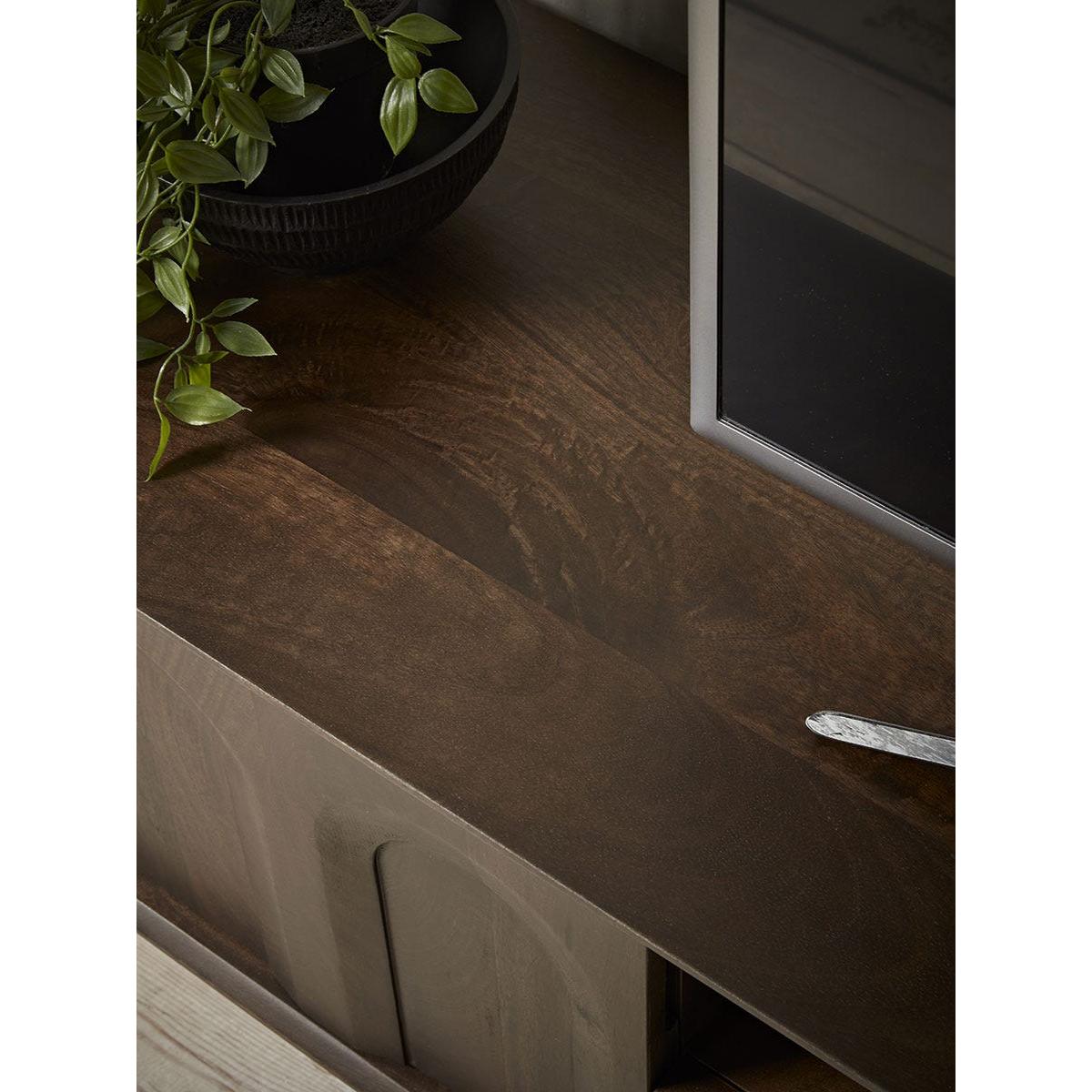 Made up of two cupboards and a drawer, our Teya media unit takes your living space beyond the ordinary. Crafted from a dark stained mango wood, soft arches in the doors and rounded ball feet work to add a 70s inspired style to your space for a timeless addition to your home. Also available as a sideboard, coffee table and console table.