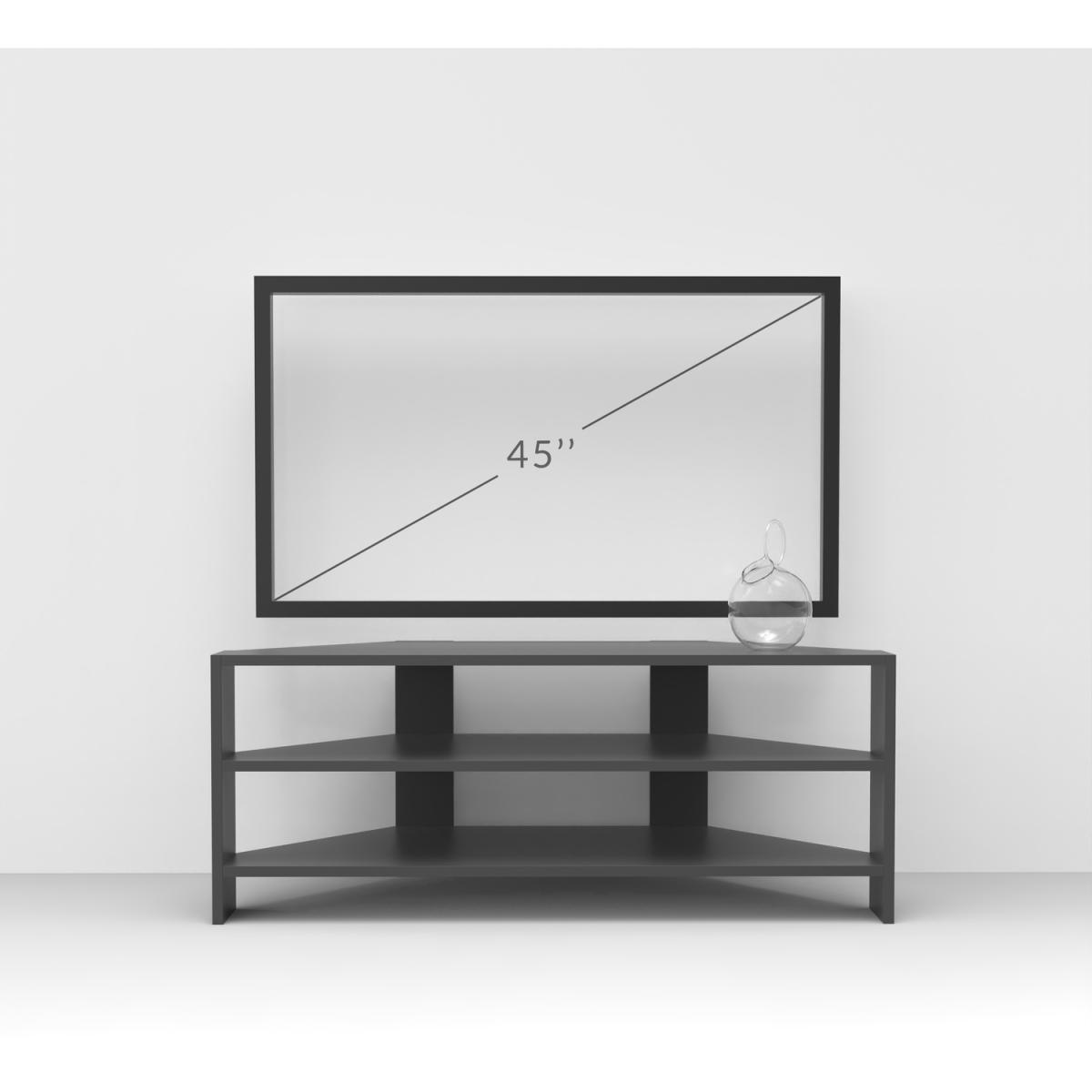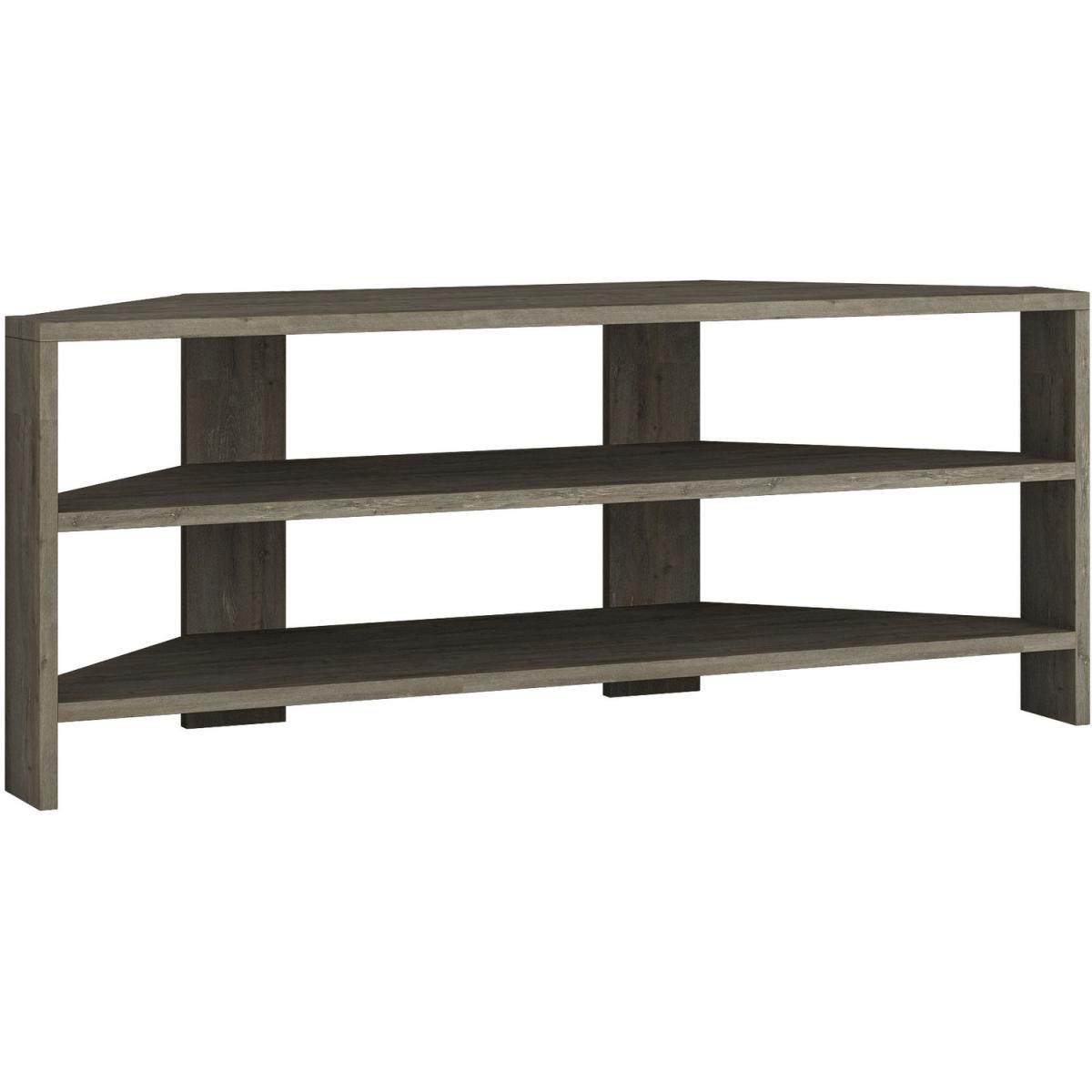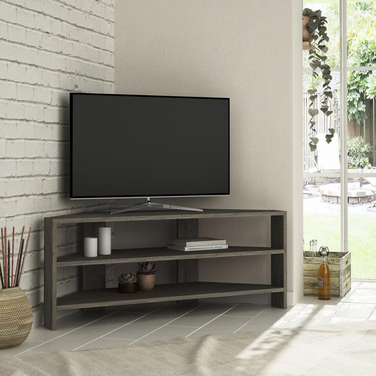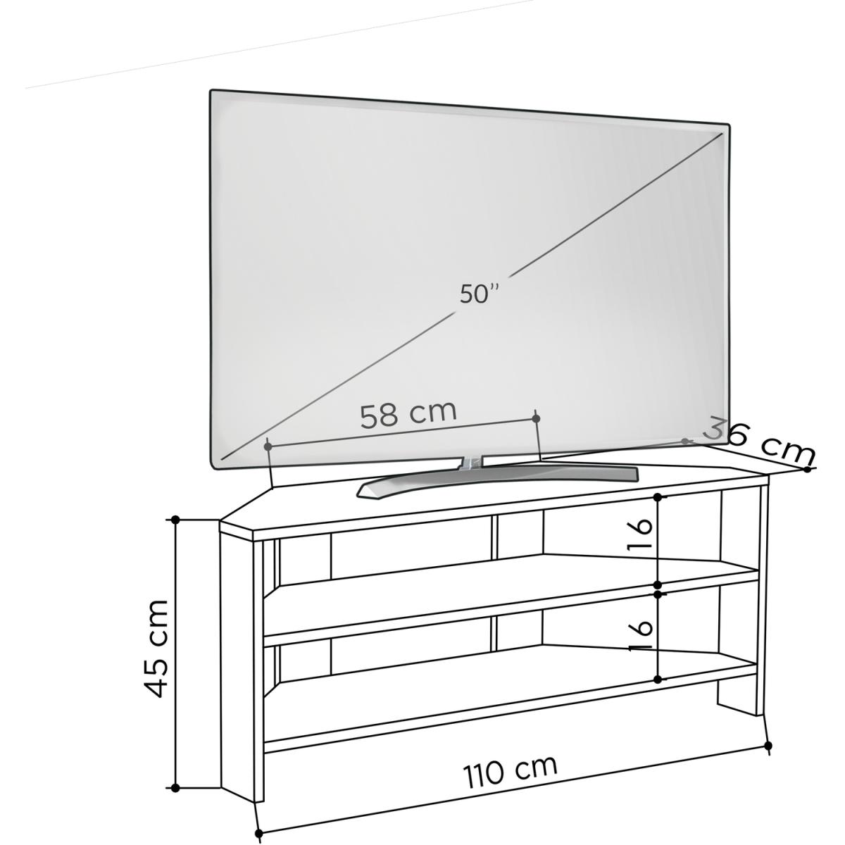 This 110 cm wide corner TV stand is the perfect addition to any living room. Its unique and modern design will add a touch of style to any space, while its spacious open shelves provide ample storage for your media devices. The TV stand is suitable for up to 43 inch TVs, making it a great option for any size of living room. The TV stand has a contemporary look that will complement any decor, and it comes in many color options, so you can easily find the perfect match for your space. It is constructed with durability in mind, ensuring it will last for years. The stand's clean lines and sleek design will bring a touch of sophistication to your living room while keeping your media devices organized and accessible.