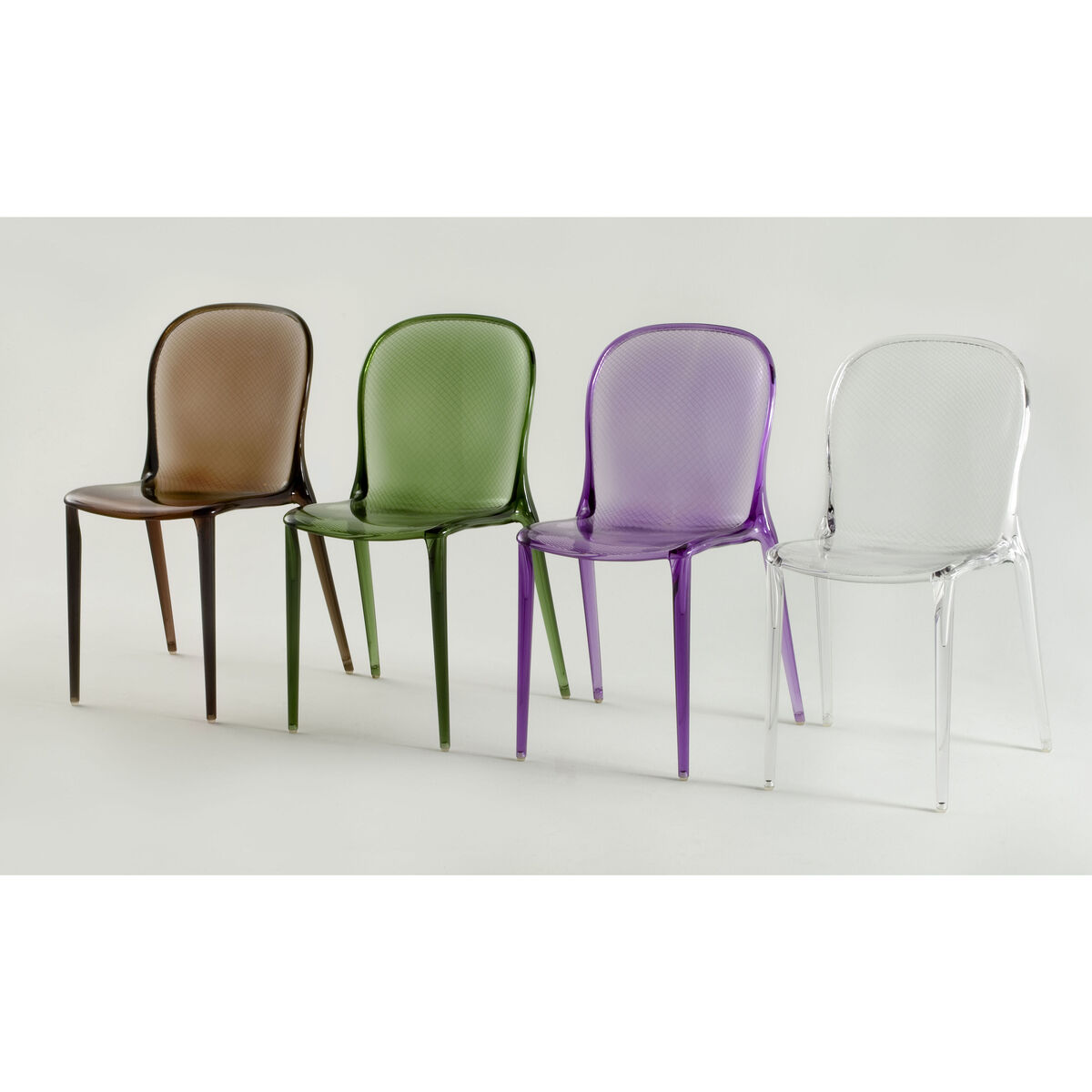 "Thalya boasts a surprisingly simple design with a strong graphic impact that captures the attention. It is a transparent or coloured polycarbonate chair made using gas injection moulding. Its particular manufacturing process allows the surface to be incised with a pattern of irregular vertical and horizontal stripes covering the entire back of the seat and the backrest. The lines are gentle, with rounded corners, creating an "almost feminine" form. ".