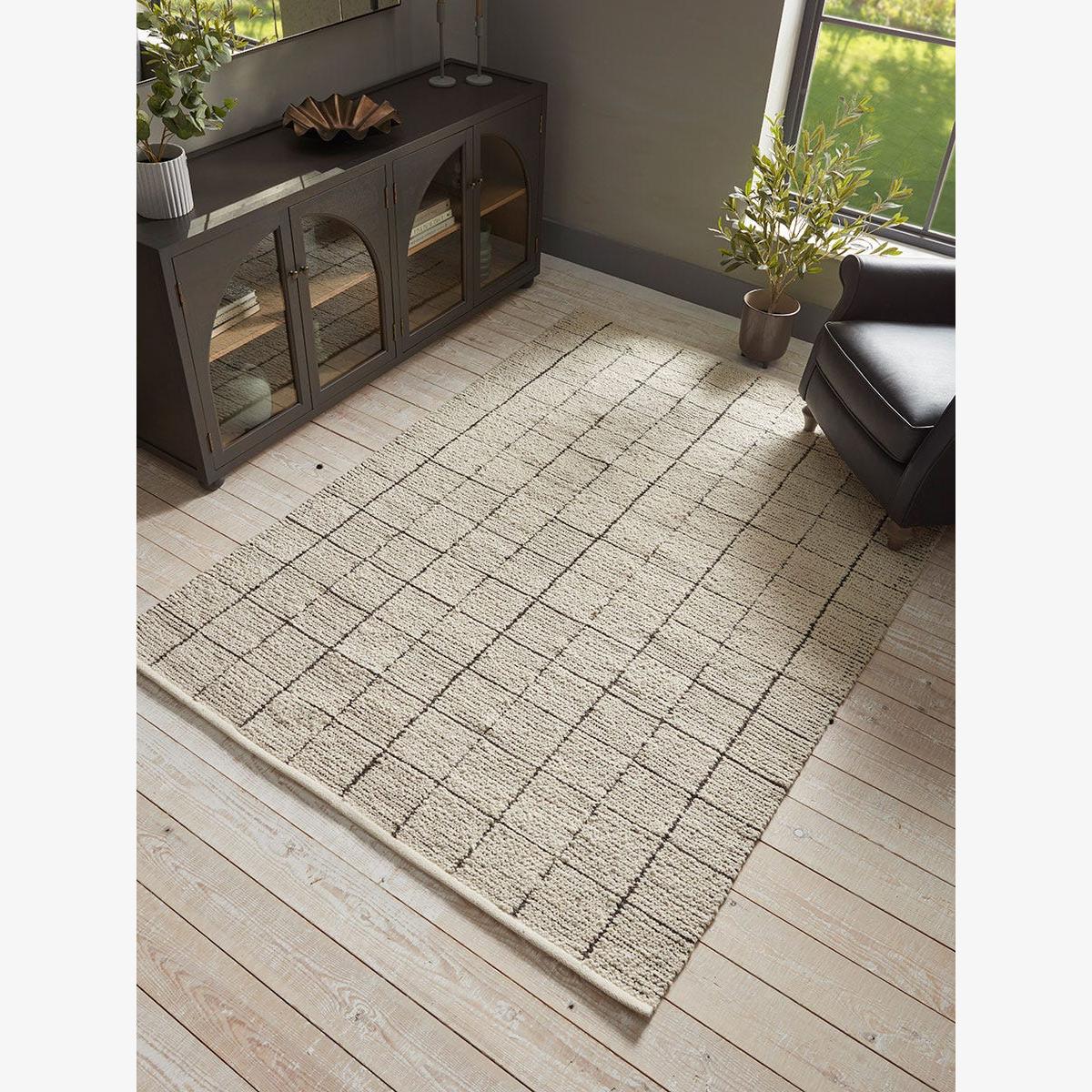 Woven in a sumptuously soft fabric, our Thani Rug features a grid like pattern in a contrasting charcoal colour. The delicately crafted pattern creates a rug that is minimal in style, and works perfectly in our industrial trend for a more modern interior style. Cosy and snug underfoot, place this rug in your living room or bedroom for an added level of luxury in your home.