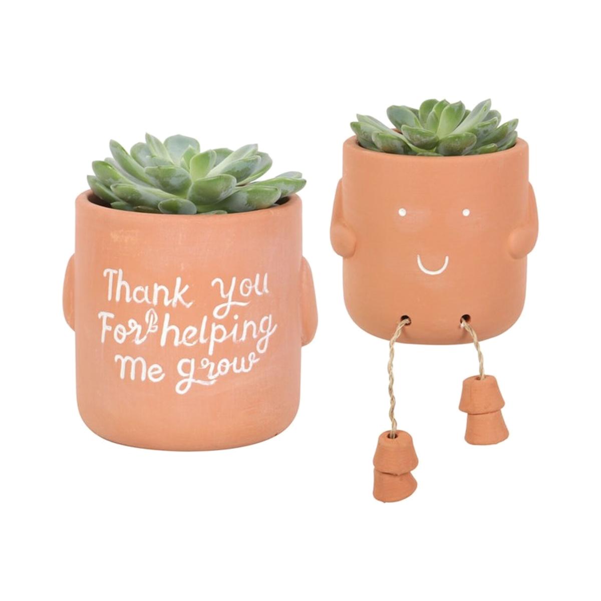 This quirky plant pot will be a welcome companion to any small house plant. Features adorable dangly legs that sit perfectly over a shelf or ledge and 'Thank you for helping me grow' text on the back that's perfect for teacher gifts and more. Plant not included.