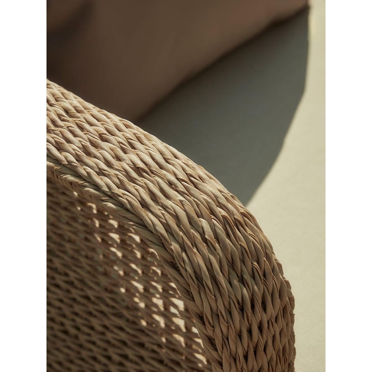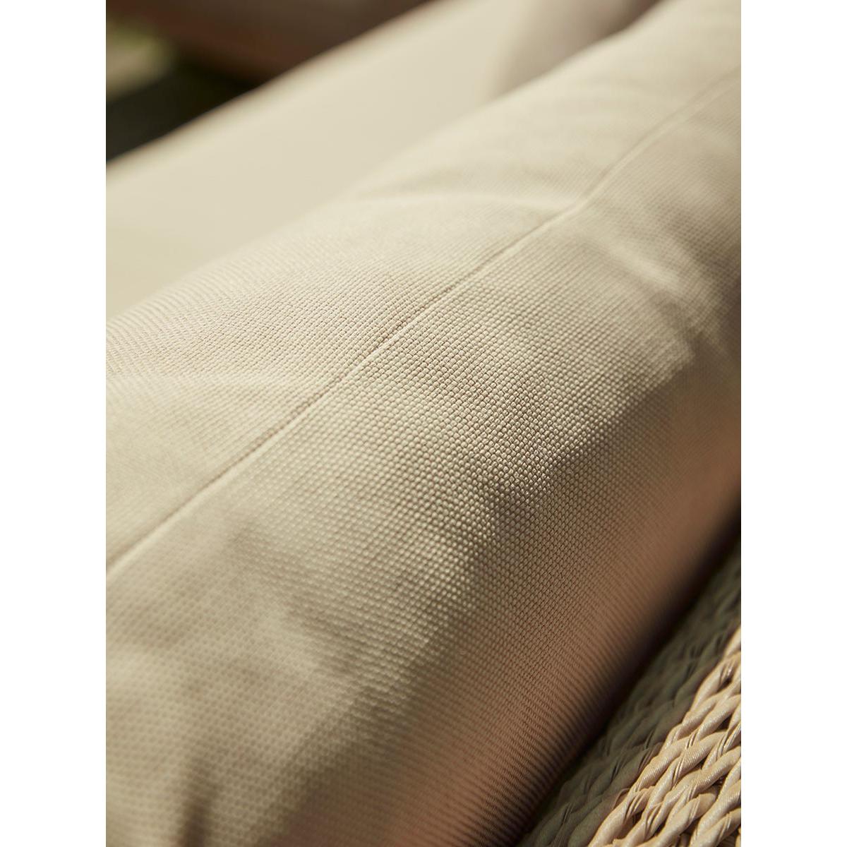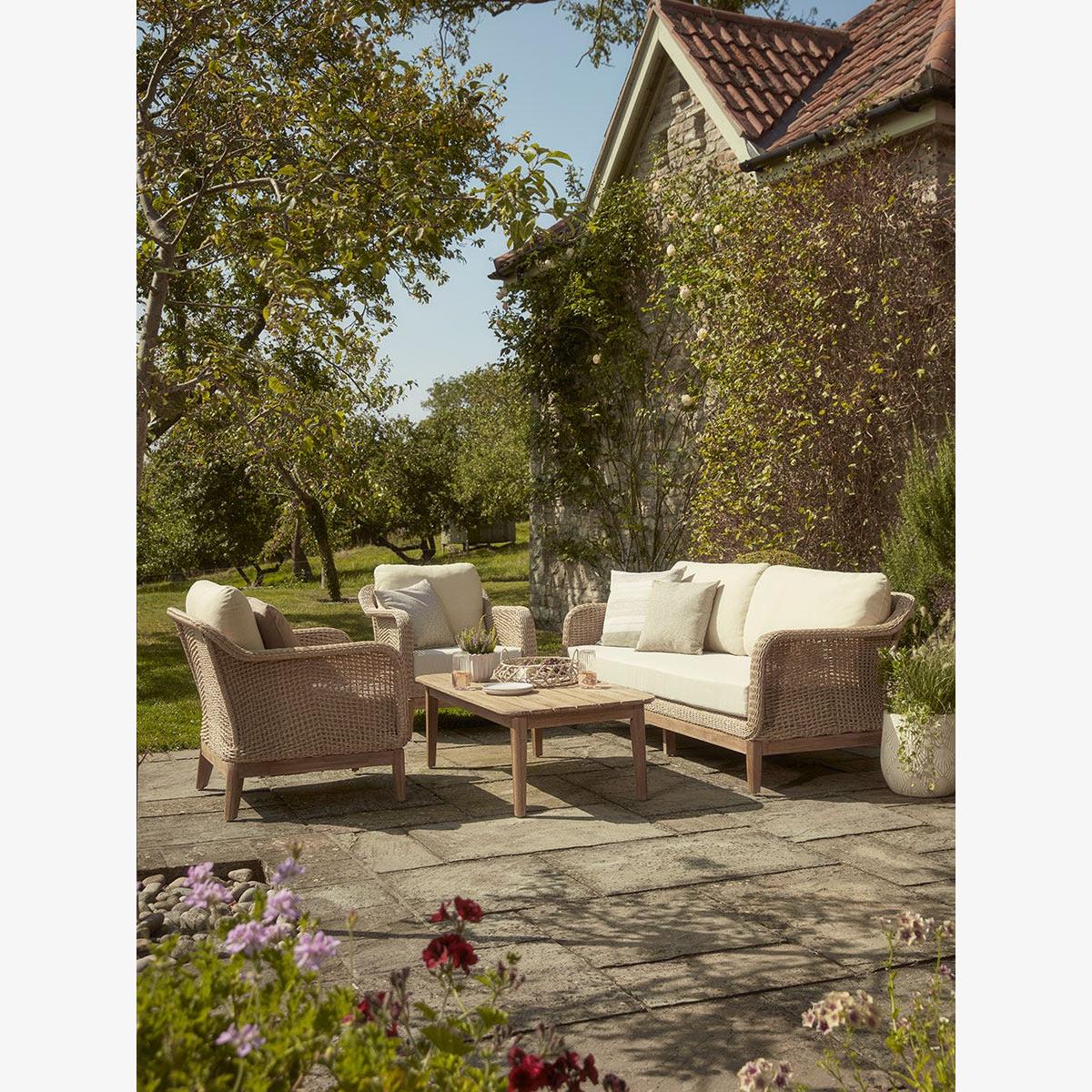 Soft and curvaceous edges crafted from a warm wicker create the frame of our Thasos Lounge Set. Perched on top of simple tapered legs, these match the table which is delicately crafted from acacia wood, with slats stretching horizontally across the table. Cushions are foam filled for the ultimate cosy feeling, and in a subtle neutral tone for a simple yet eye catching piece of furniture that adds a relaxed and comforting atmosphere to any garden.