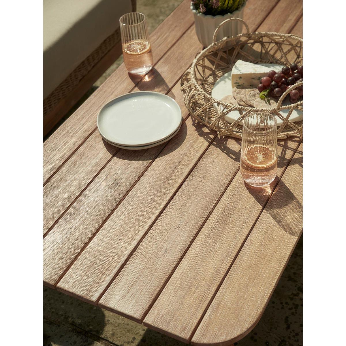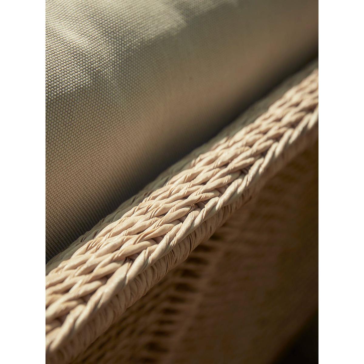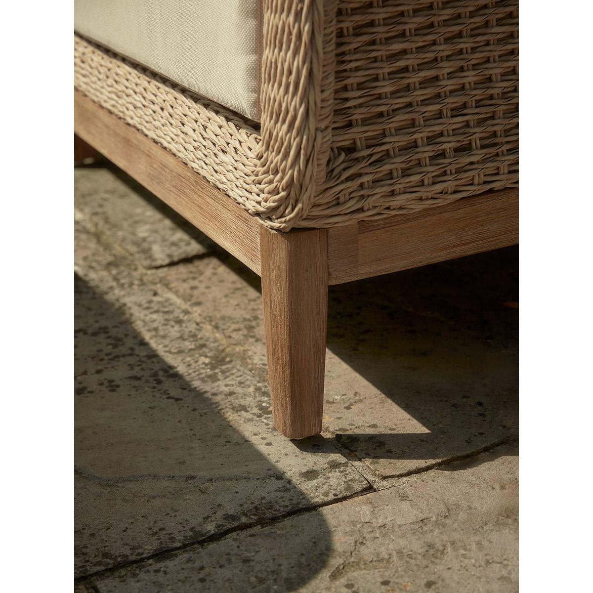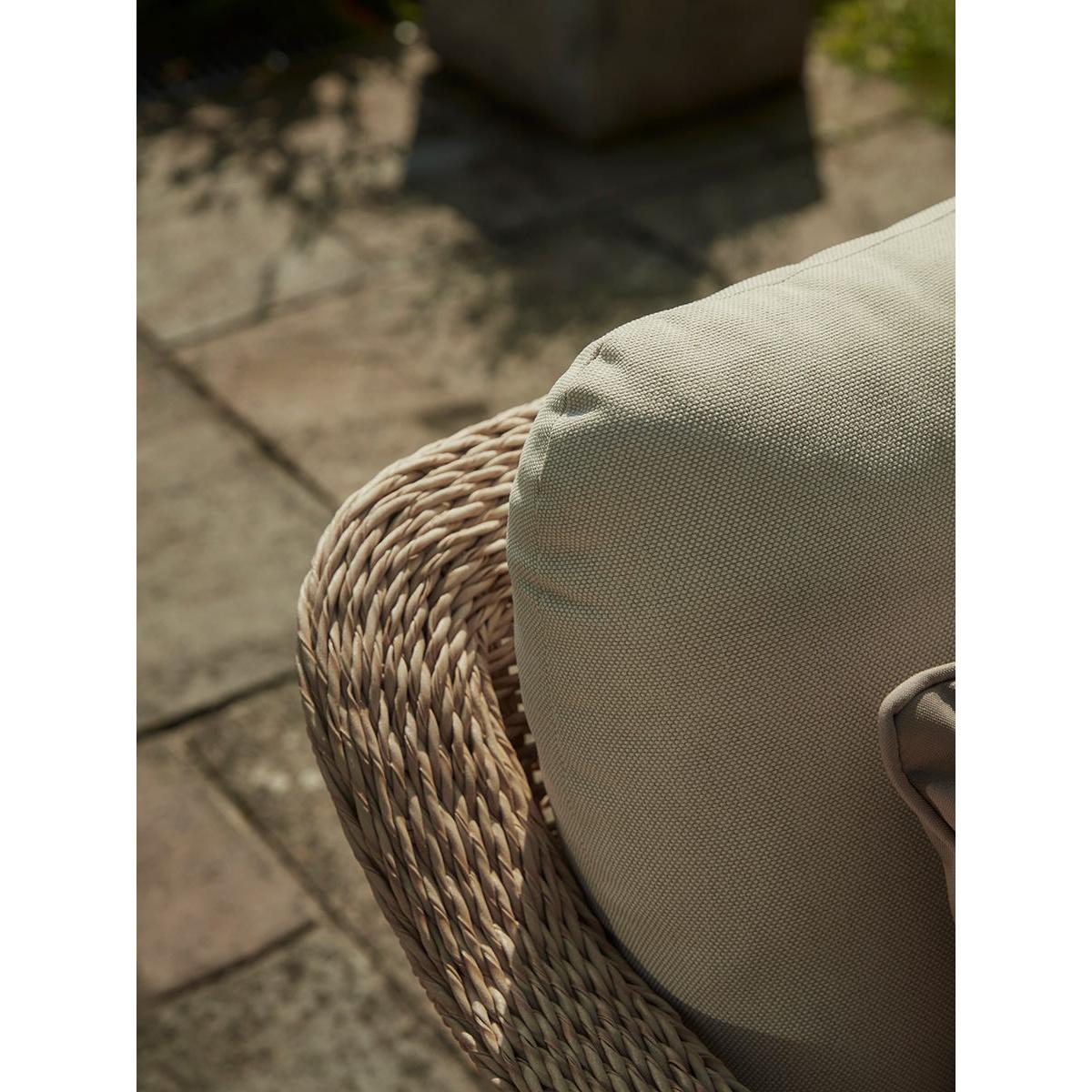Soft and curvaceous edges crafted from a warm wicker create the frame of our Thasos Lounge Set. Perched on top of simple tapered legs, these match the table which is delicately crafted from acacia wood, with slats stretching horizontally across the table. Cushions are foam filled for the ultimate cosy feeling, and in a subtle neutral tone for a simple yet eye catching piece of furniture that adds a relaxed and comforting atmosphere to any garden.
