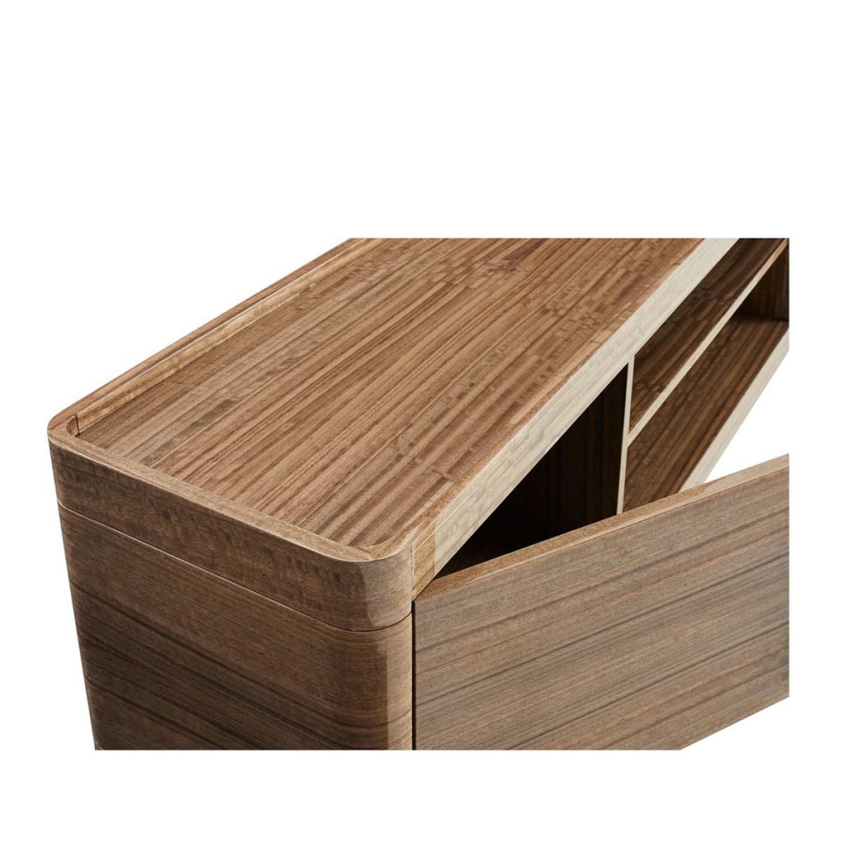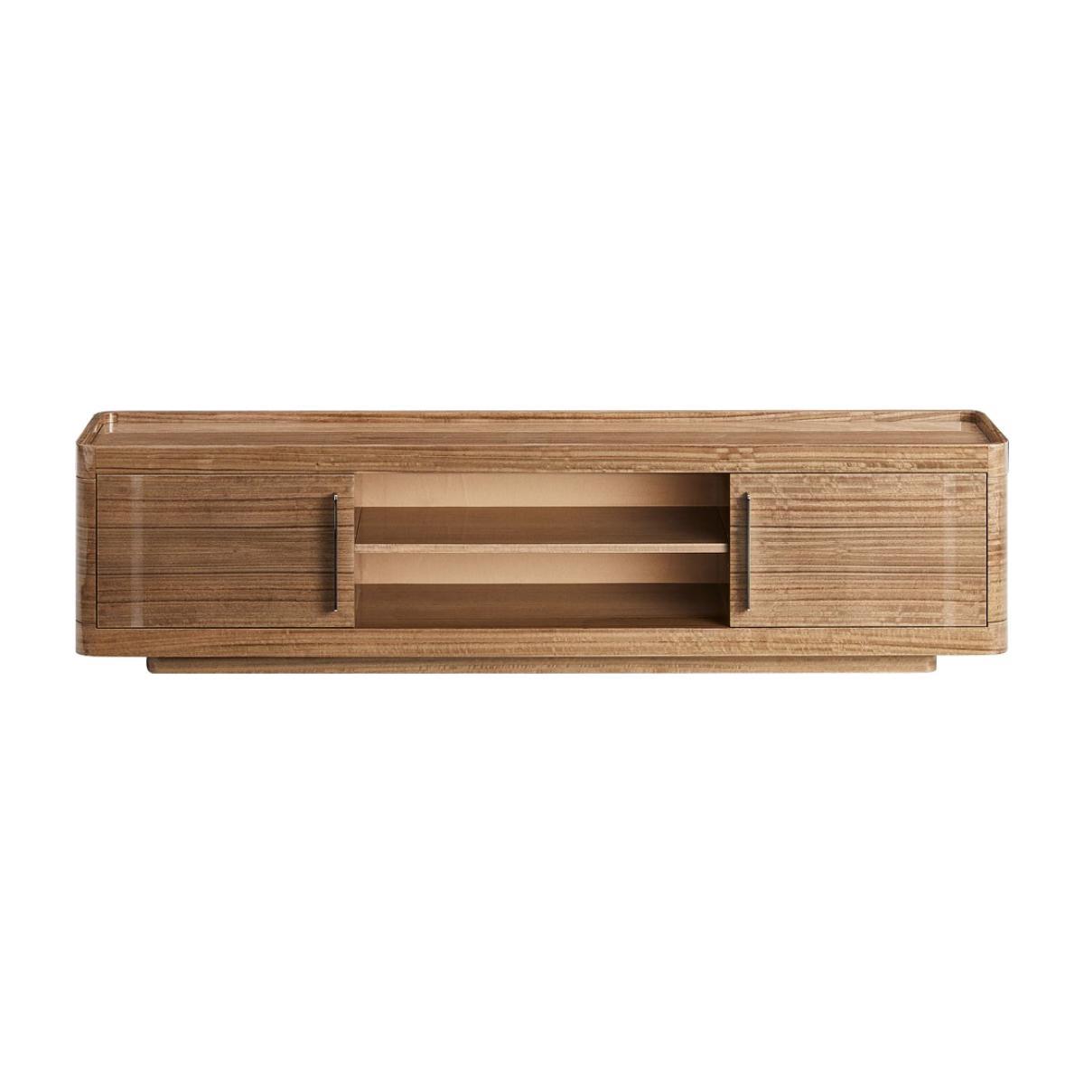 TV sideboard in wood veneer or lacquer. Upholstered doors and laterals. Metal handles.
