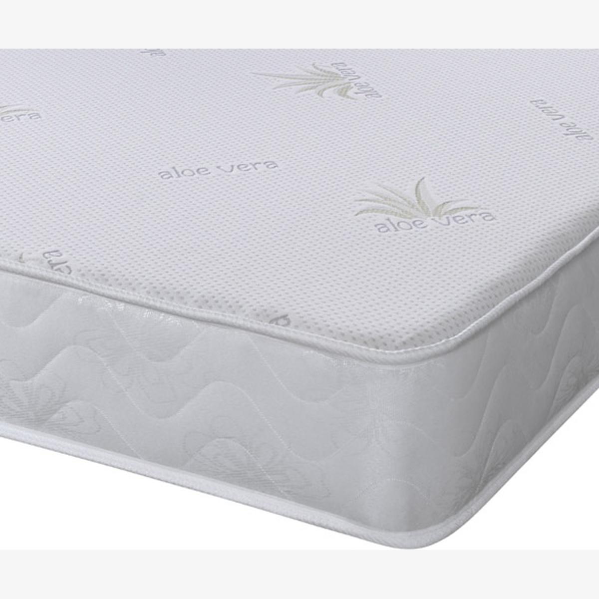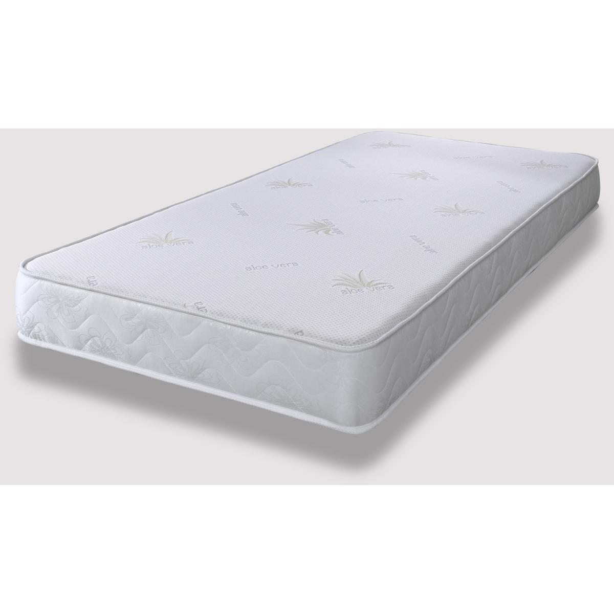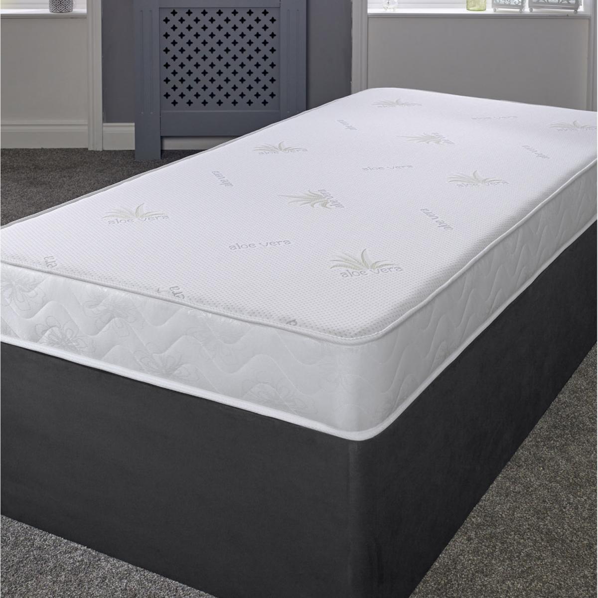 Great for bunk beds, cabin beds, day beds etc etc. Please do check the size of your base before ordering as these will be difficult for you to return.brbr. This is our Aloe Vera Essentials White Border Flat Top 17cm Deep Basic Hybrid Mattress. It has a double insulated European engineered open coil Bonnell spring unit with deep polyester comfort fillings (75 minimum recycled content), a layer of high density visco-elastic memory foam and an Aloe Vera Flat Top. It has a white wavy design border and is 17cm deep. Ideal as a spare room mattress, great for kids or those on a budget, it is a medium soft feel mattress containing springs, comfort layers and a layer of high density visco-elastic memory foam with a single sleeping side. You should rotate your mattress regularly to get the best from it.brbr. These are UK made mattresses, produced in our West Yorkshire factory and are fully compliant with all relevant UK fire safety regulations for domestic use.brbr. We compress, vacuum pack and roll these mattresses so that they can be delivered quickly and cheaply to your door. You will need to allow a few hours after opening for your mattress to regain its shape and size. As these are produced with fresh, new memory foam, you may need to air in a dry, well ventilated room, for up to 24 hours prior to use.