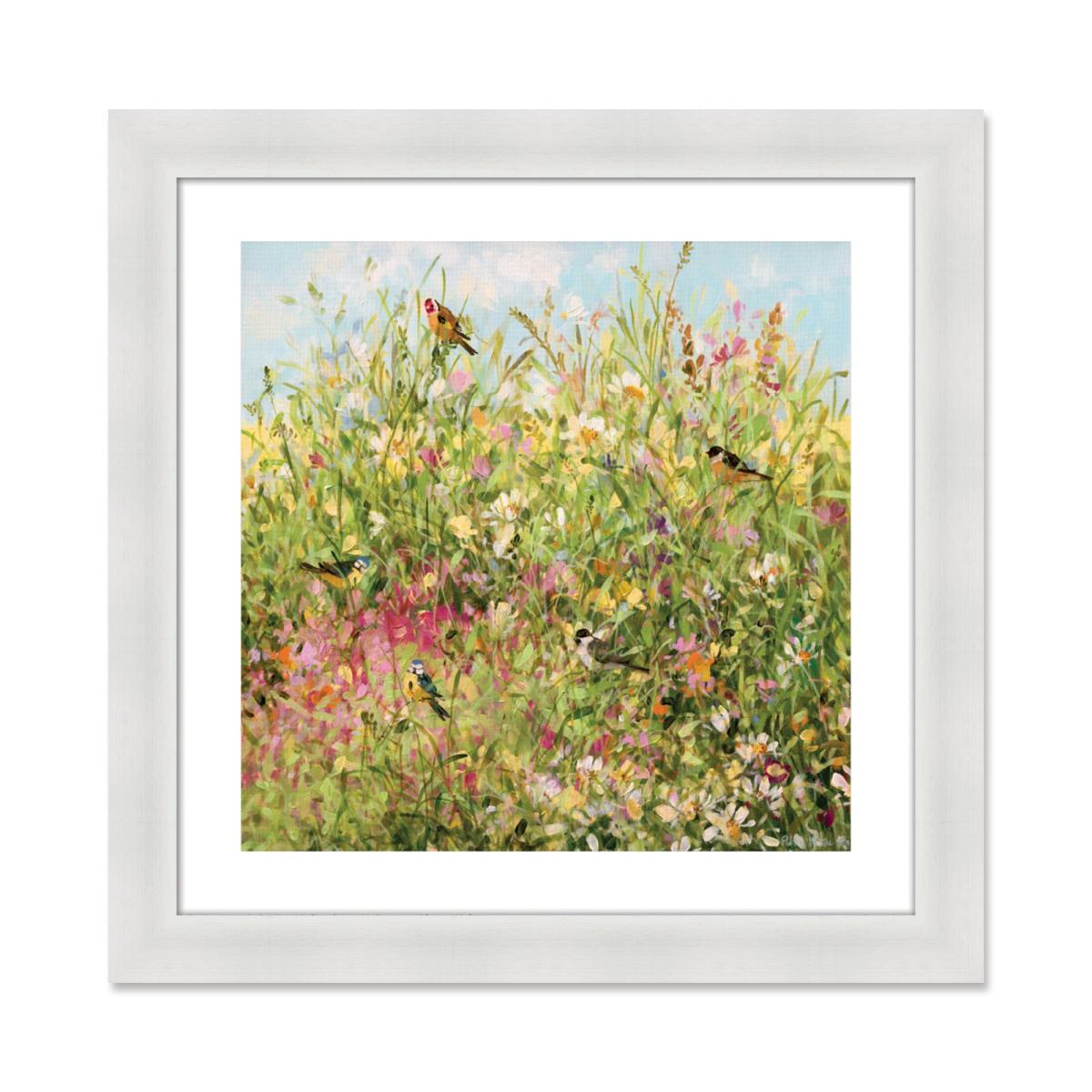 Do you love nature? This framed print encapsulates a floral scene with birds resting amongst the foliage.
