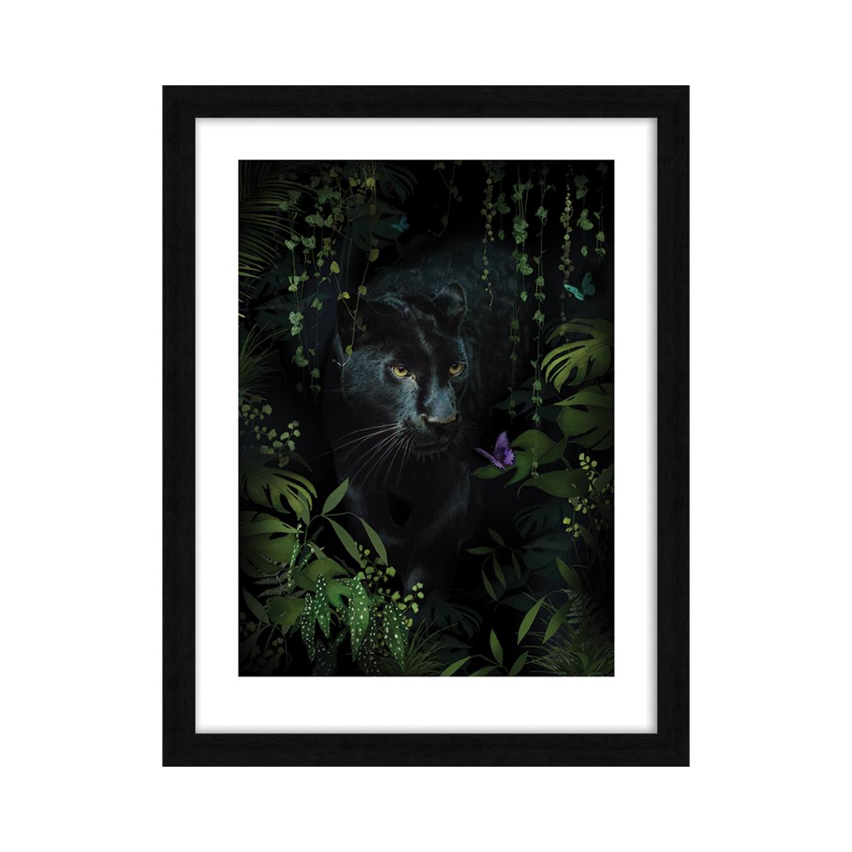The black panther in this image is perching amongst jungle foliage and will look great hung on your wall.