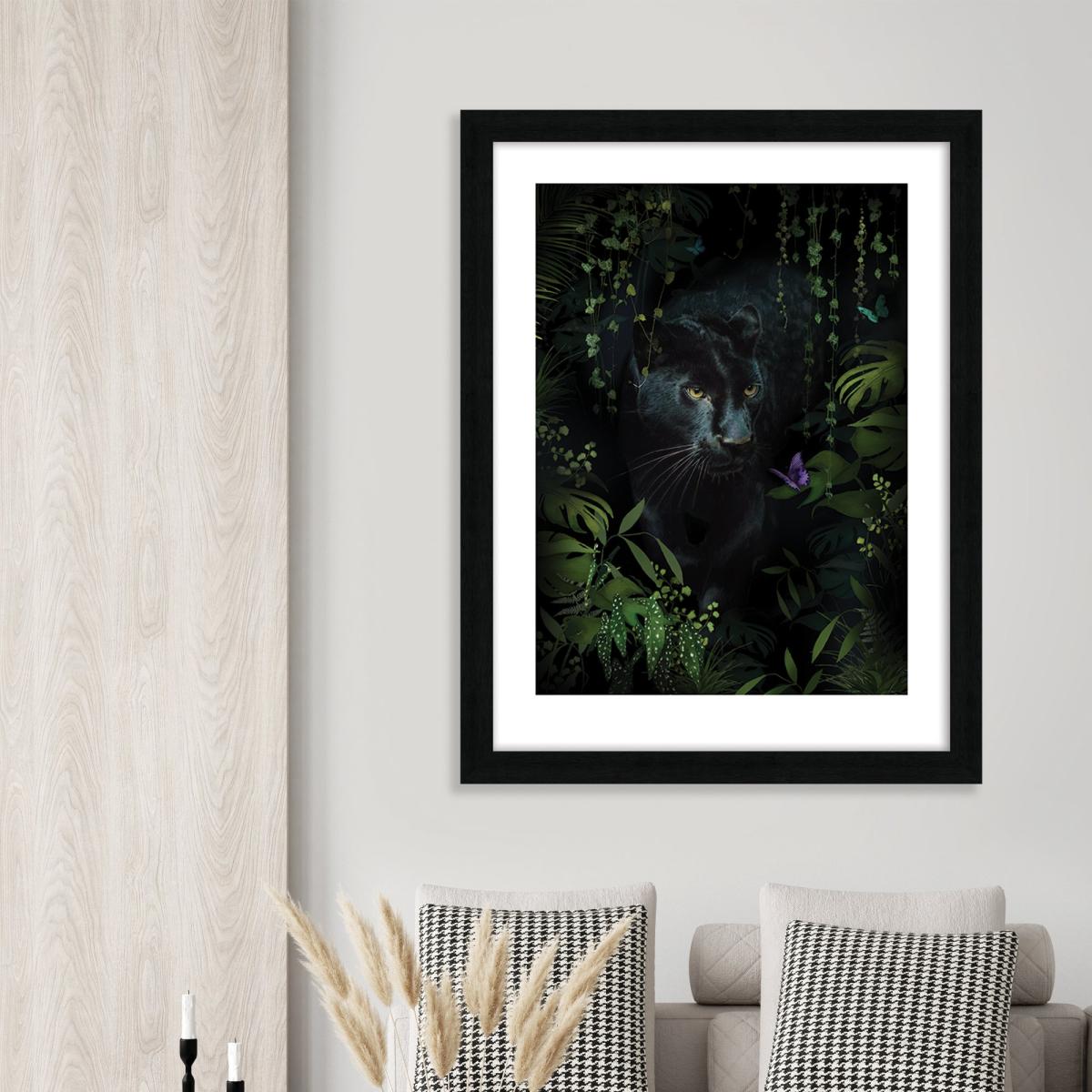I love this black panther print for its striking, bold presence. It works well in contemporary or minimalist interiors, adding a touch of drama without overwhelming the space. Placing it as a focal point on a neutral wall can really highlight its impact, especially over a sofa or in a living room where you want to create a modern, sophisticated vibe. For styling tips, consider pairing it with sleek black or dark wood furniture to enhance its sleekness, or surround it with softer textures like velvet cushions to balance the intensity. It’s a versatile piece that can elevate a variety of rooms, providing both colour depth and visual interest.