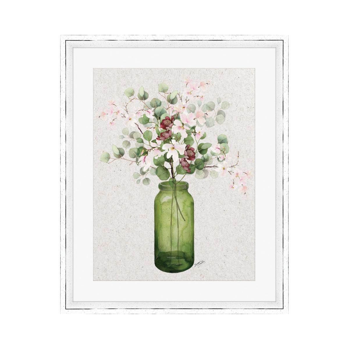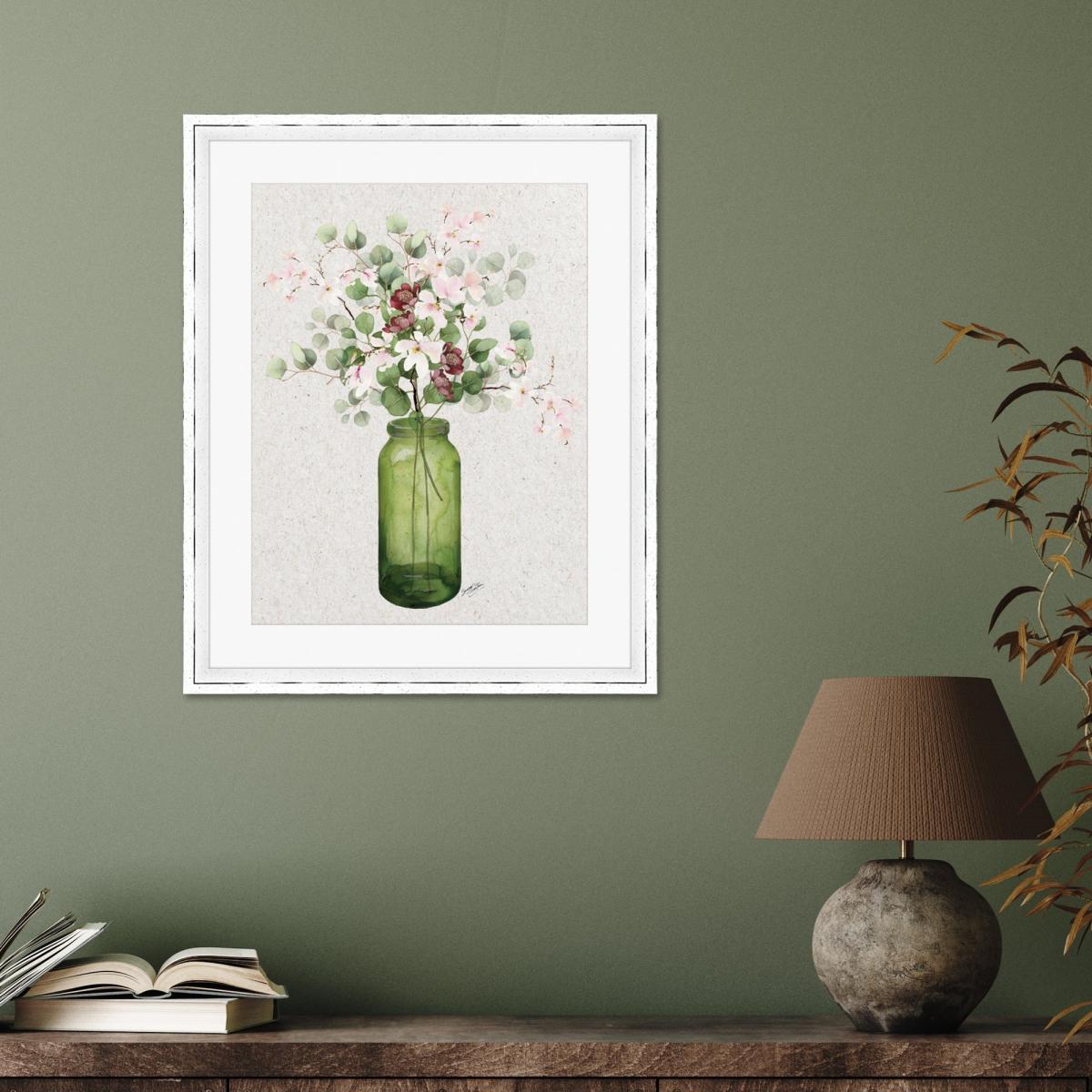 I love this print’s fresh green tone and delicate floral detail - it adds a touch of nature’s calm to any space. It works particularly well in relaxed, contemporary interiors, especially those with neutral or muted colour schemes, to introduce a hint of colour without overpowering. For practical styling, consider pairing it with tactile textures like linen or wicker to enhance its natural theme. You could also lean it against a shelf or place it above a sideboard to create a focal point. To keep the look cohesive, match your accessories to the green shade or complement it with other botanical elements for a considered, effortless finish.