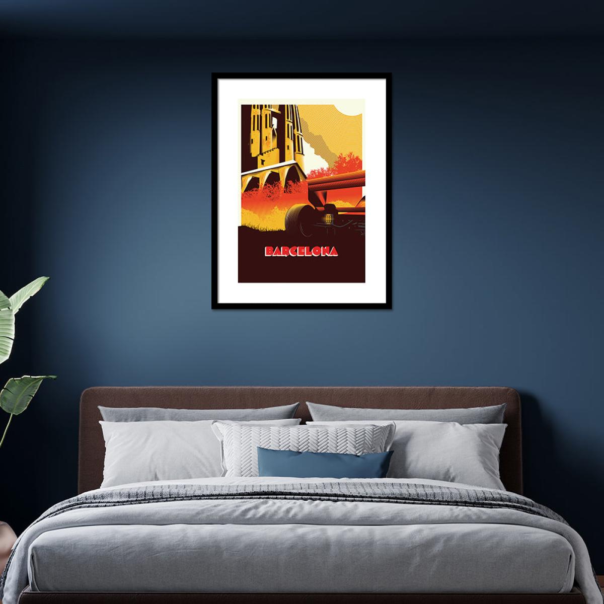 The Art Group Zoom F1 in Barcelona is a striking piece that works brilliantly in modern or eclectic interiors. Its bold colours and graphic style make it a statement, particularly in living rooms, offices, or hallways that benefit from a pop of colour and visual interest. I love how it balances vintage travel vibes with contemporary flair, making it versatile for various schemes. For styling tips, consider pairing it with minimalist furniture to let the artwork stand out, or coordinate with other warm-toned accessories to create a cohesive look. Its frameless pre-fitted design makes it easy to hang straight away, adding an instant boost of character to any space.