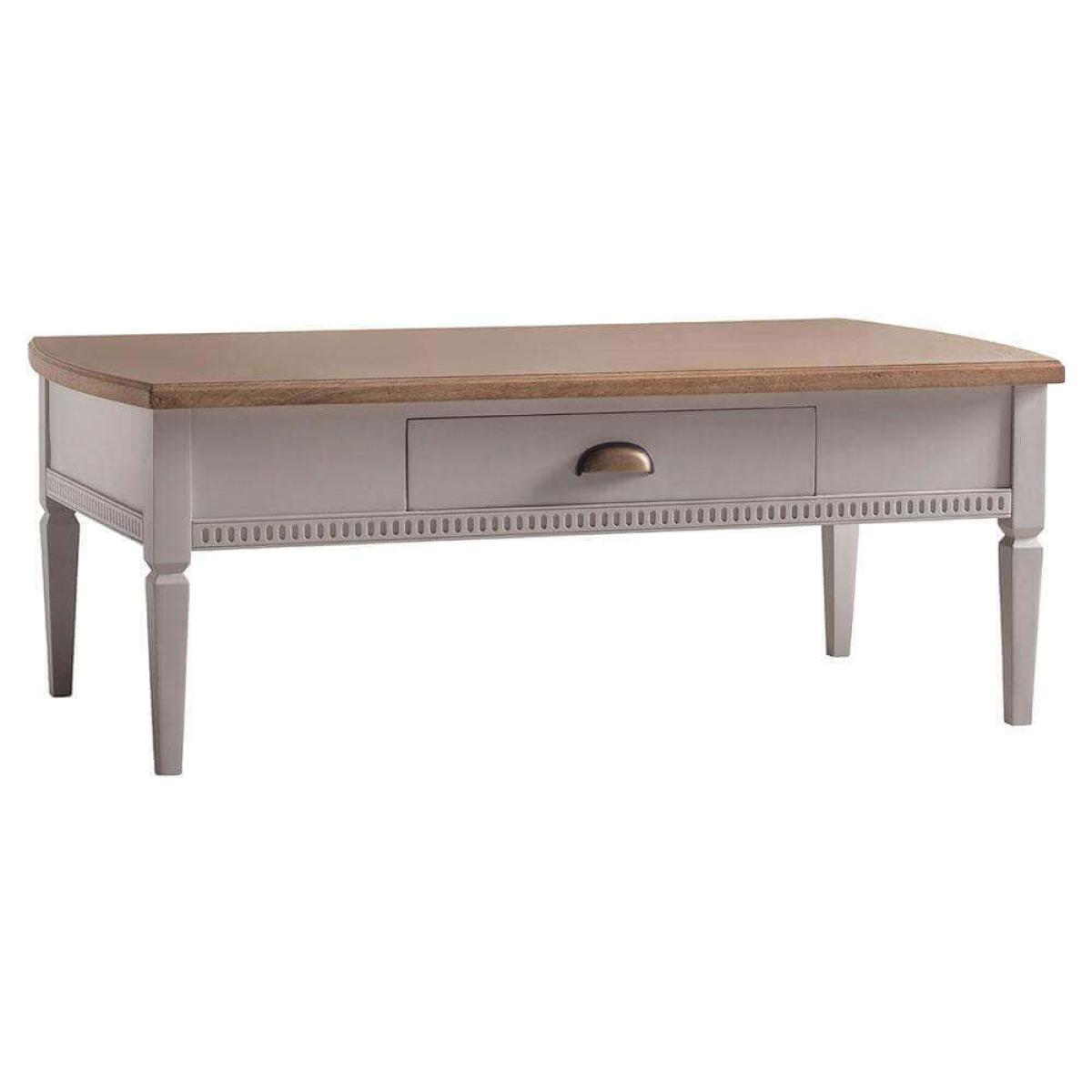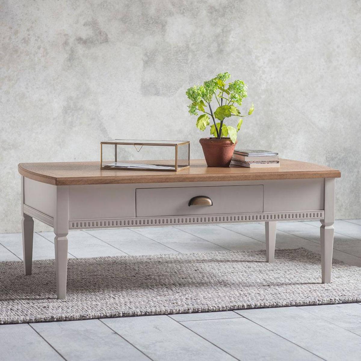 The Atlantic 1 drawer coffee table is the perfect addition to any sitting room. The taupe colour used in this range means it is highly versatile and would go with any décor. It would look beautiful paired with other netural colours and wooden furniture, but equally could look striking amongst more modern, bolder colours and raw, dark materials. The parquet oak table top is hardwearing and so an excellent choice for a coffee table. It provides a good surface area for a few finishing touches and the drawer not only adds a bit of a design detail, but comes in very useful for stashing things like remote controls, tv guides and other bits and bobs you want within reach when on the sofa.