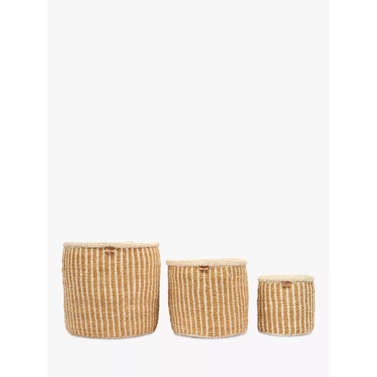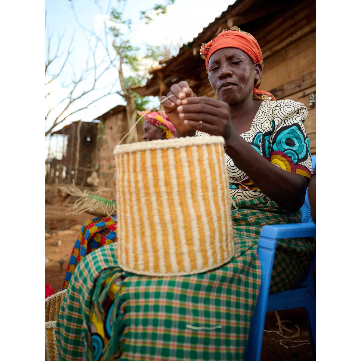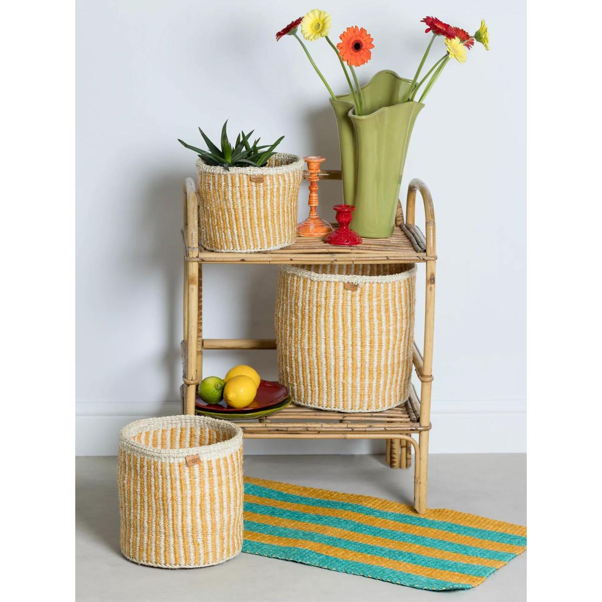 Consciously created in Kenya, by experienced craftswomen in rural zones, this multipurpose storage basket brings natural colour to contemporary living spaces, with gold pinstripes against an organic sisal base. A genuine leather tab adds the finishing touch. Use it as a woven plant pot, a floor basket for blankets and throws, a toy basket to tidy children’s bedrooms or simply a stylish storage basket for shelves. It’s ethical, sustainable, and beautifully handmade - the perfect sisal basket gift. Please note that as a handmade product, dimensions and colours may vary from those in the image.