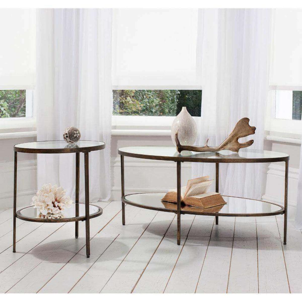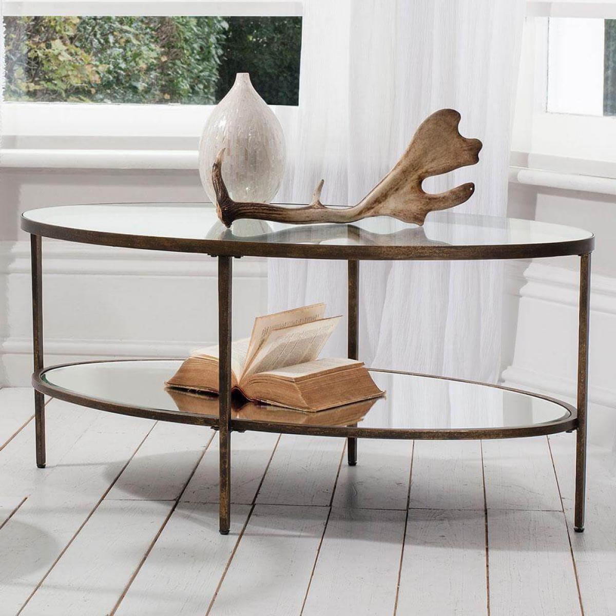 Free delivery on a day of your choice, within 2 – 5 working days!. The Bronze coffee table is the only one of its shape in our whole range. The oval coffee table is an excellent addition to any sitting room. The oval shape ensures there is a sufficient surface area but is more slimline and therefore takes up less space than its round counterpart would. The clear tempered glass used for the table top and shelving is particularly good at creating the feeling of space, so would be a smart move for slightly smaller living rooms too. See through glass and aged, mat bronze creates a classic combination that would go with any décor and sofa style and would also look brilliant placed alongside some occasional seating.