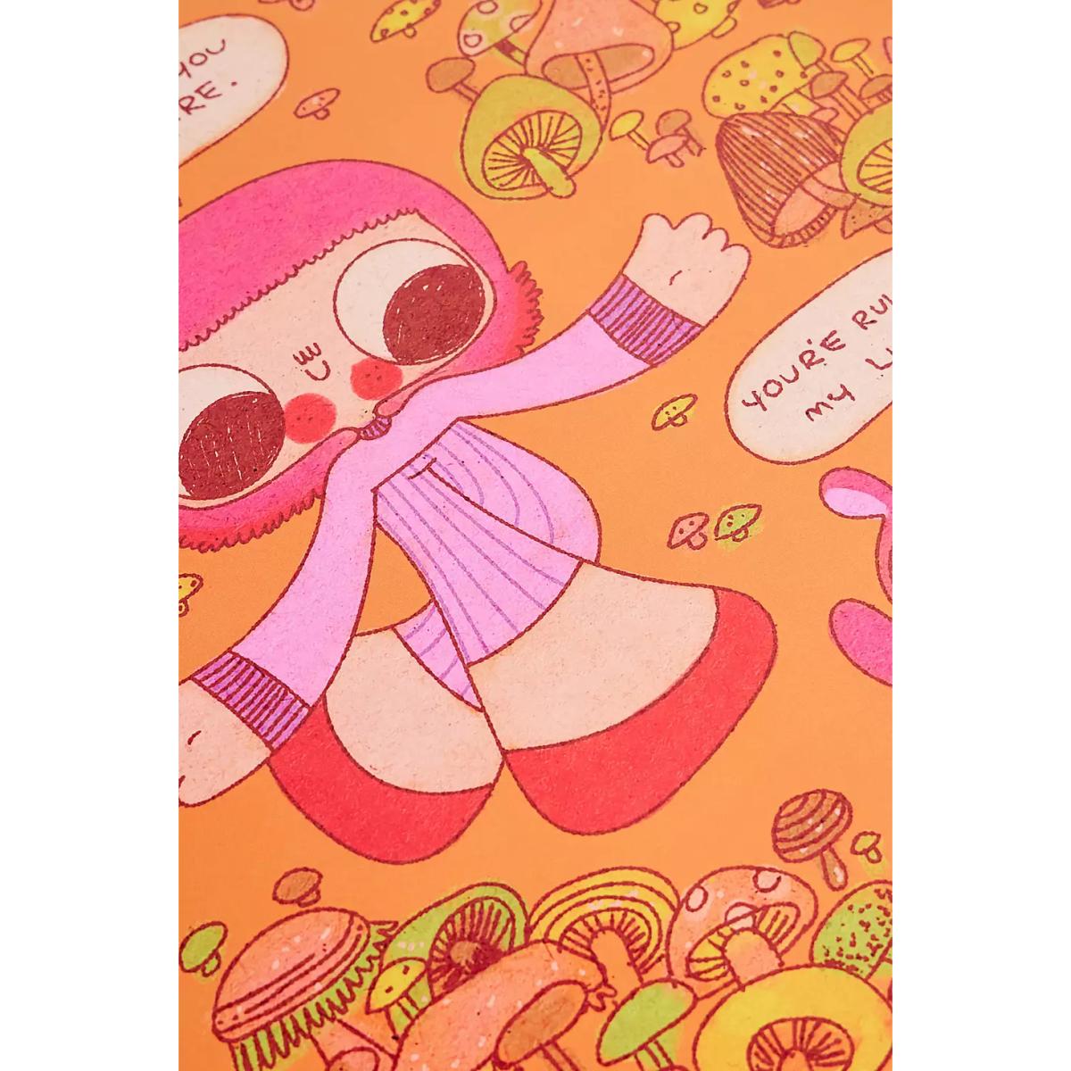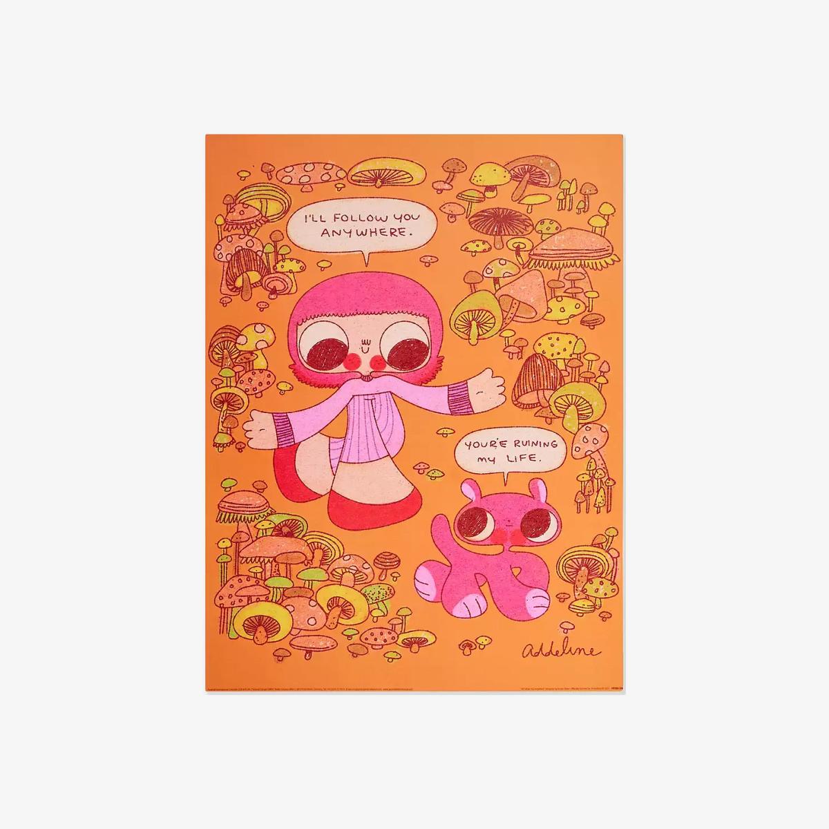 Vibrant wall art print from THE BURGERBABIE. Humorous design with cute mushroom motifs, a character and her pet and text 'I'll follow you anywhere' with the response 'You're ruining my life'. *Online return only. This item cannot be returned in store* **About Urban Renewal One-Of-A-Kind** \- One-of-a-kind pieces are handpicked vintage pieces from all over the map \- Carefully selected original vintage pieces, no two are exactly alike \- Each piece is unique – we only have one available, so once it’s gone it’s gone! **Content** \- Paper **Size** \- 30cm x 40cm