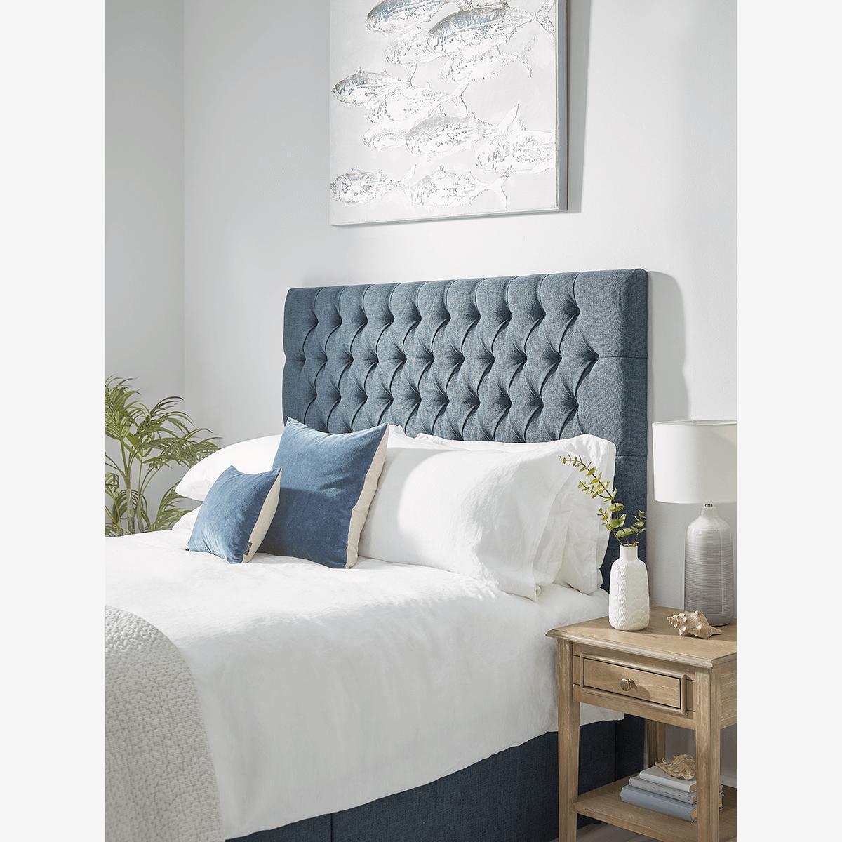 I love this buttoned headboard in navy for its classic yet contemporary appeal. The deep hue adds a sophisticated touch while offering versatility across different interiors, from modern minimalist to more traditional schemes. It works particularly well in neutral, calm bedrooms, where it can act as a striking focal point or pair seamlessly with soft greys, whites, or even blush for a layered look. Practical styling tips include layering with textured cushions and throws for added comfort and visual interest, or balancing its bold colour with light wood or metal accents to keep the space feeling fresh and inviting. It’s a practical choice that elevates the overall aesthetic without overwhelming, making it a smart investment for a stylish, timeless bedroom.