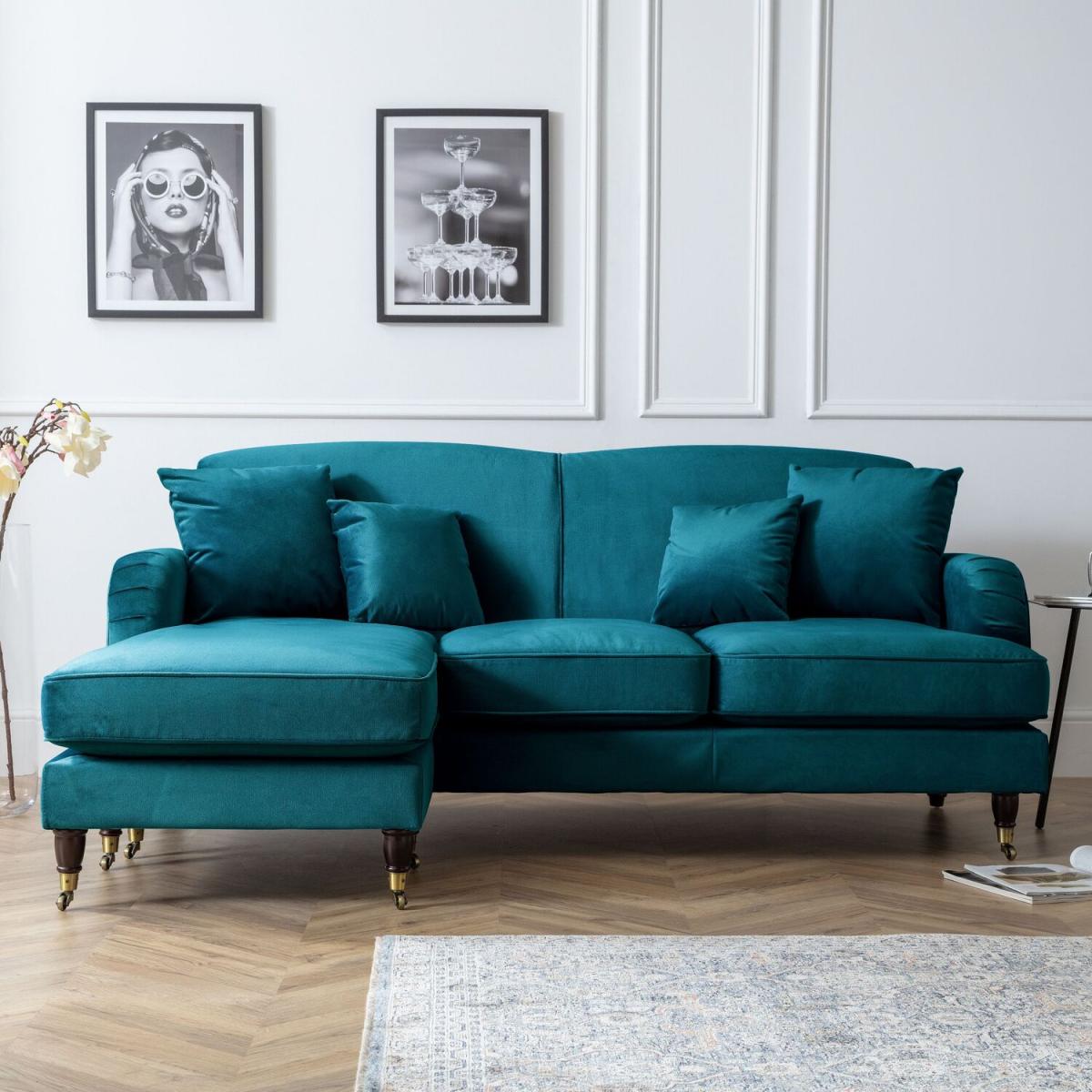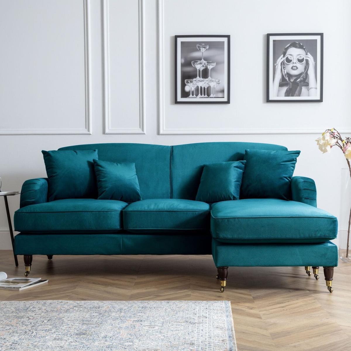I love the navy peacock fabric of this corner sofa - it adds a rich, timeless touch to any living space. It's a versatile piece that works well in both modern and traditional interiors, especially when paired with lighter or neutral accessories to make the colour pop. For styling tips, consider adding accent cushions in contrasting textures or metallics to create visual interest. This sofa's shape is perfect for larger rooms or open-plan spaces, and placing it against a patterned or textured rug can help ground the look. Keep the surrounding decor simple to let the sofa stand out, while soft lighting will enhance its sumptuous colour and velvet finish.