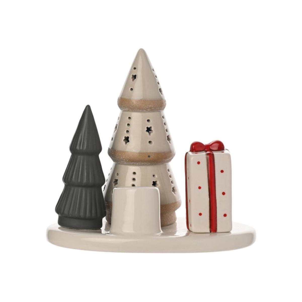 * Festive Christmas trees and present design * Tapered candle stick holder * Tall tree includes LED lights Bring a playful touch of Christmas charm to your home with this contemporary ceramic Christmas Candle Tray. Featuring two sculpted trees, a taper candle holder and a festive gift box, the arrangement sits on a smooth, neutral base designed to suit any modern interior. The taller tree includes star shaped cut outs that glow beautifully when paired with a candle, creating a warm and cosy seasonal atmosphere. Perfect for styling on a side table, shelf, or mantel, this compact piece adds instant holiday cheer with minimal effort.