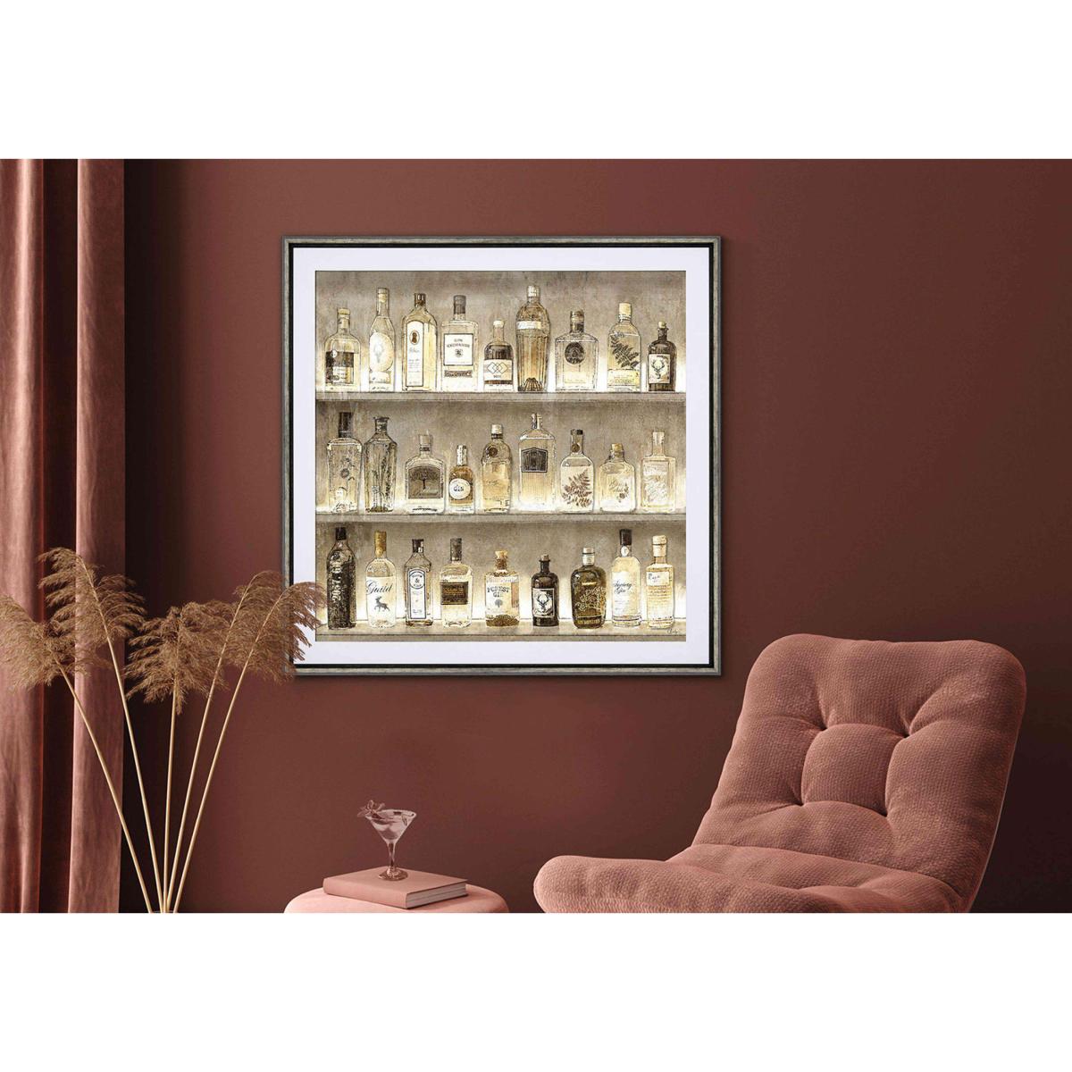 With its multitude of gin bottle shapes and labels arranged on three shelves, The Connoisseur framed picture is an atmospheric interpretation of a Prohibition-era bar. Why you'll love it Any gin aficionado will love The Connoisseur framed picture. Vintage style reminds us of the Prohibition era. Creative collage effect. Silver paper is used to create a textured, multi-layered design. Sophisticated tonal palette suits all decors. Presented in a gold-coloured metallic frame. Designed in the UK. This framed picture is part of the Furniture Village wall art collection. What you need to know Supplied with hanging fittings. Please follow the accompanying instructions. For indoor use only. Wipe clean with a dry cloth. Do not use detergents or cleaning products. Dimensions Height: 89 cm (35 in). Width: 89 cm (35 in).