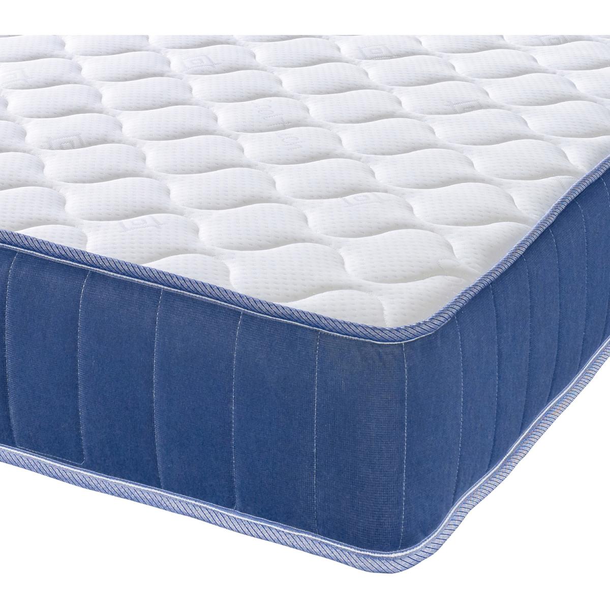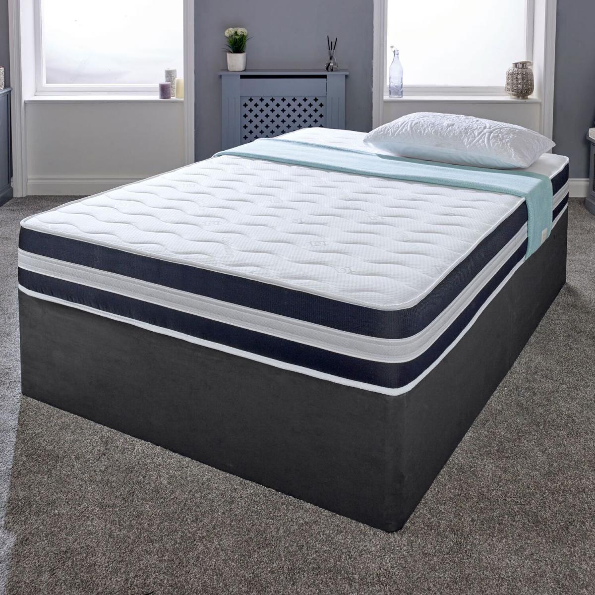 Deeper fill 22cm hybrid Airstream Memory Fibre and spring, everyday stylish quilted mattress suitable for all bed base types of the appropriate size. Please check the size of your base before ordering as these will be difficult for you to return. This is our Cool Touch Core B3 D Black & White Border 22cm Deep, Foam Free hybrid memory fibre and spring mattress. It has a double insulated European engineered open coil Bonnell spring unit with deep polyester comfort fillings (75 minimum recycled content), a layer of the revolutionary Airstream Memory Fibre and a Cool Touch Core quilted top panel with a black and white 3D border. The polyester comfort fillings and Airstream Memory Fibre are made from recycled plastics and unlike foams, it is 100% recyclable. Airstream Memory Fibre is designed to mimic the effects of memory foam without the associated heat discomfort often experienced with memory foam. Ideal as a spare room mattress, but also suitable for everyday use, it is a medium soft feel hybrid mattress containing springs, comfort layers and a quilted finish in a wave design. You should rotate your mattress regularly to get the best from it. These are UK-made mattresses, produced in our West Yorkshire factory and are fully compliant with all relevant UK fire safety regulations for domestic use. We compress, vacuum pack and roll these mattresses so that they can be delivered quickly and cheaply to your door. You will need to allow a few hours after opening for your mattress to regain its shape and size. This is a foam-free mattress.