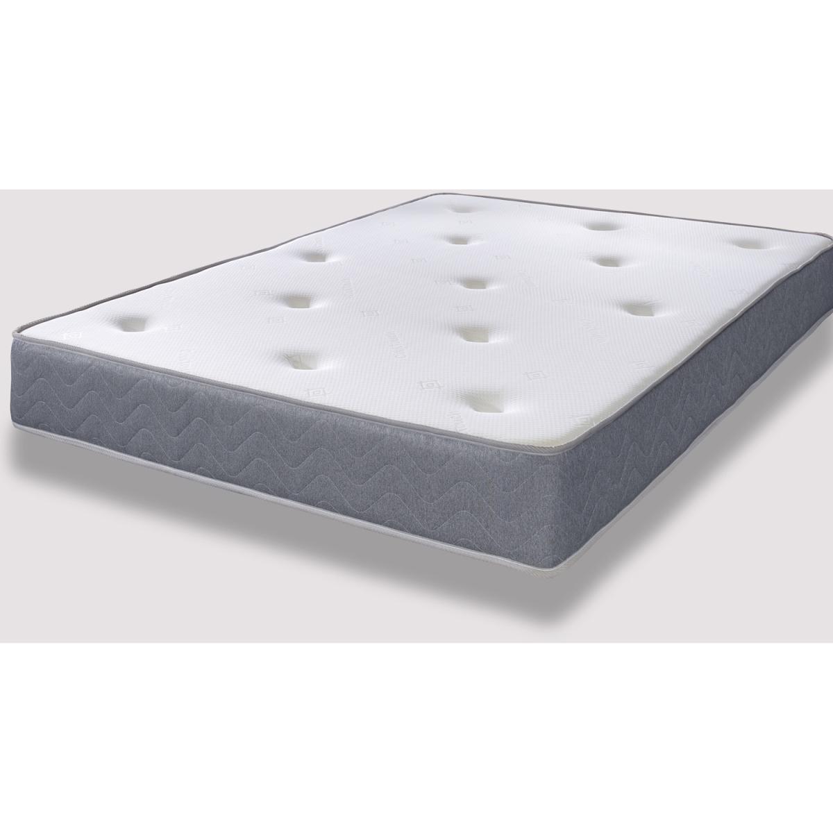 Fantastic value with memory foam everyday, stylish tufted mattress suitable for all bed base types of the appropriate size. Please do check the size of your base before ordering as these will be difficult for you to return. It has a double insulated European engineered open coil Bonnell spring unit with deep polyester comfort fillings (75 minimum recycled content), a layer of memory foam, and a Cool Touch Core hand-tufted top panel with a wavy grey border. Memory foam is a revolutionary new filling designed to mimic the effects of memory foam without the associated heat discomfort some sleepers experience. Ideal as a spare room mattress, but also suitable for everyday use, it is a medium soft feel mattress containing springs, comfort layers and a layer of memory foam with a single sleeping side and a hand-tufted finish to help keep fillings secure. You should rotate your mattress regularly to get the best from it. These are UK-made mattresses, produced in our West Yorkshire factory and are fully compliant with all relevant UK fire safety regulations for domestic use.brbr. We compress, vacuum pack and roll these mattresses so that they can be delivered quickly and cheaply to your door. You will need to allow a few hours after opening for your mattress to regain its shape and size. This is a foam-free mattress.