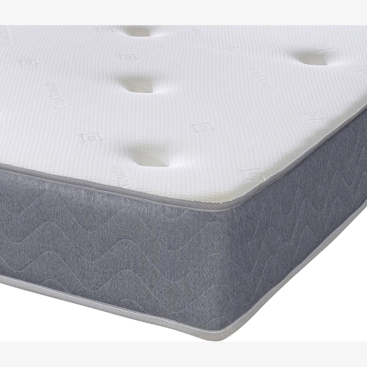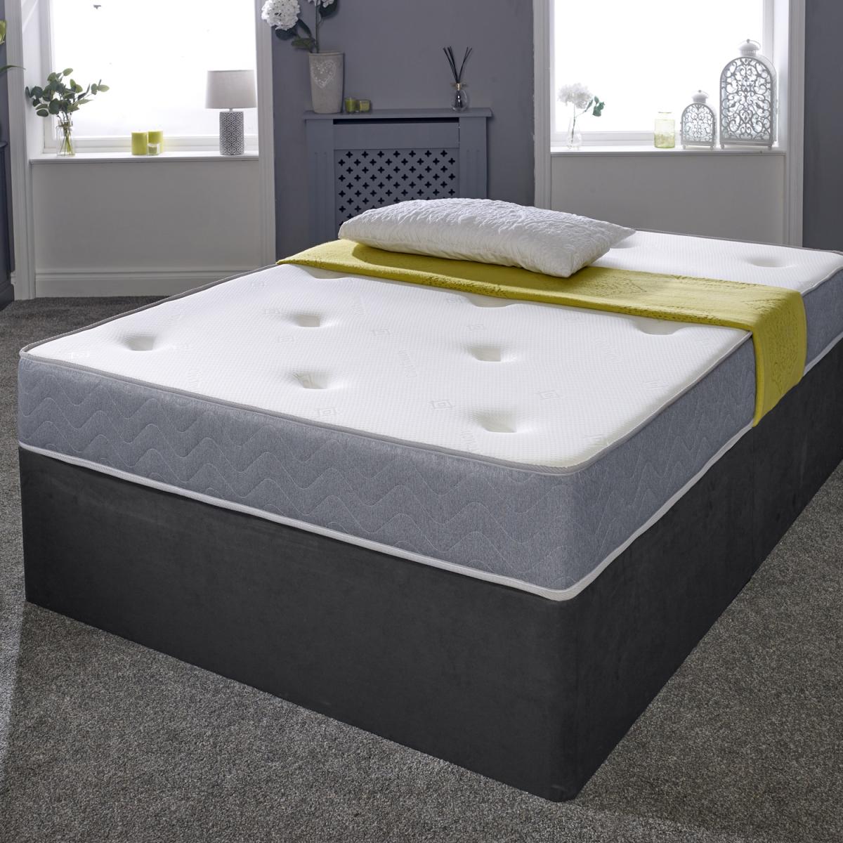 Fantastic value foam-free everyday, stylish tufted mattress suitable for all bed base types of the appropriate size. Please do check the size of your base before ordering as these will be difficult for you to return. It has a double insulated European engineered open coil Bonnell spring unit with deep polyester comfort fillings (75 minimum recycled content), a layer of the revolutionary Airstream Memory Fibre and a Cool Touch Core hand tufted top panel with a wavy grey border. Airstream Memory Fibre is a revolutionary new filling designed to mimic the effects of memory foam without the associated heat discomfort some sleepers experience. It is produced from recycled plastics and unlike foams, it is 100 recyclable. Ideal as a spare room mattress, but also suitable for everyday use, it is a medium soft feel mattress containing springs, comfort layers and a layer of Airstream Memory Fibre with a single sleeping side and a hand-tufted finish to help keep fillings secure. You should rotate your mattress regularly to get the best from it. These are UK-made mattresses, produced in our West Yorkshire factory and are fully compliant with all relevant UK fire safety regulations for domestic use.brbr. We compress, vacuum pack and roll these mattresses so that they can be delivered quickly and cheaply to your door. You will need to allow a few hours after opening for your mattress to regain its shape and size. This is a foam-free mattress.