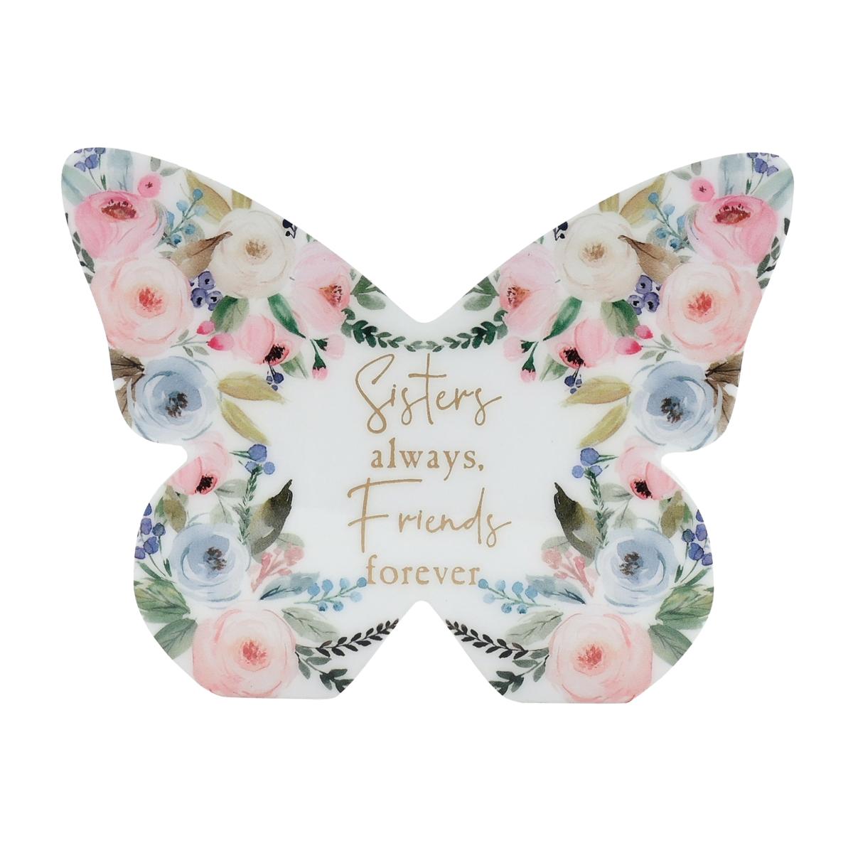 * Eye-Catching Butterfly Shape * Beautiful Floral Design * High Shine Finish * Made from Durable Wood Make your sister happy with this eye-catching gift, part of Celebrations' wonderful 'The Cottage Garden' range. Shaped like a butterfly with a high shine finish, this piece features the sentiment "Sisters always. Friends forever".