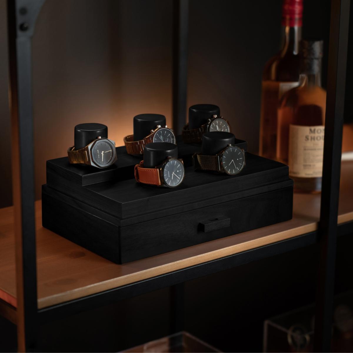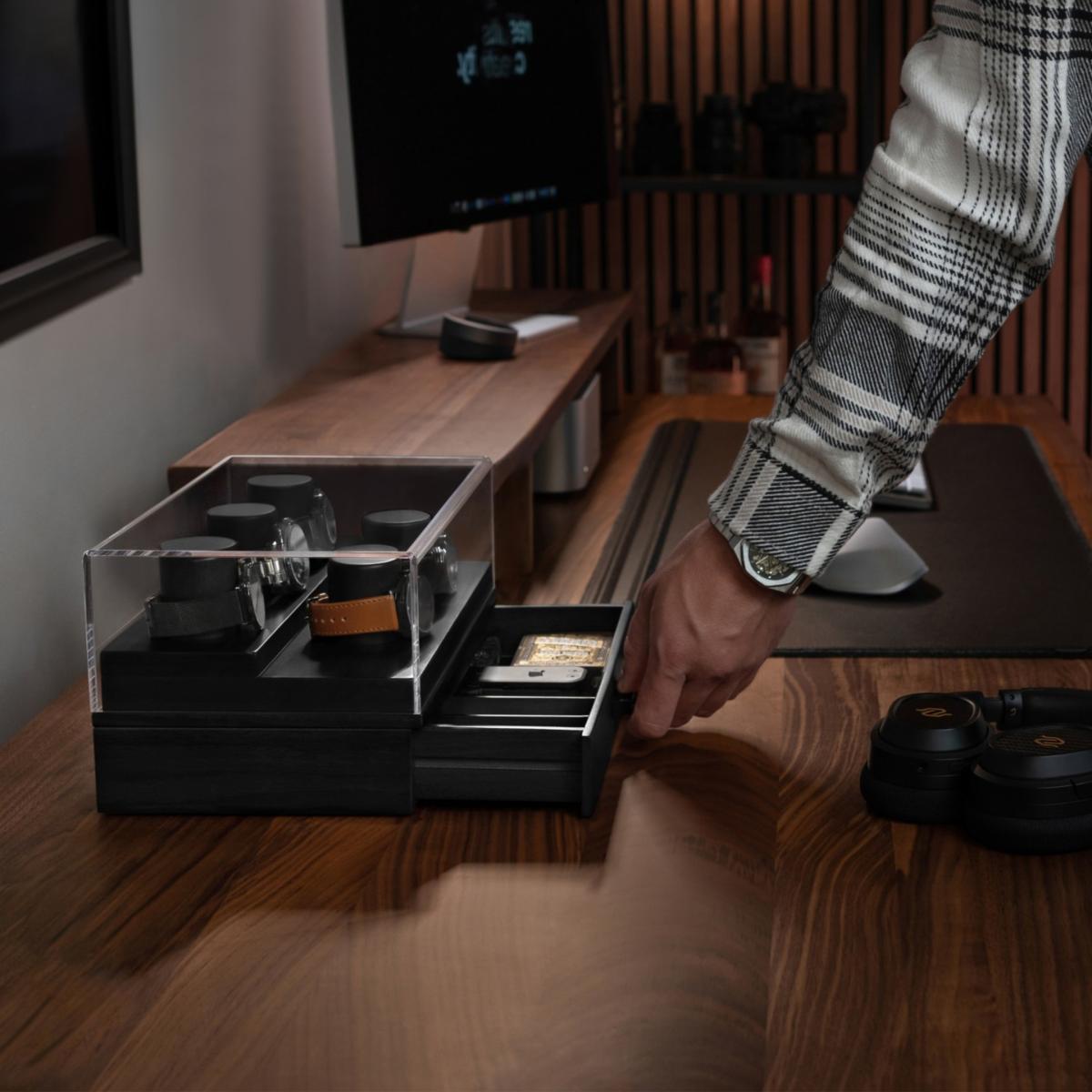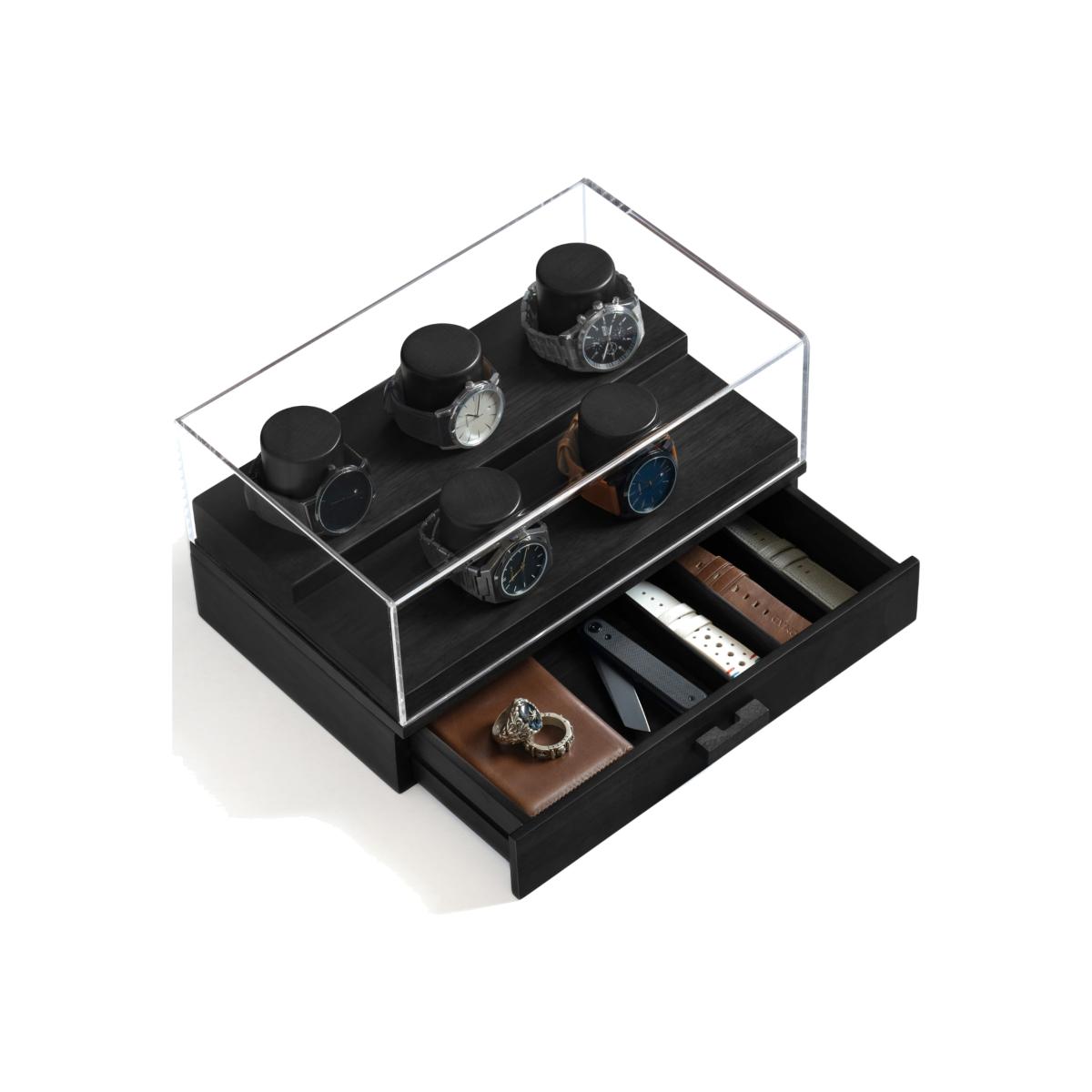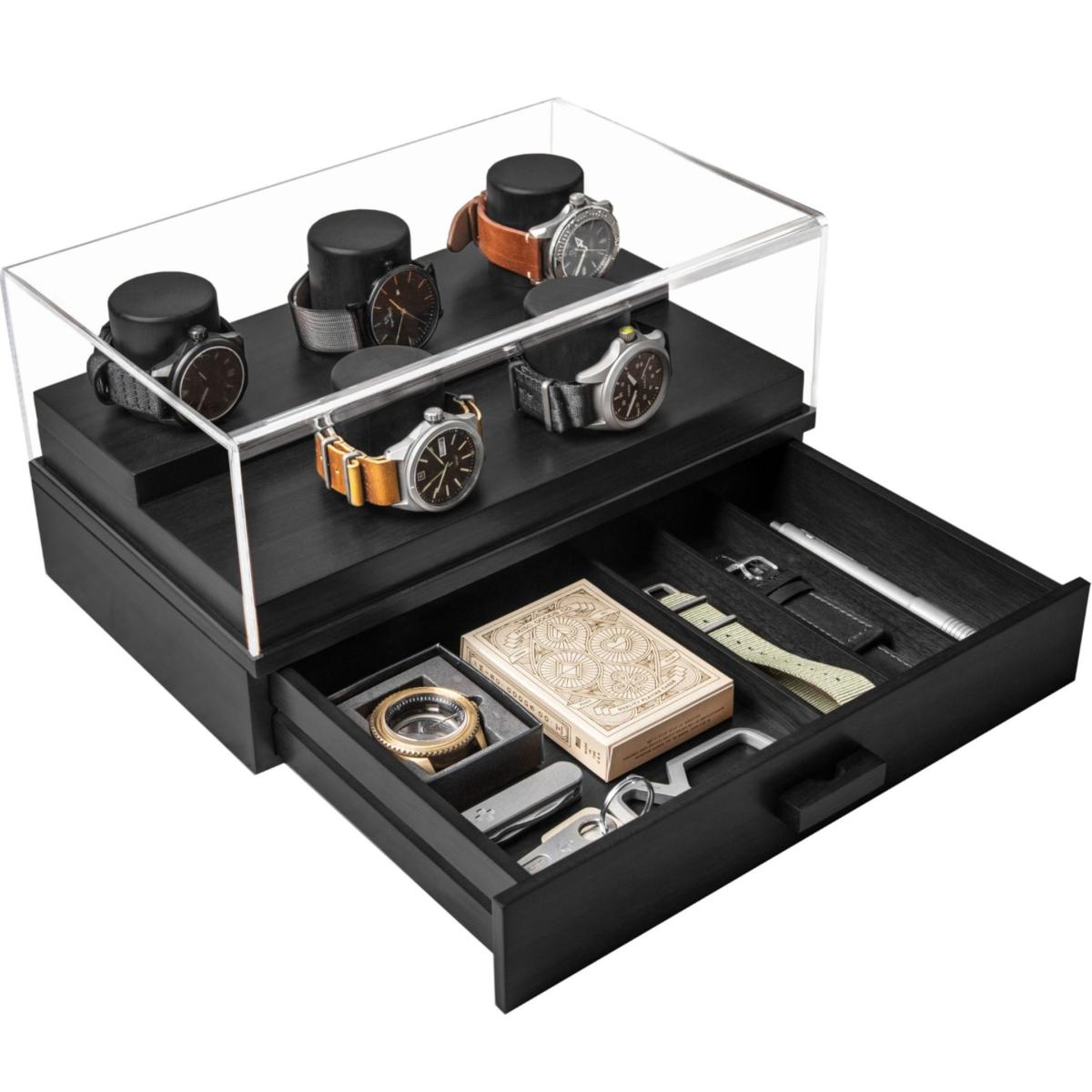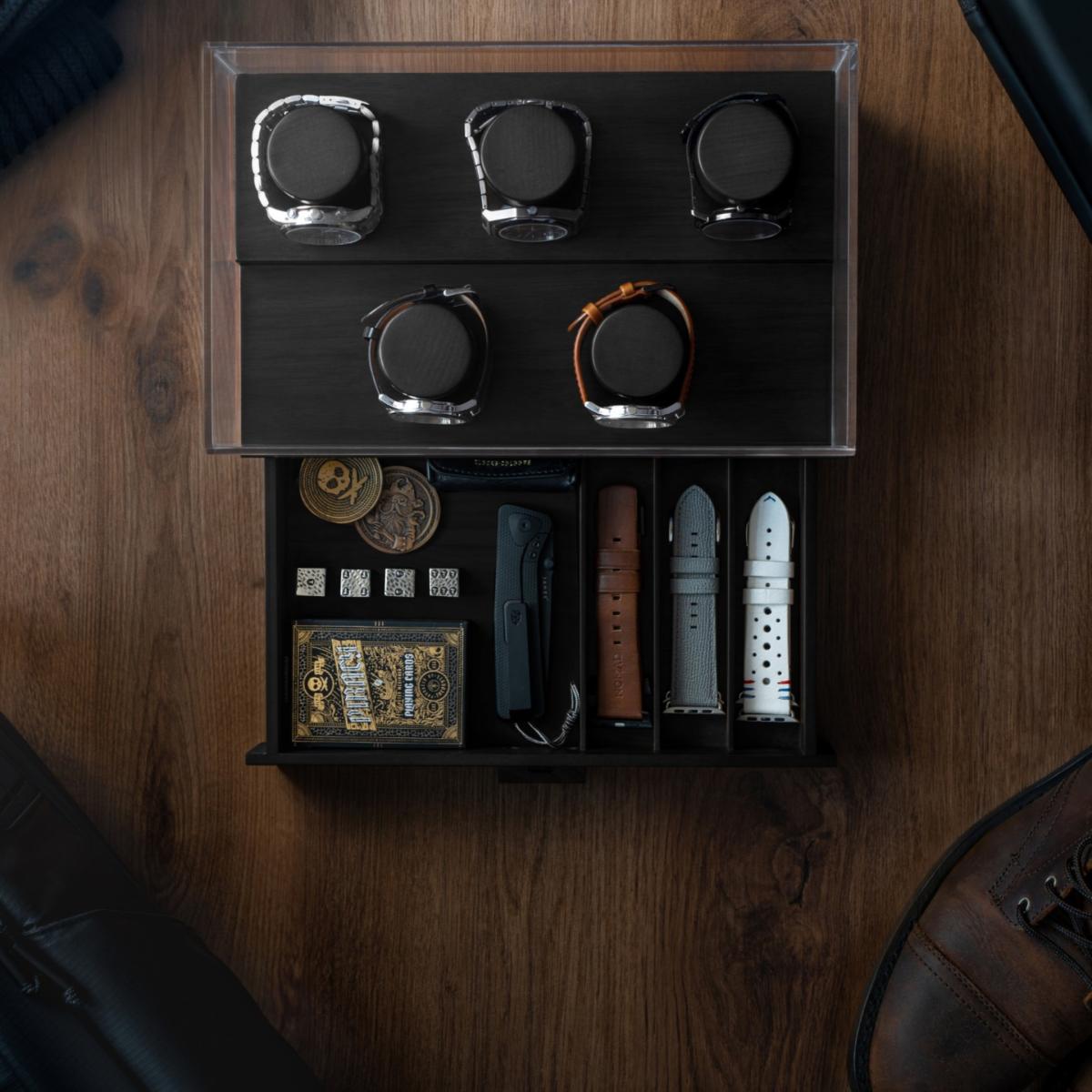 Do you have an growing watch collection you would like to both store and display? Look no further than The Curator, a watch box for men with an innovative two-tier platform that has enough space for 5 of your most precious watches. The top of the deck of the watch display case is enclosed with an acrylic lid that gives you a 360-degree view of your watch collection while protecting them from harmful dust particles to extend their longevity and retain their value (upgrade to Curator Pro for hinged case and vegan leather paddings). Below deck, you'll find a large drawer that opens and closes with ease for storing all your accessories such as watch straps, links, Air. Pods, keys, coins, cards, hopes and dreams.