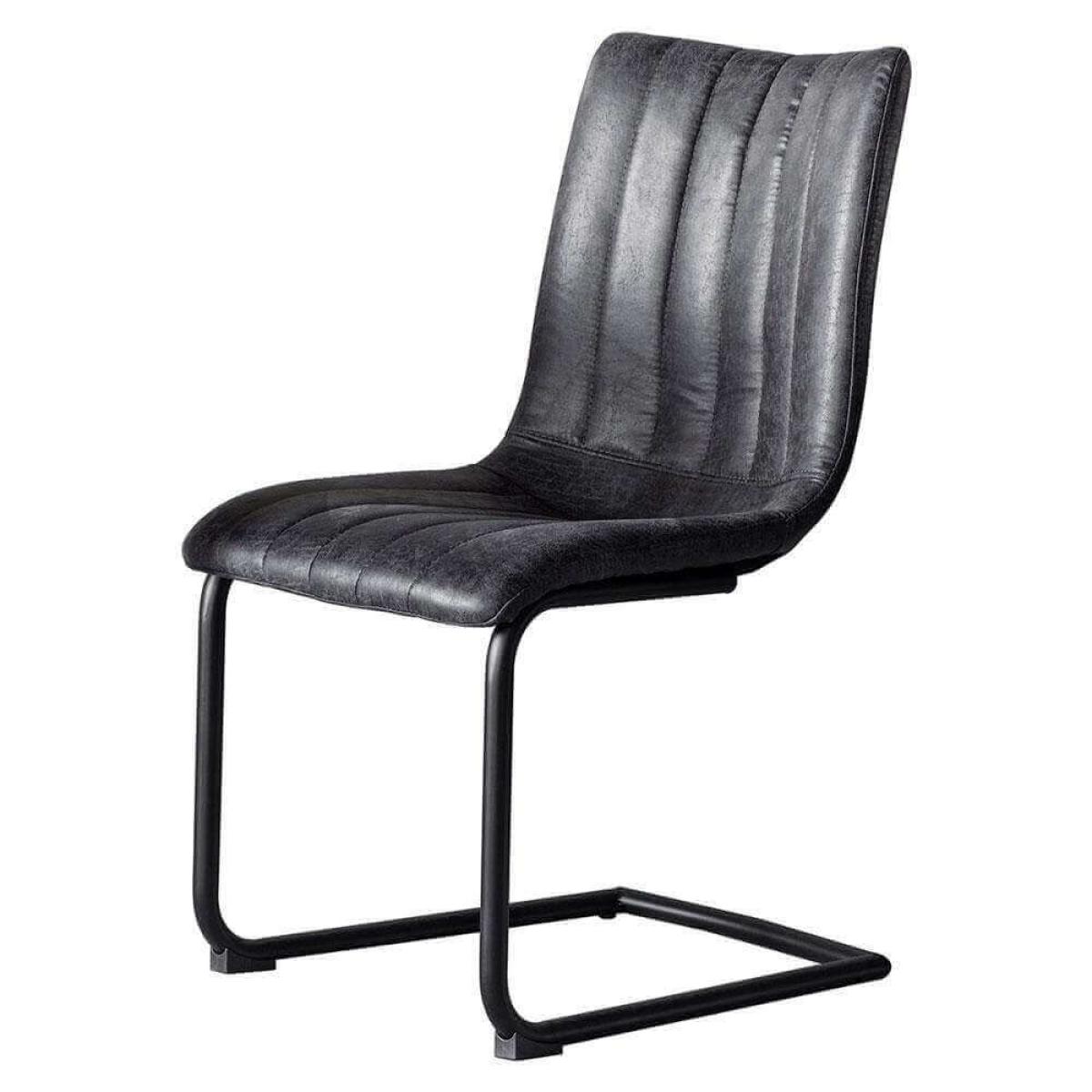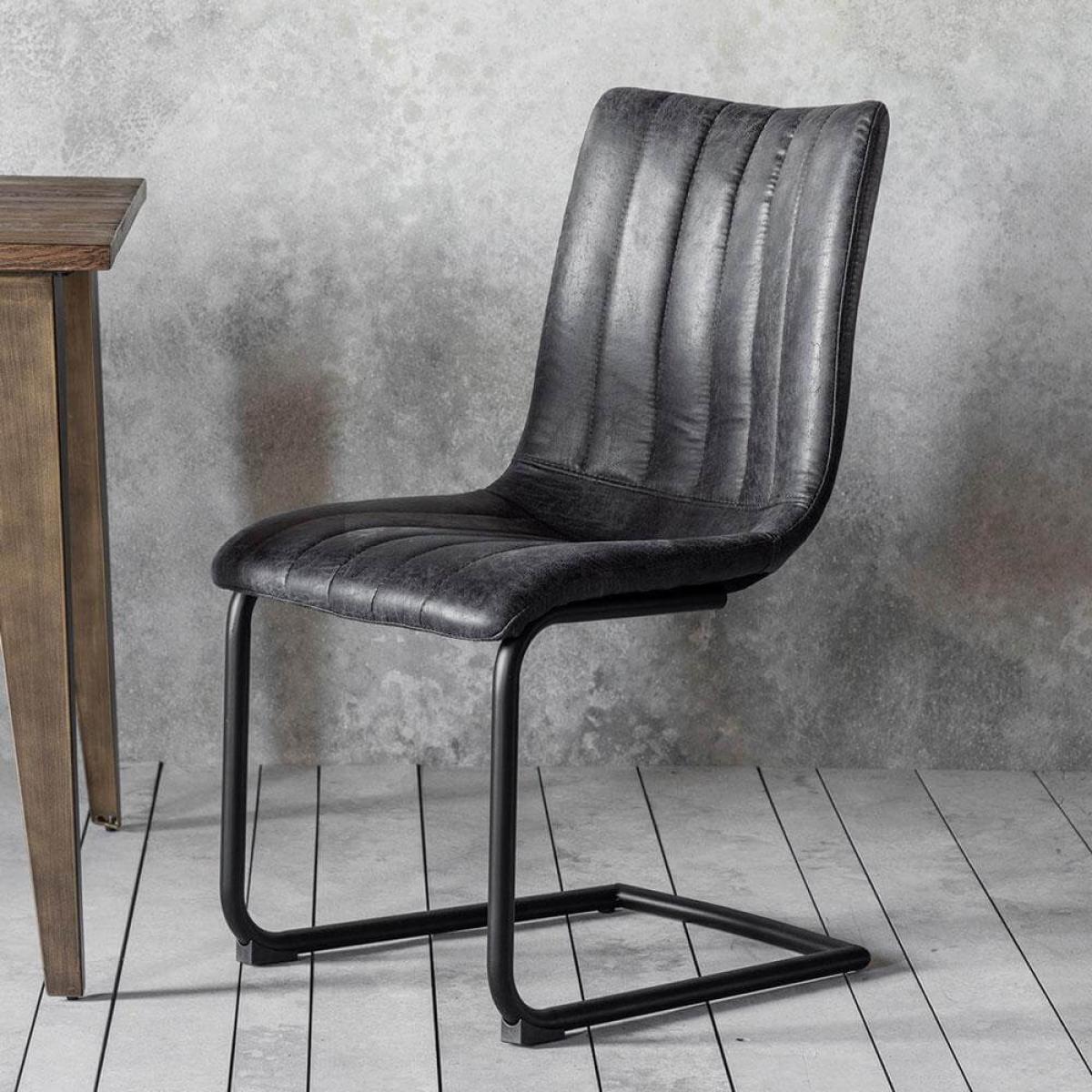 A retro classic styled charcoal faux leather pair of chairs, with decorative stitching detail and sleek bronzed cantilever base.