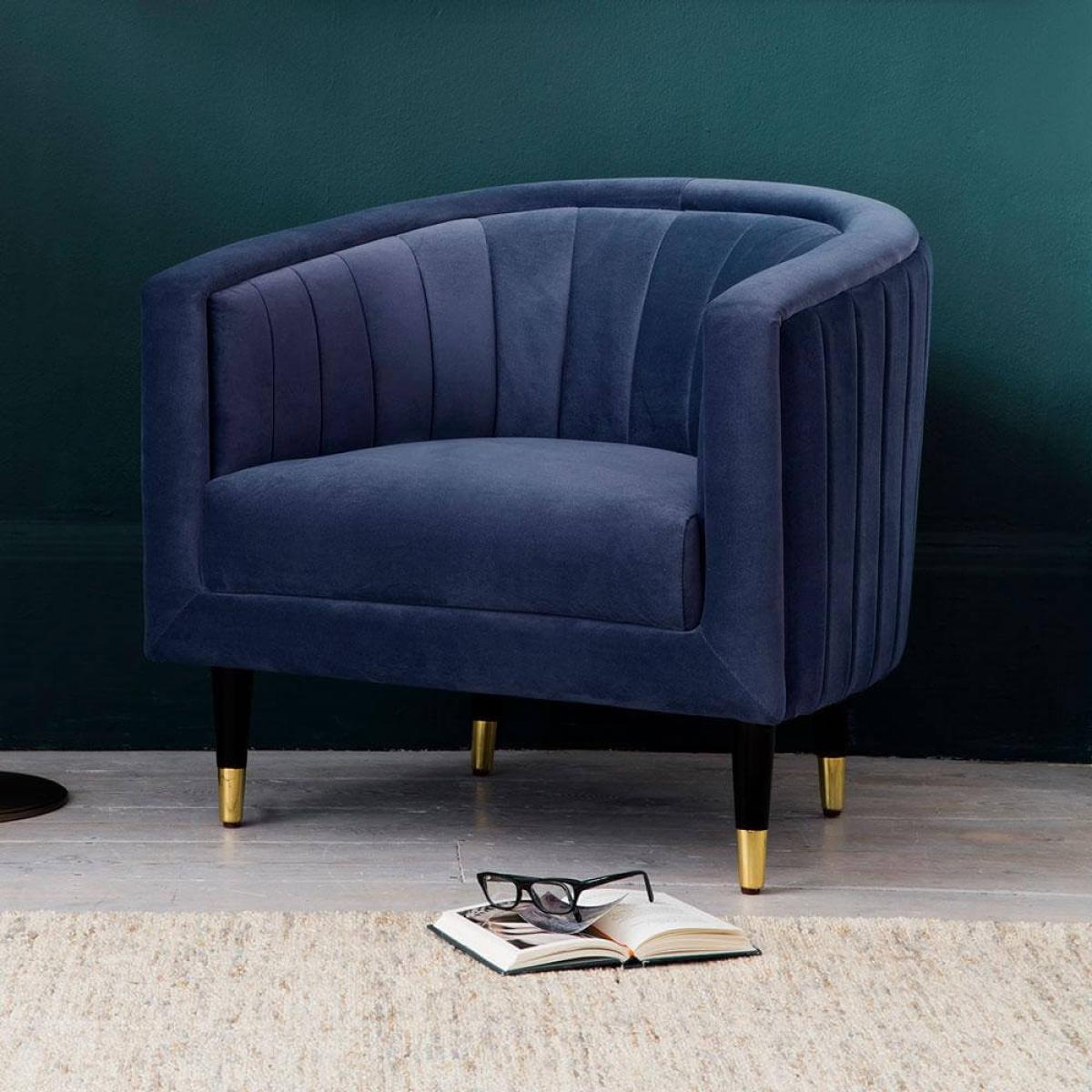 I love this blue velvet tub chair for its rich colour and timeless shape, making it a real statement piece. It works well in both contemporary and vintage-inspired interiors, providing a splash of colour and texture without overwhelming the space. When styling, consider pairing it with neutral tones to let the colour stand out, or add contrasting accessories like metallics or patterned cushions for visual interest. Practical tips include anchoring it near a reading nook or a cosy corner with a side table and good lighting, making it as functional as it is stylish. Its plush velvet finish adds a luxurious touch without feeling fussy, making it versatile in many settings.