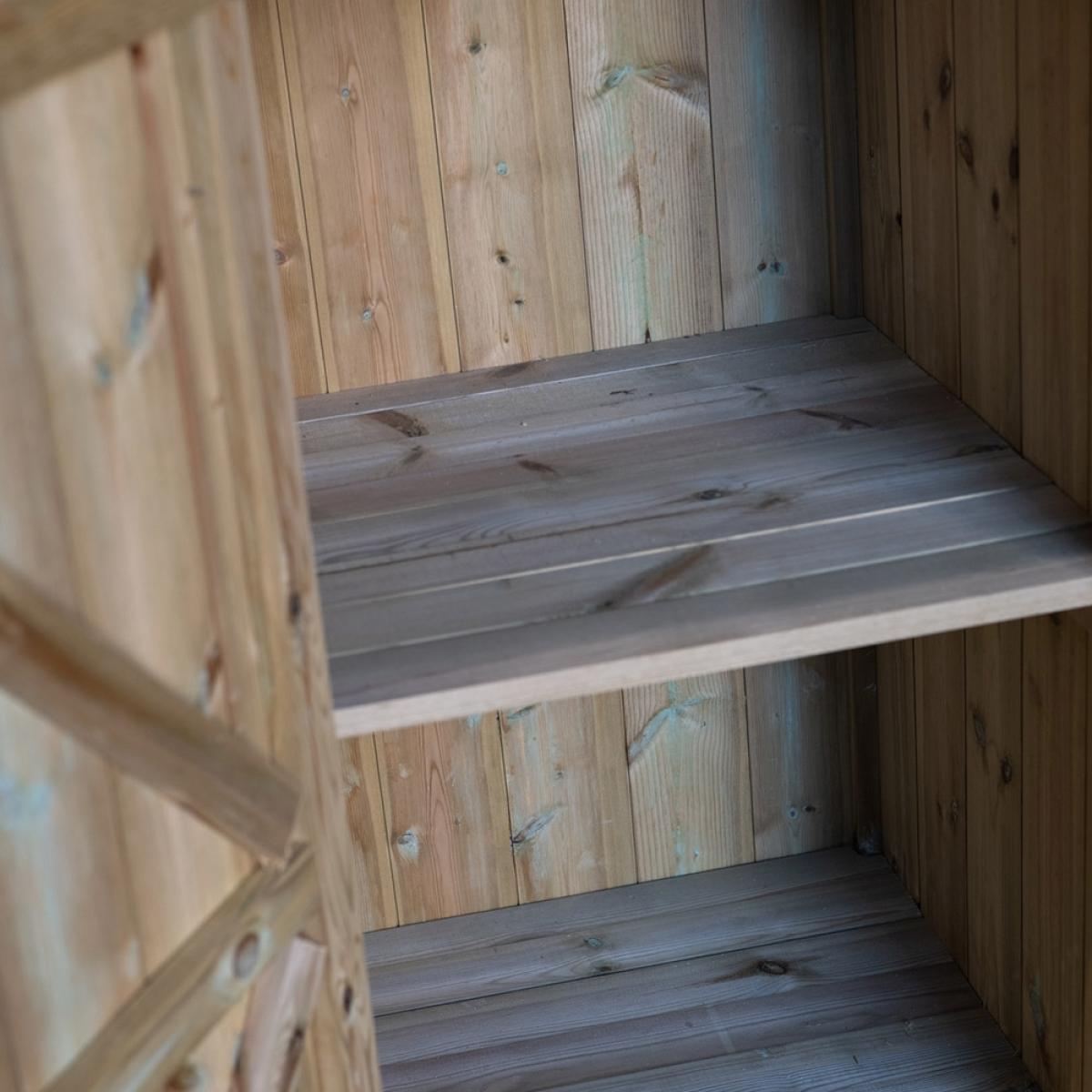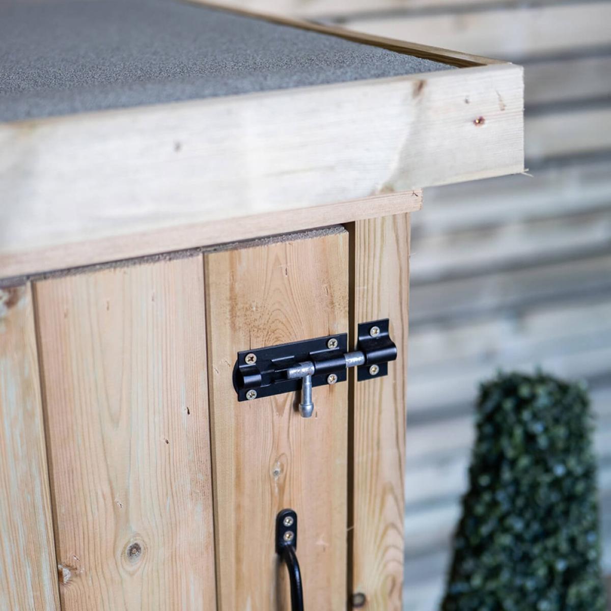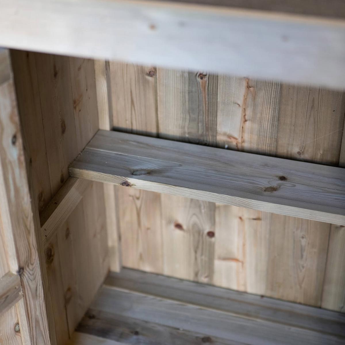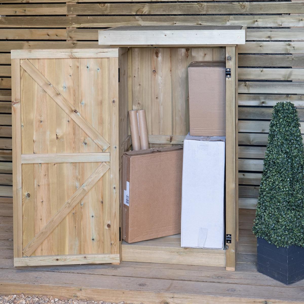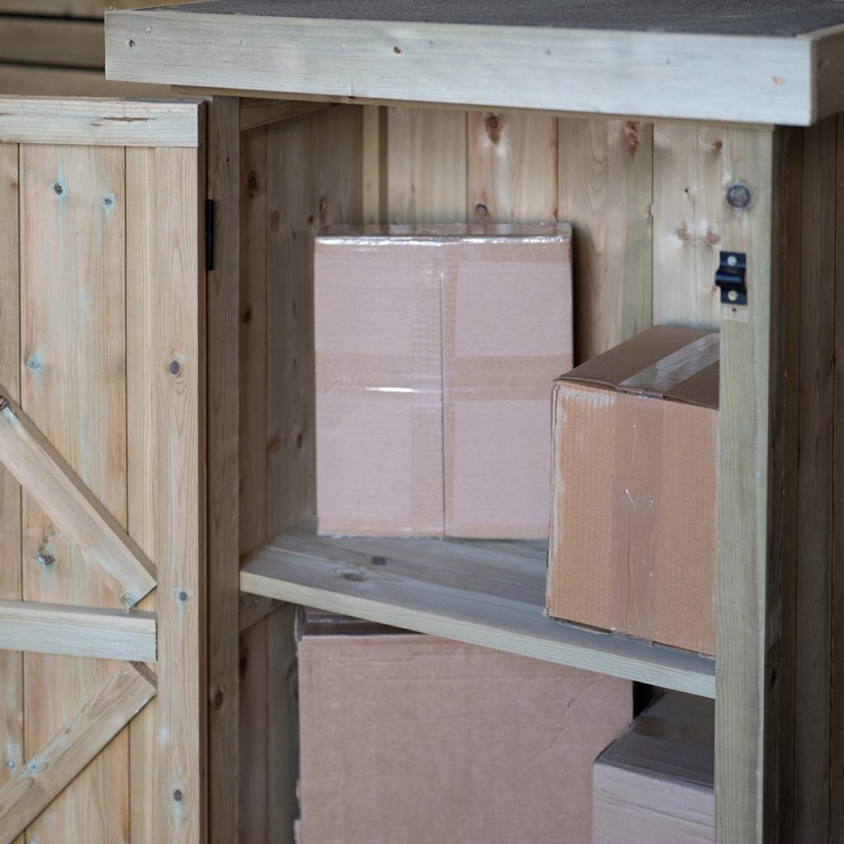 With The Garden Village Parcel Store - gone are the days of soggy boxes and damaged packages! There is nothing worse than hitting checkout and not knowing where your delivery will be dropped. You'll have peace of mind if you're not in or can't get to the door right away. Made from certified FSC timber; the tongue and groove frame and slanted mineral felt roof offer protection for all of your new purchases. Behind the full length door with bolt locks, you have the option to create two compartments with the full width shelf. For larger boxes, simply remove! Not expecting any packages? Utilise your garden storage unit and stow boots, brollies and other outdoor essentials.
