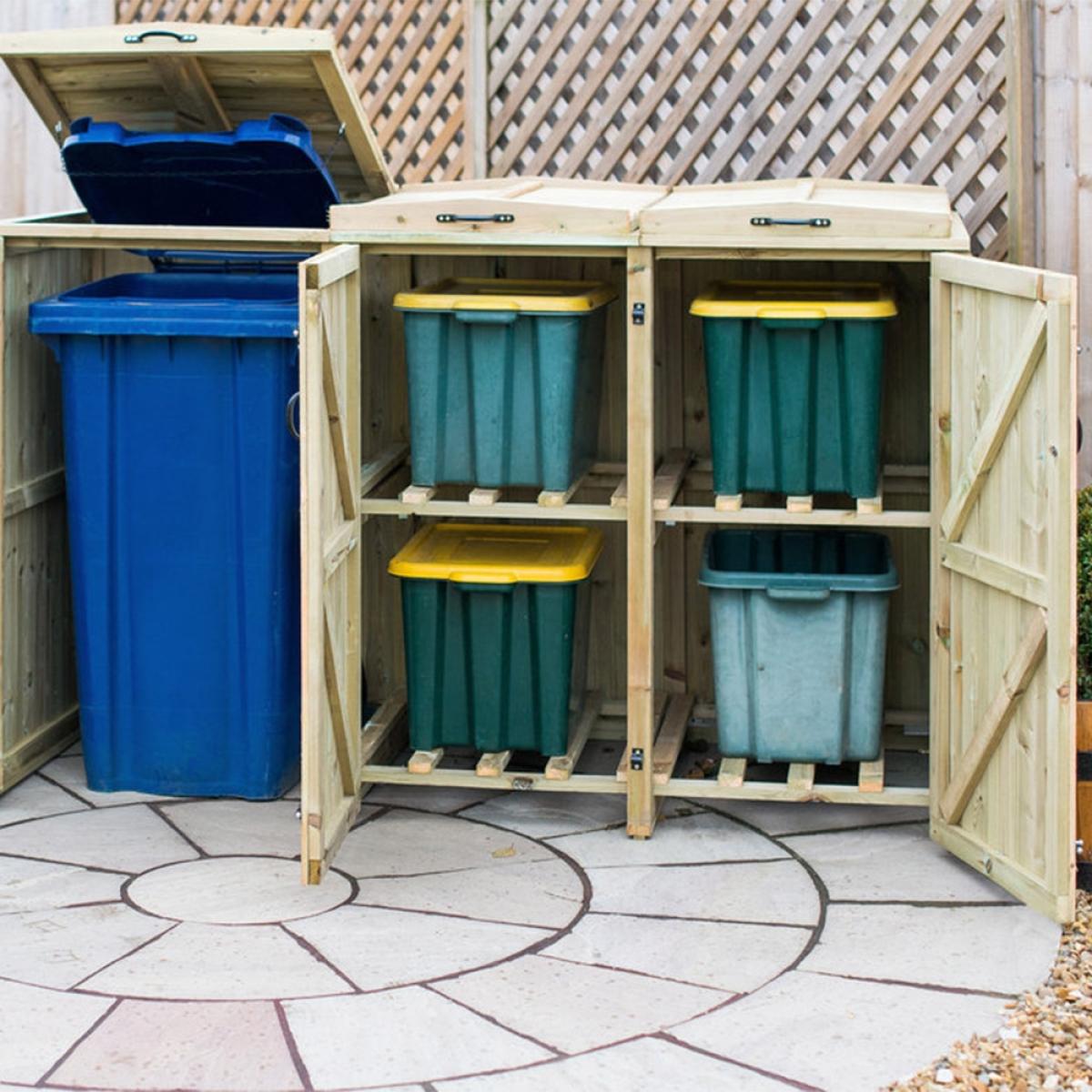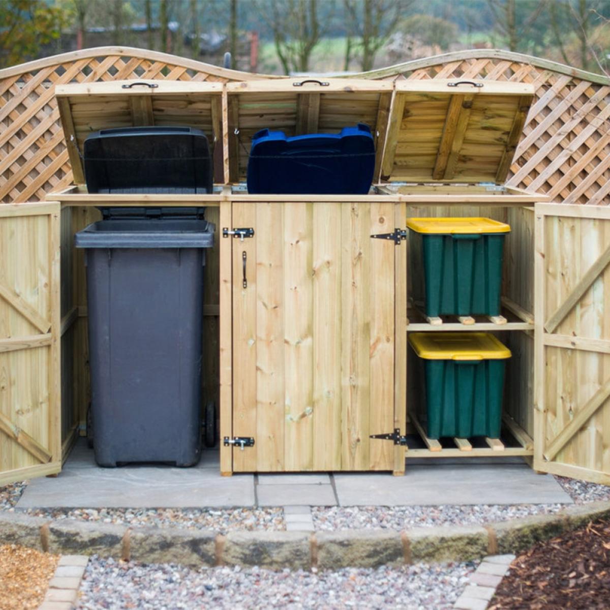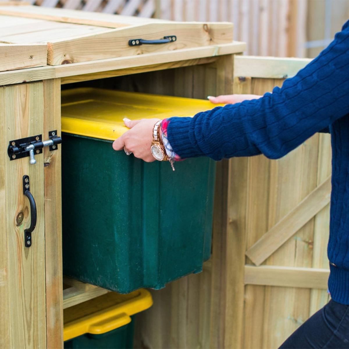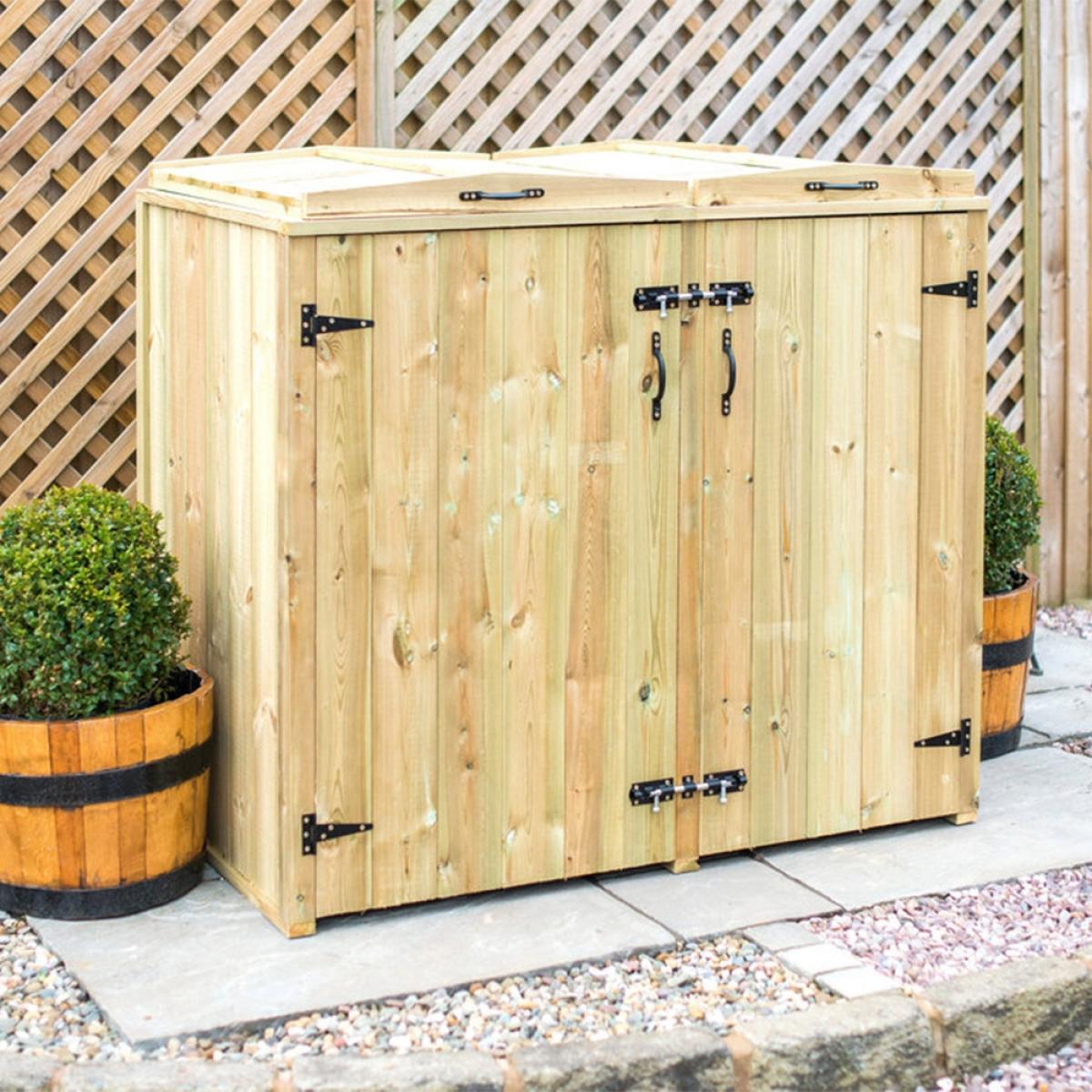 Keep your wheelie bins and recycling boxes securely hidden away with the Superior Wooden Wheelie Bin and Recycling Box Storage from The Garden Village. Manufactured from high quality FSC sourced redwood timber, the tall unit features easy opening bin lids, so disposing of waste and recycling is quick and painless. Complete with attractive handles and hinges, the natural wood comes pressure treated offering durability and longevity. Assemble your storage shed in the garden or on the patio and keep unsightly plastic bins safely housed and prevent unwanted pests from rummaging through your bottles, tins and general rubbish! When bin day comes around, simply unlatch the bolted doors and remove your boxes ready for collection! With other sizes and stores available here at Cuckooland, there is a container to suit your needs!.