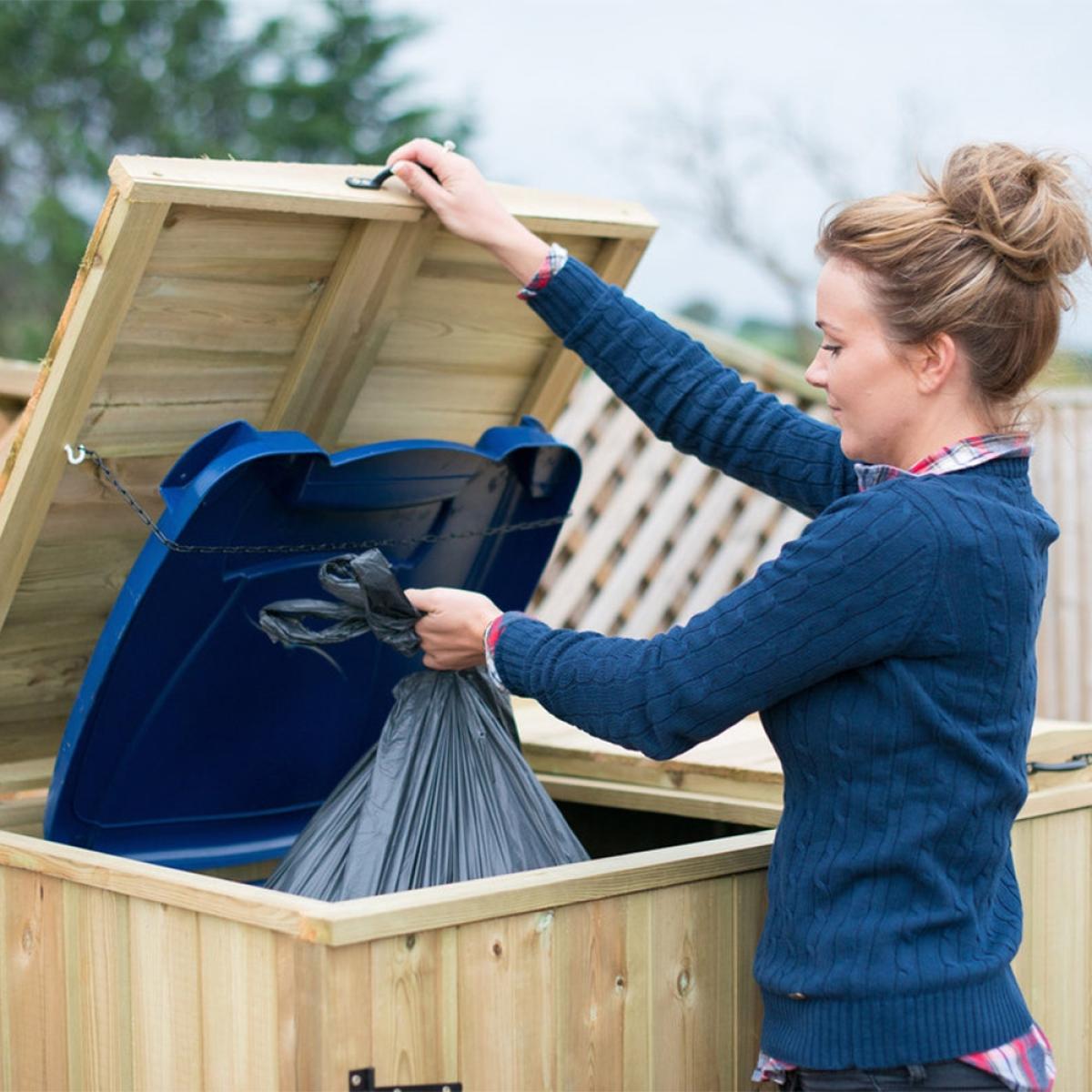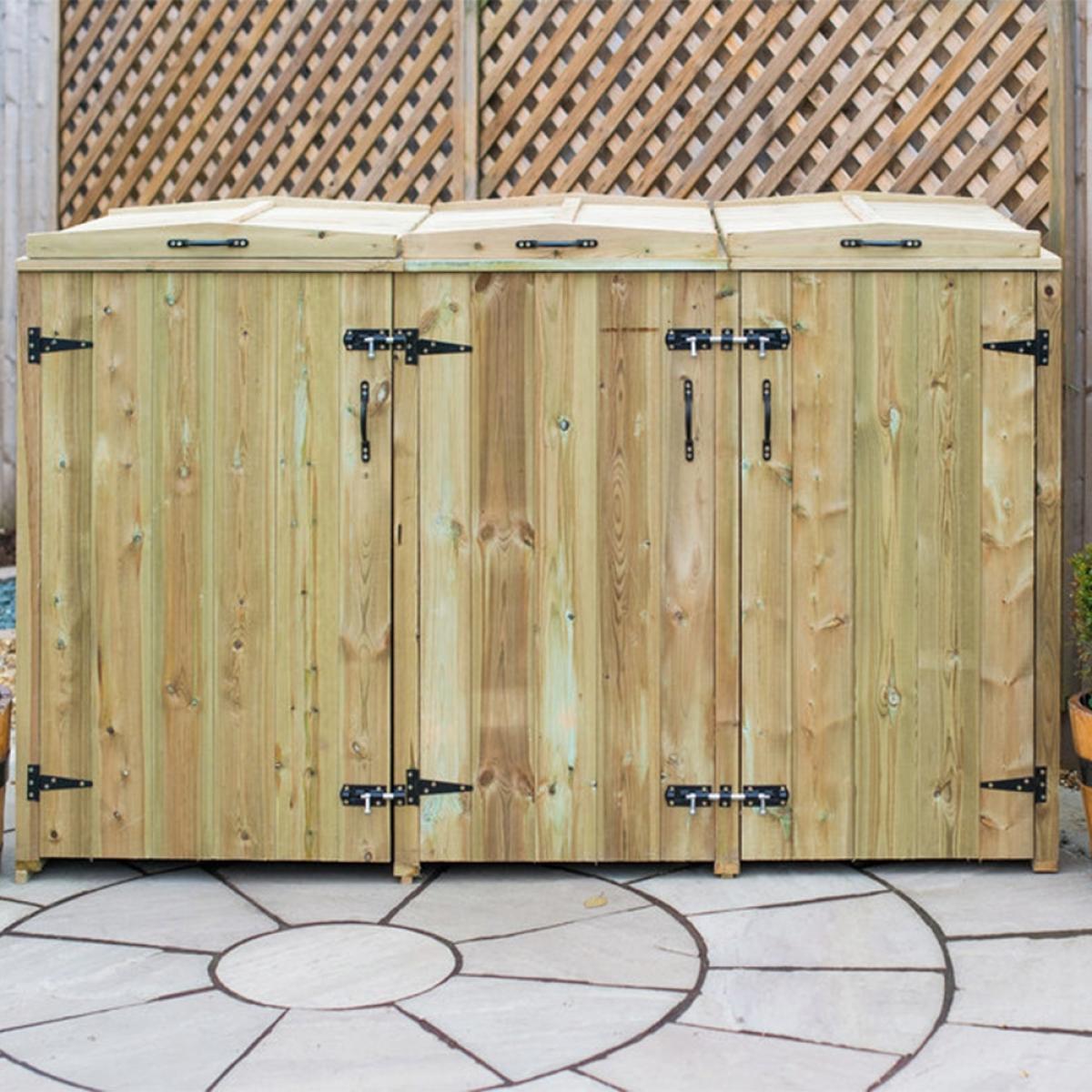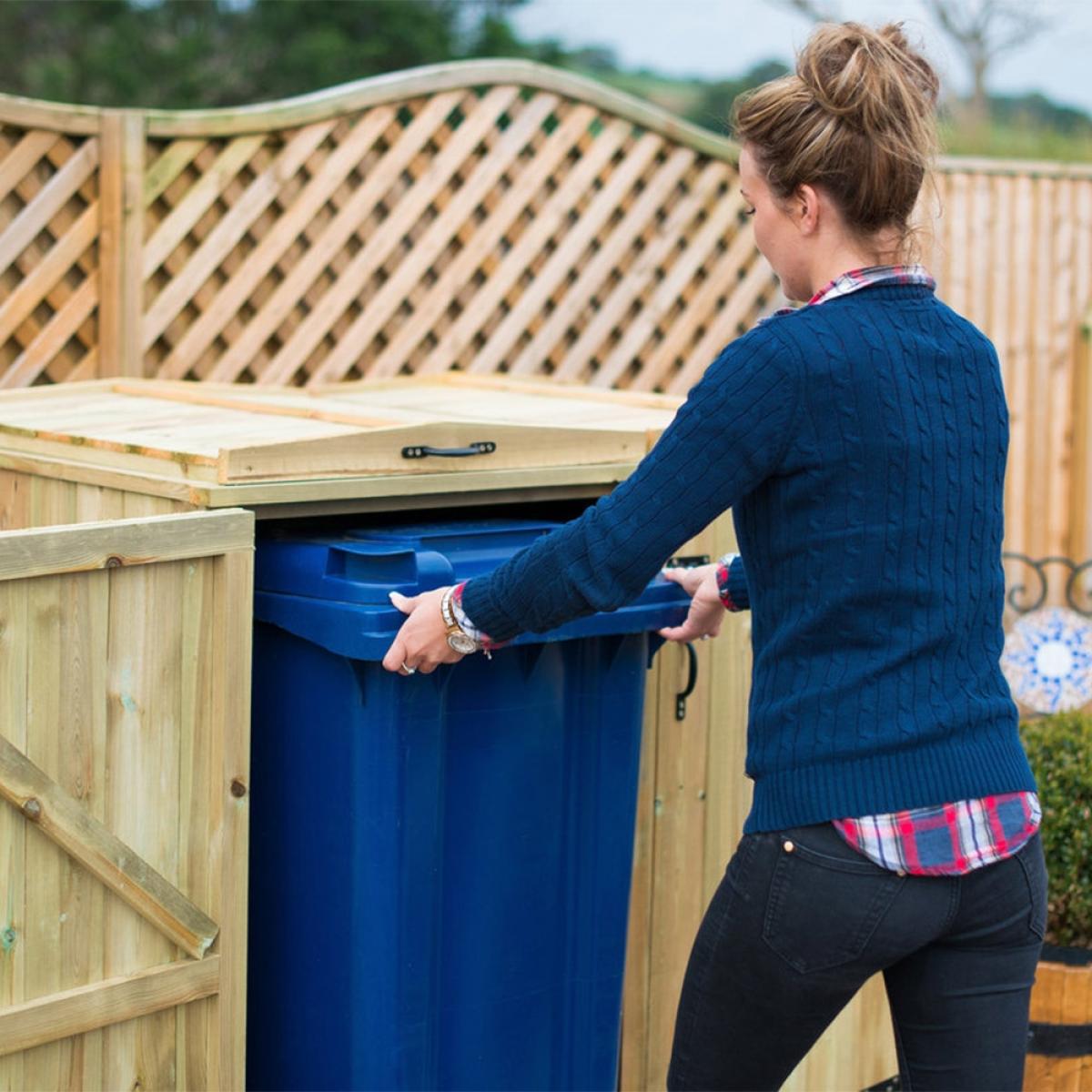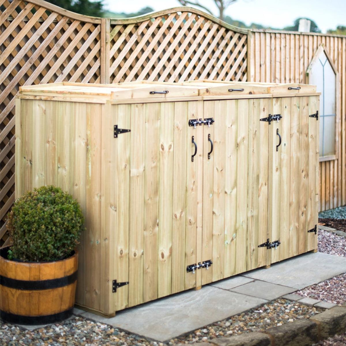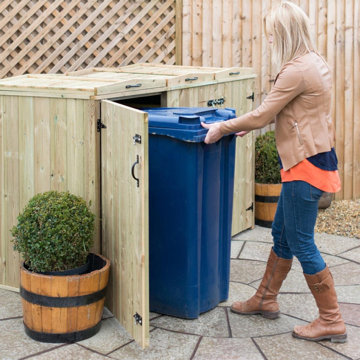 Keep your wheelie bins and recycling boxes securely hidden away with the Superior Wooden Wheelie Bin and Recycling Box Storage from The Garden Village. Manufactured from high quality FSC sourced redwood timber, the tall unit features easy opening bin lids, so disposing of waste and recycling is quick and painless. Complete with attractive handles and hinges, the natural wood comes pressure treated offering durability and longevity. Assemble your storage shed in the garden or on the patio and keep unsightly plastic bins safely housed and prevent unwanted pests from rummaging through your bottles, tins and general rubbish! When bin day comes around, simply unlatch the bolted doors and remove your boxes ready for collection! With other sizes and stores available here at Cuckooland, there is a container to suit your needs!.