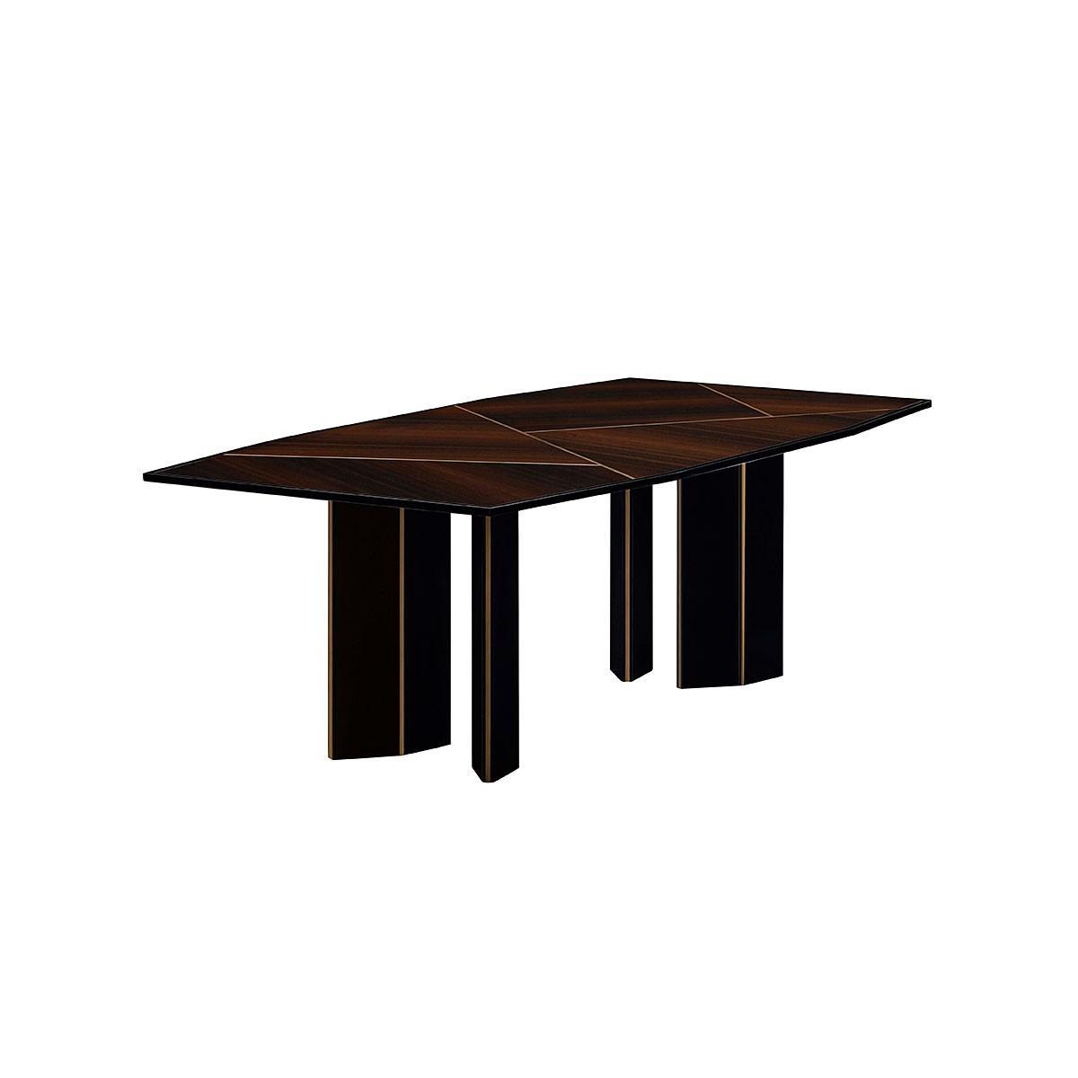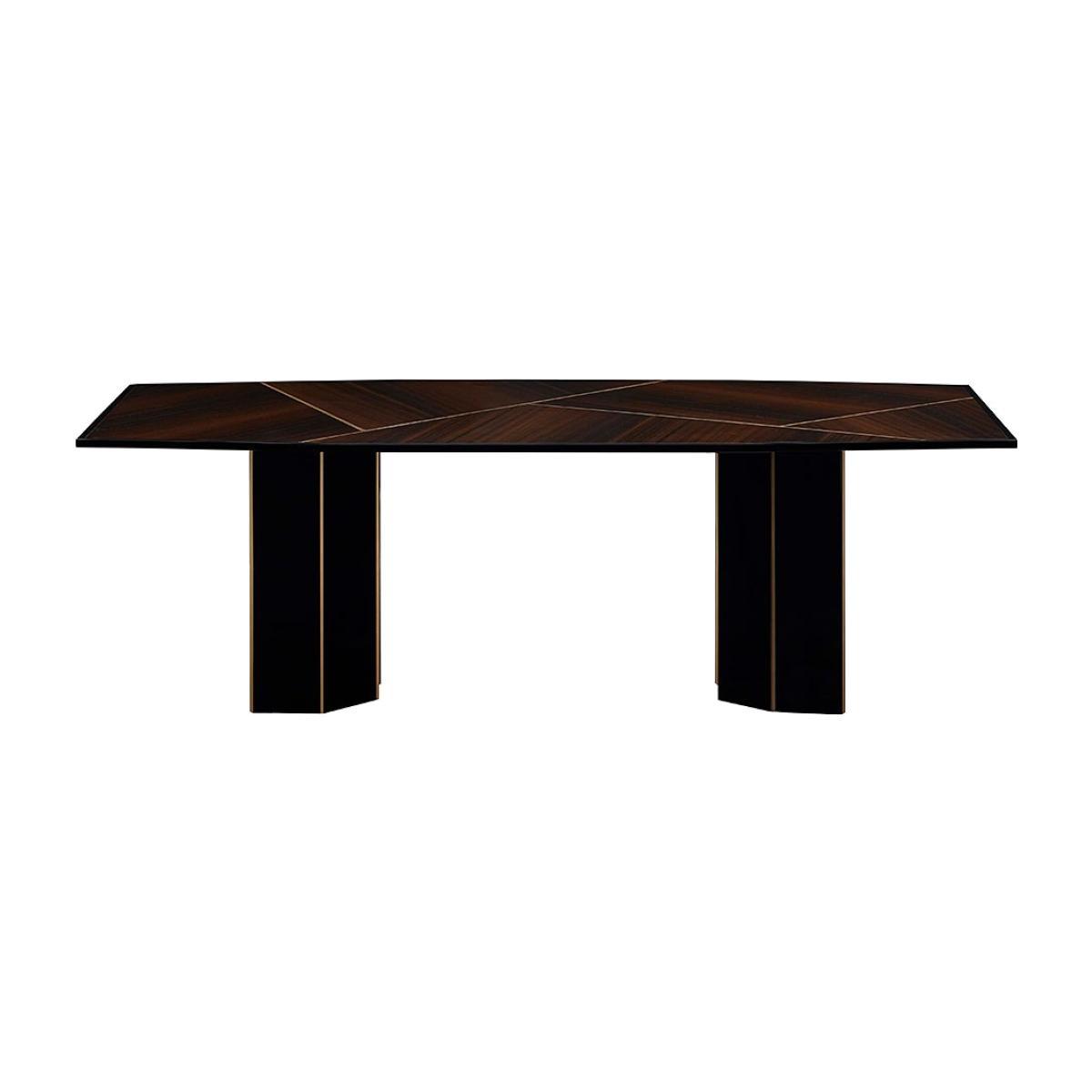 An elegant dining table here shown in a high gloss Fume wood veneer with brushed brass base and metal inlays.