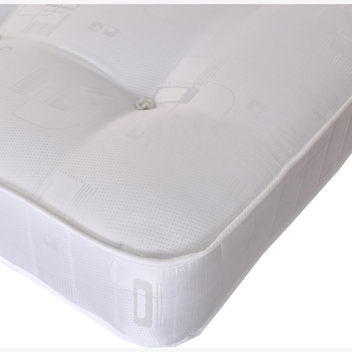 Deeper fill, 22cm thick, foam-free everyday, stylish dual-sided tufted mattress suitable for all bed base types of the appropriate size. Please do check the size of your base before ordering as these will be difficult for you to return. This is our Geo Castle Core - Dual Sided, Tufted, 22cm Deep, Foam Free traditional spring mattress. It has a double insulated European engineered open coil Bonnell spring unit with deep polyester comfort fillings on both sides (75 minimum recycled content) and a modern Geometric design damask fabric panel with a hand-tufted finish to help keep your fillings secure. The polyester comfort fillings are made from recycled plastics and unlike foams, it is 100 recyclable. Ideal as a spare room mattress, but also suitable for everyday use, it is a medium soft feel mattress containing springs, comfort layers and a hand-tufted finish. You should turn and rotate your mattress regularly to get the best from it. These are UK-made mattresses, produced in our West Yorkshire factory and are fully compliant with all relevant UK fire safety regulations for domestic use. We compress vacuum pack and roll these mattresses so that they can be delivered quickly and cheaply to your door. You will need to allow a few hours after opening for your mattress to regain its shape and size. This is a foam-free mattress.