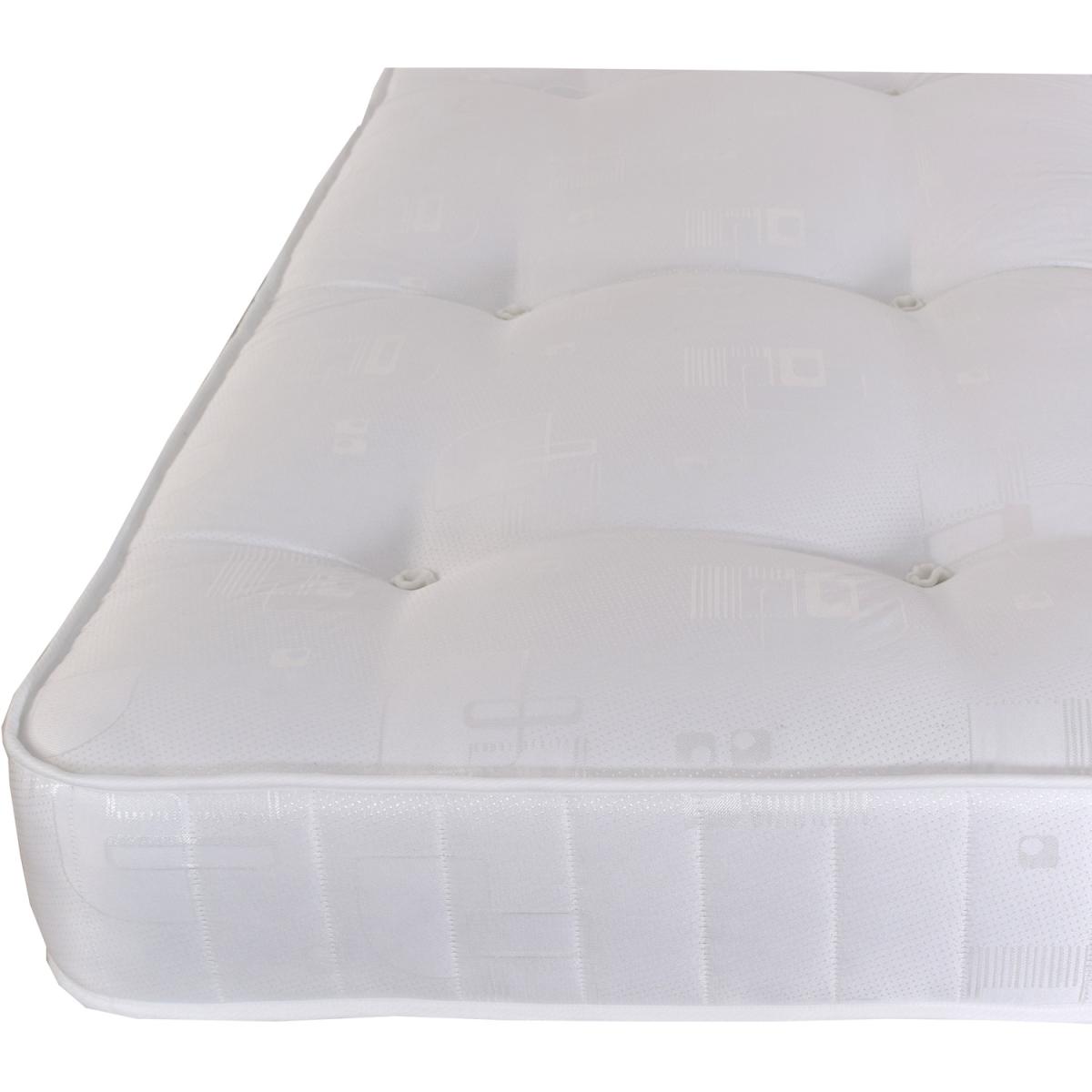 Deeper fill, 22cm thick, foam-free everyday, stylish dual-sided tufted mattress suitable for all bed base types of the appropriate size. Please do check the size of your base before ordering as these will be difficult for you to return. This is our Geo Castle Core - Dual Sided, Tufted, 22cm Deep, Foam Free traditional spring mattress. It has a double insulated European engineered open coil Bonnell spring unit with deep polyester comfort fillings on both sides (75 minimum recycled content) and a modern Geometric design damask fabric panel with a hand-tufted finish to help keep your fillings secure. The polyester comfort fillings are made from recycled plastics and unlike foams, it is 100 recyclable. Ideal as a spare room mattress, but also suitable for everyday use, it is a medium soft feel mattress containing springs, comfort layers and a hand-tufted finish. You should turn and rotate your mattress regularly to get the best from it. These are UK-made mattresses, produced in our West Yorkshire factory and are fully compliant with all relevant UK fire safety regulations for domestic use. We compress vacuum pack and roll these mattresses so that they can be delivered quickly and cheaply to your door. You will need to allow a few hours after opening for your mattress to regain its shape and size. This is a foam-free mattress.