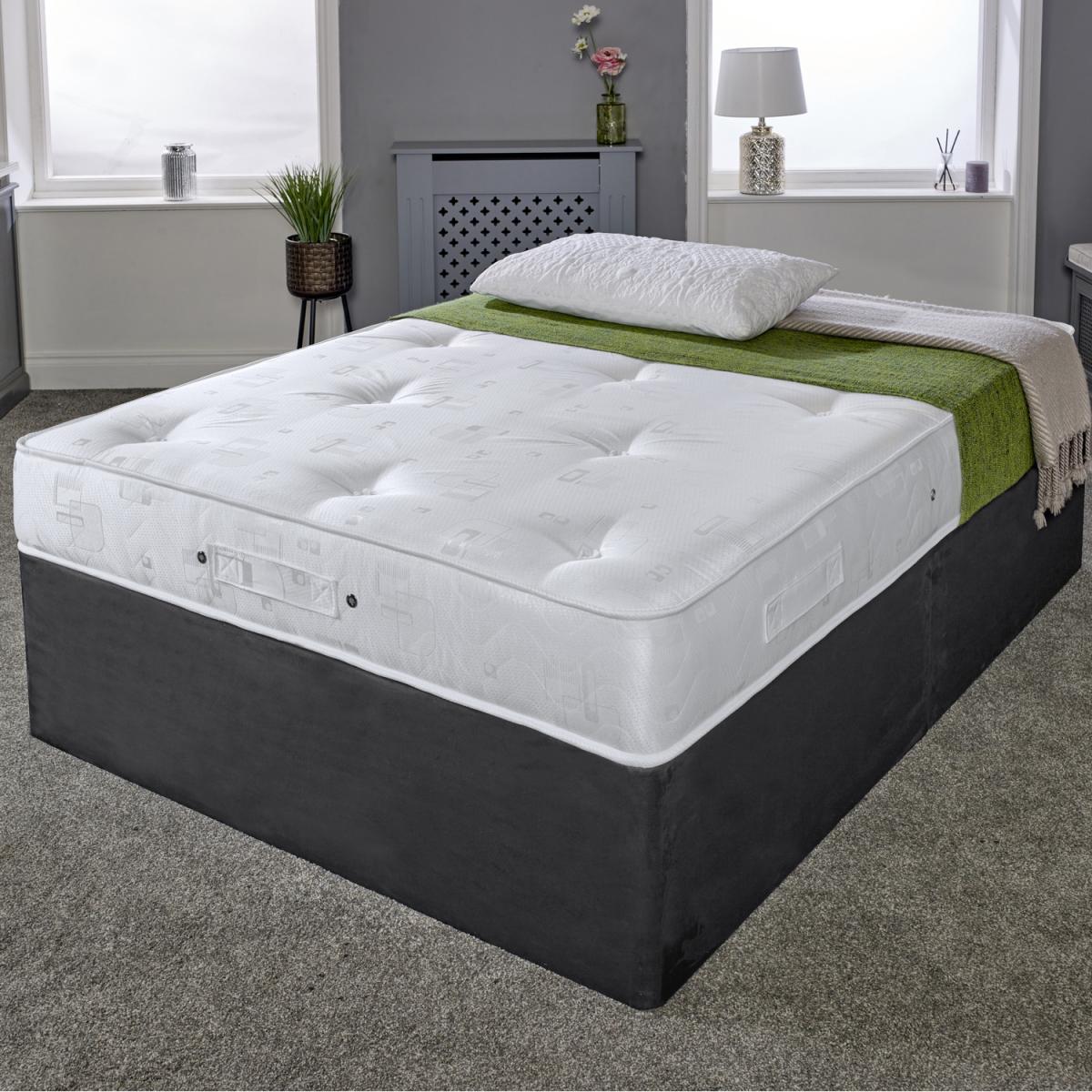 Premium, Deeper fill, 22cm thick, foam-free everyday, stylish dual-sided tufted mattress with turning handles and vents, suitable for all bed base types of the appropriate size. Please check the size of your base before ordering as these will be difficult for you to return. This is our Geo Wave Superior - Dual Sided, Tufted, 22cm Deep with an additional loft, Foam Free traditional spring mattress with turning handles and vents. It has a double insulated European engineered open coil Bonnell spring unit with even deeper polyester comfort fillings on both sides (75% minimum recycled content) and a modern Geometric design damask fabric panel with a hand-tufted finish to help keep your fillings secure. The polyester comfort fillings are made from recycled plastics and unlike foams, it is 100% recyclable. Ideal as a spare room mattress, but also suitable for everyday use, it is a soft-feel mattress containing springs, comfort layers and a hand-tufted finish. You should turn and rotate your mattress regularly to get the best from it, using the attached handles. These are UK-made mattresses, produced in our West Yorkshire factory and are fully compliant with all relevant UK fire safety regulations for domestic use. We compress, vacuum pack and roll these mattresses so that they can be delivered quickly and cheaply to your door. You will need to allow a few hours after opening for your mattress to regain its shape and size. This is a foam-free mattress.