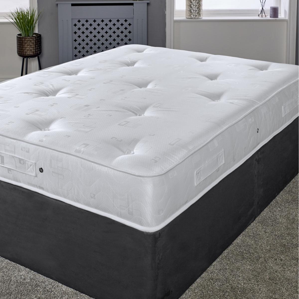 Premium, Deeper fill, 22cm thick, foam-free everyday, stylish dual-sided tufted mattress with turning handles and vents, suitable for all bed base types of the appropriate size. Please check the size of your base before ordering as these will be difficult for you to return. This is our Geo Wave Superior - Dual Sided, Tufted, 22cm Deep with an additional loft, Foam Free traditional spring mattress with turning handles and vents. It has a double insulated European engineered open coil Bonnell spring unit with even deeper polyester comfort fillings on both sides (75% minimum recycled content) and a modern Geometric design damask fabric panel with a hand-tufted finish to help keep your fillings secure. The polyester comfort fillings are made from recycled plastics and unlike foams, it is 100% recyclable. Ideal as a spare room mattress, but also suitable for everyday use, it is a soft-feel mattress containing springs, comfort layers and a hand-tufted finish. You should turn and rotate your mattress regularly to get the best from it, using the attached handles. These are UK-made mattresses, produced in our West Yorkshire factory and are fully compliant with all relevant UK fire safety regulations for domestic use. We compress, vacuum pack and roll these mattresses so that they can be delivered quickly and cheaply to your door. You will need to allow a few hours after opening for your mattress to regain its shape and size. This is a foam-free mattress.