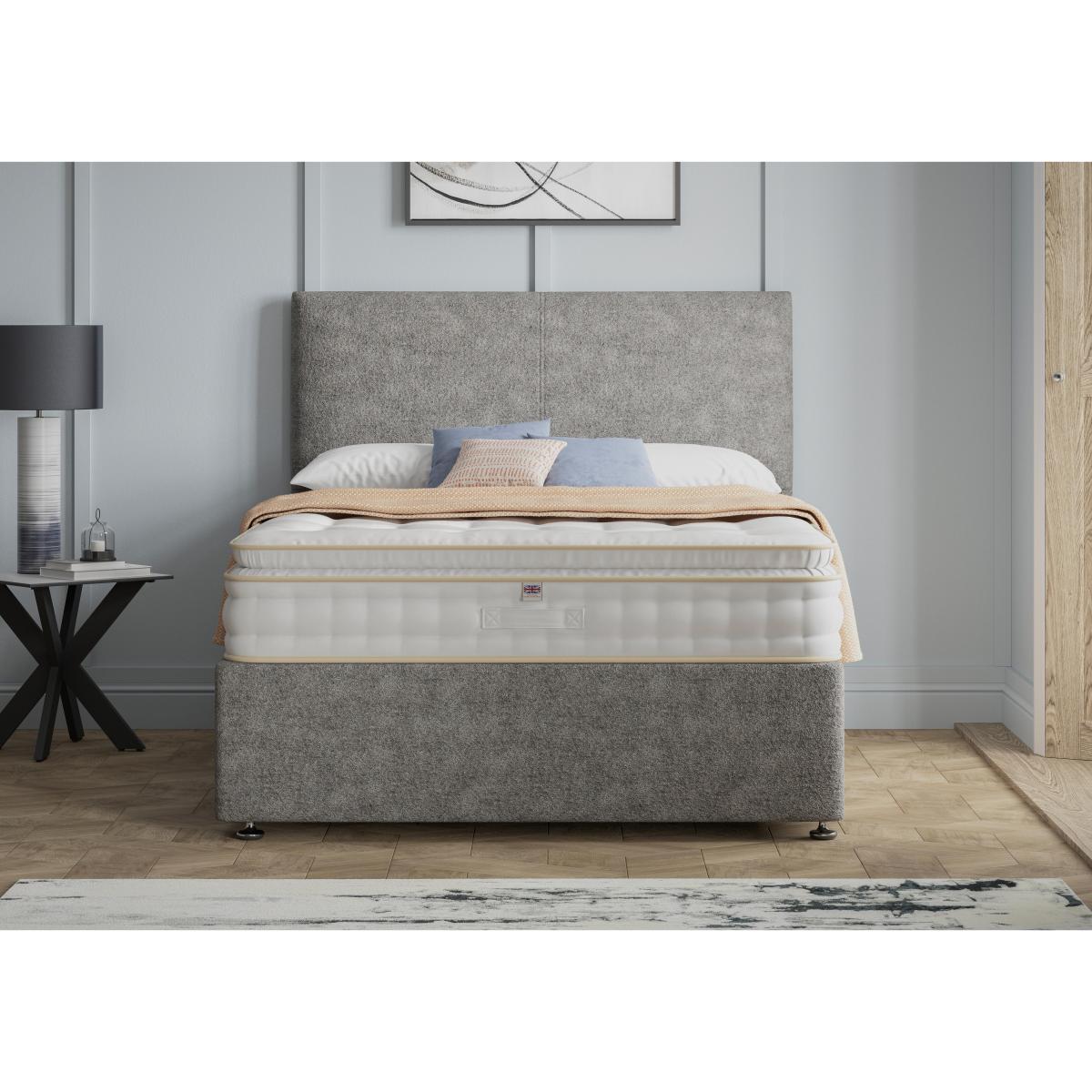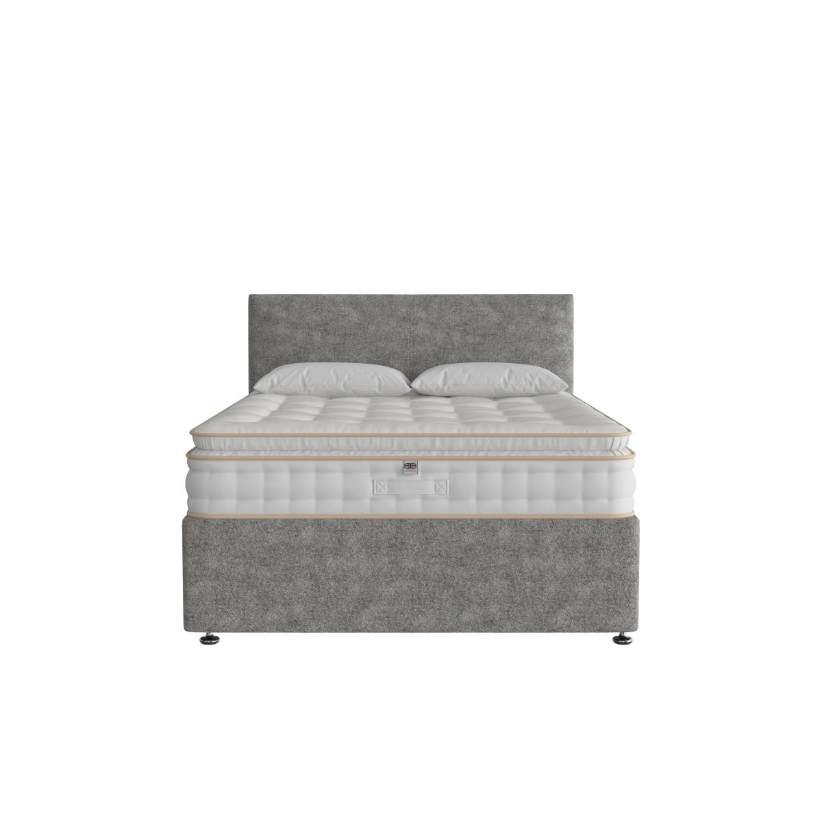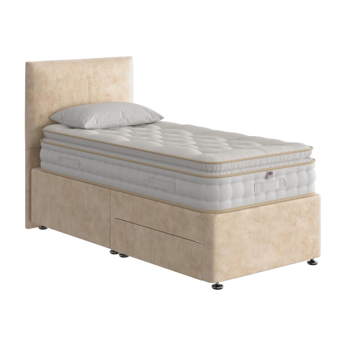This handcrafted divan set has everything you need for better sleep – a pillow top mattress atop a divan base with optional storage drawers for a clutter-free bedroom. Why you'll love it With its sprung pillow top mattress, this divan set is the secret to better sleep. Handcrafted using traditional techniques. Mattress has 2,000 individually pocketed springs in king size. All-natural, chemical-free cotton and Hampshire wool fillings. The cushioning pillow top provides a luxurious sleeping surface. Ventilated border has 2 rows of stitching for edge support. Handles make rotating the mattress easier. Upholstered divan base comes in a huge range of sophisticated colours. With optional storage drawers in a choice of configurations. Made in the UK and exclusive to Furniture Village. This divan set is part of the Handmade Bed Company Boutique 2000 Pillow Top range. What you need to know Headboard shown is the Handmade Bed Company Hoveton headboard, available separately. Mattress type: Pocket spring. Depth: 30 cm. Firmness: Medium. Springs: 2,000 in king size. Pillow top:Yes. Fillings: Chemical-free cotton and Hampshire wool. Cover: Chemical-free polyester and viscose. Requires turning: No. Base type: Platform-top with optional storage drawers. Sizes: Single, double, king, super king. Mattress care:Air for 4 hours before using to remove any odour. Allow at least 4 hours for springs to settle and for mattress to attain its full size. Indentations caused by settlement of fillings or body weight are normal and are not considered defects. If used on a slatted bed frame, the space between slats must be no wider than 7.5 cm. Spaces wider than this may cause excess dipping of the mattress and invalidate the guarantee. Always use a mattress protector. Rotate regularly. Divan base care: Clean upholstery weekly using a soft brush or vacuum with the curtain attachment. Professional cleaning advised for oil- and grease-based stains. Some fabrics can show wear on areas of more use or in direct sunlight.