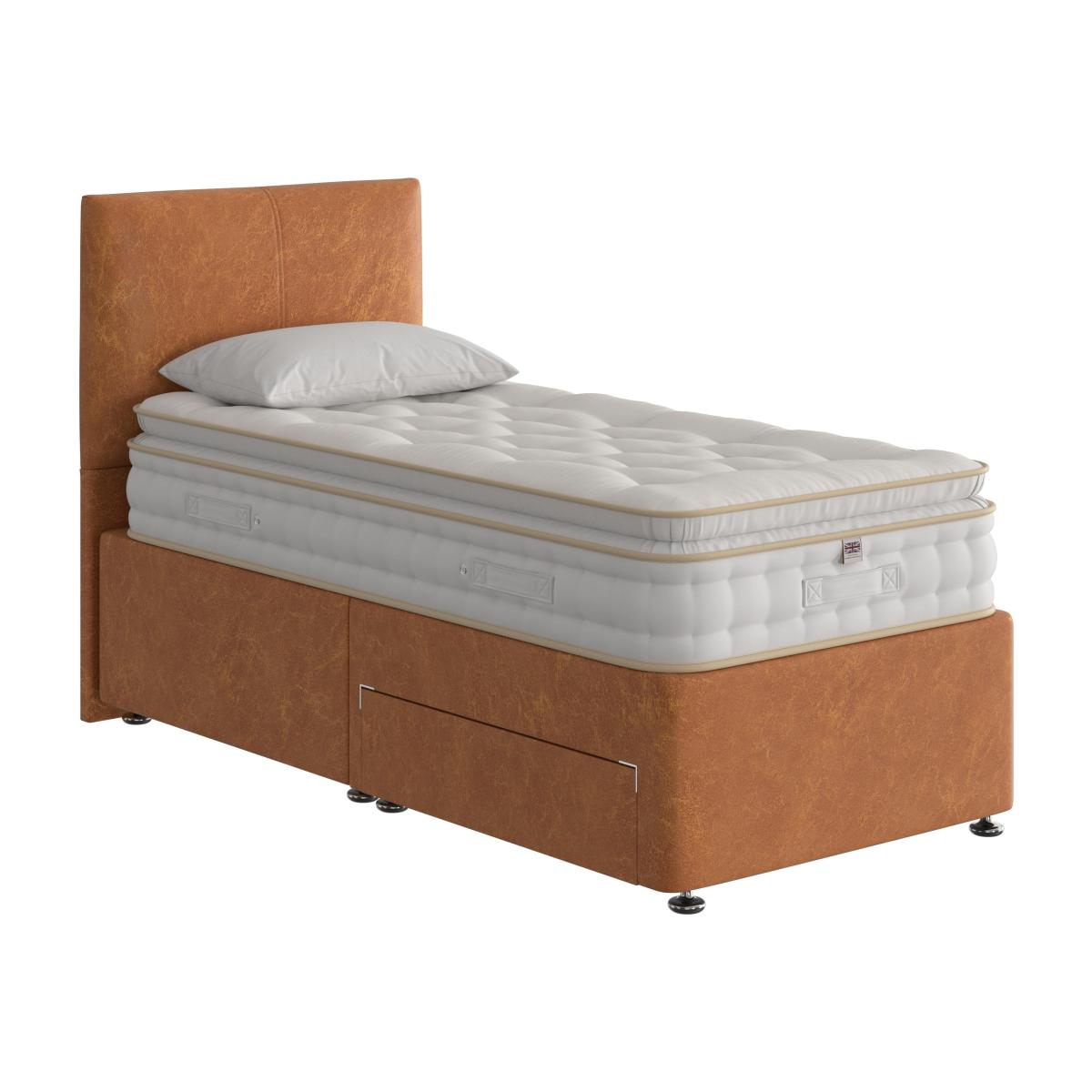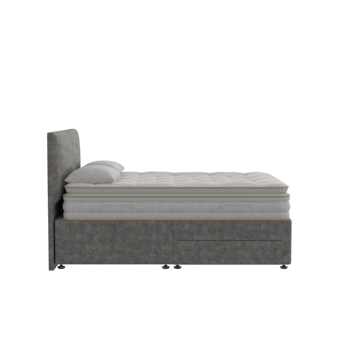 This handcrafted divan set has everything you need for better sleep – a pillow top mattress atop a divan base with optional storage drawers for a clutter-free bedroom. Why you'll love it With its sprung pillow top mattress, this divan set is the secret to better sleep. Handcrafted using traditional techniques. Mattress has 2,000 individually pocketed springs in king size. All-natural, chemical-free cotton and Hampshire wool fillings. The cushioning pillow top provides a luxurious sleeping surface. Ventilated border has 2 rows of stitching for edge support. Handles make rotating the mattress easier. Upholstered divan base comes in a huge range of sophisticated colours. With optional storage drawers in a choice of configurations. Made in the UK and exclusive to Furniture Village. This divan set is part of the Handmade Bed Company Boutique 2000 Pillow Top range. What you need to know Headboard shown is the Handmade Bed Company Hoveton headboard, available separately. Mattress type: Pocket spring. Depth: 30 cm. Firmness: Medium. Springs: 2,000 in king size. Pillow top:Yes. Fillings: Chemical-free cotton and Hampshire wool. Cover: Chemical-free polyester and viscose. Requires turning: No. Base type: Platform-top with optional storage drawers. Sizes: Single, double, king, super king. Mattress care:Air for 4 hours before using to remove any odour. Allow at least 4 hours for springs to settle and for mattress to attain its full size. Indentations caused by settlement of fillings or body weight are normal and are not considered defects. If used on a slatted bed frame, the space between slats must be no wider than 7.5 cm. Spaces wider than this may cause excess dipping of the mattress and invalidate the guarantee. Always use a mattress protector. Rotate regularly. Divan base care: Clean upholstery weekly using a soft brush or vacuum with the curtain attachment. Professional cleaning advised for oil- and grease-based stains. Some fabrics can show wear on areas of more use or in direct sunlight.