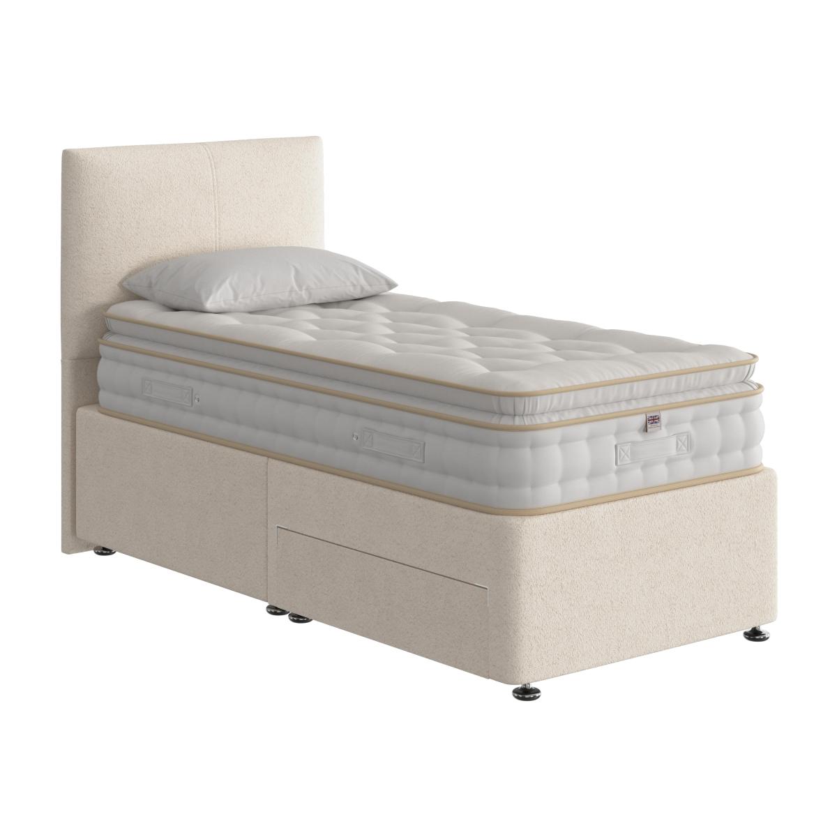 This handcrafted divan set has everything you need for better sleep – a pillow top mattress atop a divan base with optional storage drawers for a clutter-free bedroom. Why you'll love it With its sprung pillow top mattress, this divan set is the secret to better sleep. Handcrafted using traditional techniques. Mattress has 2,000 individually pocketed springs in king size. All-natural, chemical-free cotton and Hampshire wool fillings. The cushioning pillow top provides a luxurious sleeping surface. Ventilated border has 2 rows of stitching for edge support. Handles make rotating the mattress easier. Upholstered divan base comes in a huge range of sophisticated colours. With optional storage drawers in a choice of configurations. Made in the UK and exclusive to Furniture Village. This divan set is part of the Handmade Bed Company Boutique 2000 Pillow Top range. What you need to know Headboard shown is the Handmade Bed Company Hoveton headboard, available separately. Mattress type: Pocket spring. Depth: 30 cm. Firmness: Medium. Springs: 2,000 in king size. Pillow top:Yes. Fillings: Chemical-free cotton and Hampshire wool. Cover: Chemical-free polyester and viscose. Requires turning: No. Base type: Platform-top with optional storage drawers. Sizes: Single, double, king, super king. Mattress care:Air for 4 hours before using to remove any odour. Allow at least 4 hours for springs to settle and for mattress to attain its full size. Indentations caused by settlement of fillings or body weight are normal and are not considered defects. If used on a slatted bed frame, the space between slats must be no wider than 7.5 cm. Spaces wider than this may cause excess dipping of the mattress and invalidate the guarantee. Always use a mattress protector. Rotate regularly. Divan base care: Clean upholstery weekly using a soft brush or vacuum with the curtain attachment. Professional cleaning advised for oil- and grease-based stains. Some fabrics can show wear on areas of more use or in direct sunlight.