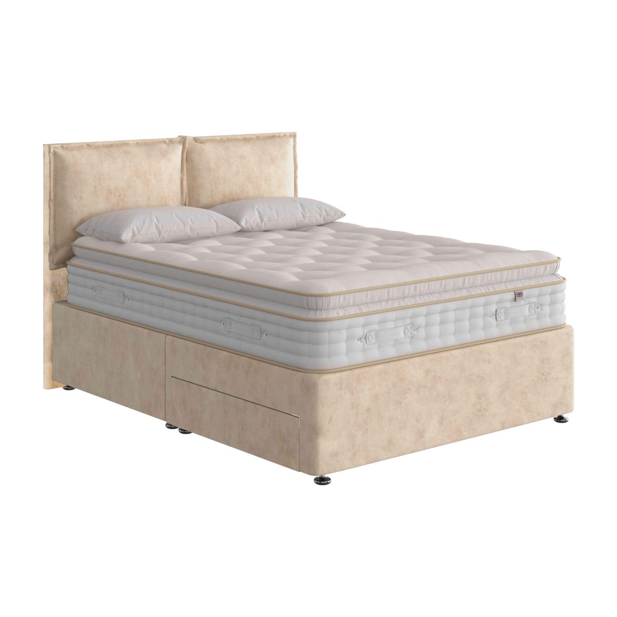 This stylish divan set promises real comfort thanks to the pillow top mattress with 3,000 pocket springs in king size. Customise it with your choice of fabric and storage drawer arrangement. Why you'll love it This stylish divan set comes complete with a sprung pillow top mattress. Handcrafted using traditional techniques. Mattress has 3,000 individually pocketed springs in king size. All-natural, chemical-free cotton and Hampshire wool fillings. The cushioning pillow top provides a luxurious sleeping surface. Ventilated border has 2 rows of stitching for edge support. Handles make rotating the mattress easier. Upholstered divan base comes in a huge range of sophisticated colours. With optional storage drawers in a choice of configurations. Made in the UK and exclusive to Furniture Village. This divan set is part of the Handmade Bed Company Boutique 3000 Pillow Top range. What you need to know Headboard shown is the Handmade Bed Company Standford headboard, available separately. Mattress type: Pocket spring. Depth: 32 cm. Firmness: Medium. Springs: 3,000 in king size. Pillow top:Yes. Fillings: Chemical-free cotton and Hampshire wool. Cover: Chemical-free polyester and viscose. Requires turning: No. Base type: Platform-top with optional storage drawers. Sizes: Single, double, king, super king. Mattress care:Air for 4 hours before using to remove any odour. Allow at least 4 hours for springs to settle and for mattress to attain its full size. Indentations caused by settlement of fillings or body weight are normal and are not considered defects. If used on a slatted bed frame, the space between slats must be no wider than 7.5 cm. Spaces wider than this may cause excess dipping of the mattress and invalidate the guarantee. Always use a mattress protector. Rotate regularly. Divan base care: Clean upholstery weekly using a soft brush or vacuum with the curtain attachment. Professional cleaning advised for oil- and grease-based stains. Some fabrics can show wear on areas of more use or in direct sunlight.