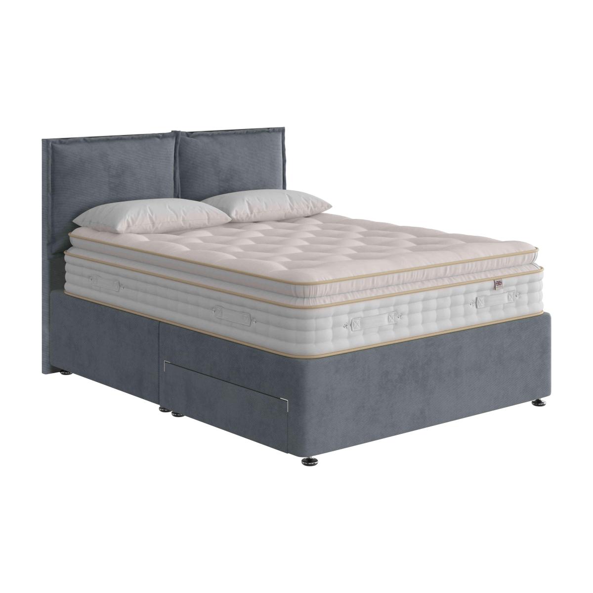 This stylish divan set promises real comfort thanks to the pillow top mattress with 3,000 pocket springs in king size. Customise it with your choice of fabric and storage drawer arrangement. Why you'll love it This stylish divan set comes complete with a sprung pillow top mattress. Handcrafted using traditional techniques. Mattress has 3,000 individually pocketed springs in king size. All-natural, chemical-free cotton and Hampshire wool fillings. The cushioning pillow top provides a luxurious sleeping surface. Ventilated border has 2 rows of stitching for edge support. Handles make rotating the mattress easier. Upholstered divan base comes in a huge range of sophisticated colours. With optional storage drawers in a choice of configurations. Made in the UK and exclusive to Furniture Village. This divan set is part of the Handmade Bed Company Boutique 3000 Pillow Top range. What you need to know Headboard shown is the Handmade Bed Company Standford headboard, available separately. Mattress type: Pocket spring. Depth: 32 cm. Firmness: Medium. Springs: 3,000 in king size. Pillow top:Yes. Fillings: Chemical-free cotton and Hampshire wool. Cover: Chemical-free polyester and viscose. Requires turning: No. Base type: Platform-top with optional storage drawers. Sizes: Single, double, king, super king. Mattress care:Air for 4 hours before using to remove any odour. Allow at least 4 hours for springs to settle and for mattress to attain its full size. Indentations caused by settlement of fillings or body weight are normal and are not considered defects. If used on a slatted bed frame, the space between slats must be no wider than 7.5 cm. Spaces wider than this may cause excess dipping of the mattress and invalidate the guarantee. Always use a mattress protector. Rotate regularly. Divan base care: Clean upholstery weekly using a soft brush or vacuum with the curtain attachment. Professional cleaning advised for oil- and grease-based stains. Some fabrics can show wear on areas of more use or in direct sunlight.