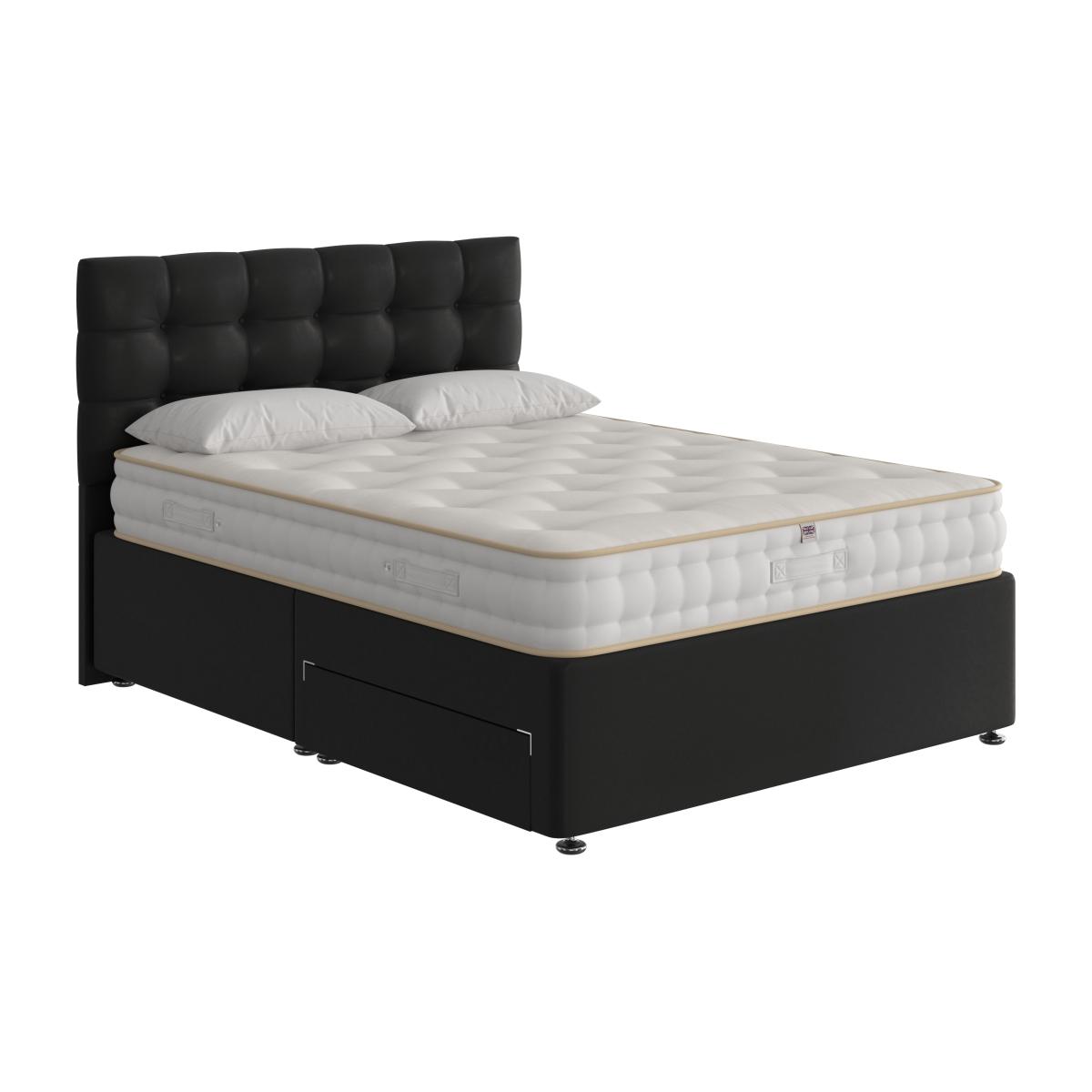 If a firm mattress means you sleep better and you have an eye for style, then this divan set should tick all the boxes. It’s available in a wide range of fabrics and even has optional storage. Why you'll love it This stylish divan set comes with a superb firm mattress and optional built-in storage. Handcrafted using traditional techniques. Mattress has 1,000 individually pocketed springs in king size. All-natural, chemical-free cotton and Hampshire wool fillings. The cushioning pillow top provides a luxurious sleeping surface. Ventilated border has 2 rows of stitching for edge support. Handles make rotating the mattress easier. Upholstered divan base comes in a huge range of sophisticated colours. With optional storage drawers in a choice of configurations. Made in the UK and exclusive to Furniture Village. This divan set is part of the Handmade Bed Company Boutique Ortho range. What you need to know Headboard shown is the Handmade Bed Company Windermere headboard, available separately. Mattress type: Pocket spring. Depth: 28 cm. Firmness: Firm. Springs: 1,000 in king size. Pillow top:Yes. Fillings: Chemical-free cotton and Hampshire wool. Cover: Chemical-free polyester and viscose. Requires turning: No. Base type: Platform-top with optional storage drawers. Sizes: Single, double, king, super king. Mattress care:Air for 4 hours before using to remove any odour. Allow at least 4 hours for springs to settle and for mattress to attain its full size. Indentations caused by settlement of fillings or body weight are normal and are not considered defects. If used on a slatted bed frame, the space between slats must be no wider than 7.5 cm. Spaces wider than this may cause excess dipping of the mattress and invalidate the guarantee. Always use a mattress protector. Rotate regularly. Divan base care: Clean upholstery weekly using a soft brush or vacuum with the curtain attachment. Professional cleaning advised for oil- and grease-based stains. Some fabrics can show wear on areas of more use or in direct sunlight.