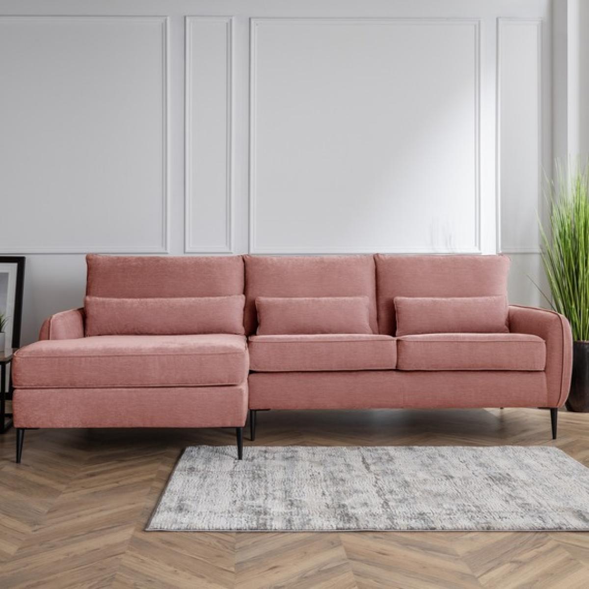 I love this pink chaise for its bold colour and versatile shape, making it a statement piece that still feels approachable. It works particularly well in contemporary or Scandinavian interiors where soft pastel tones and clean lines are appreciated. To style it effectively, consider pairing it with neutral or muted accessories to let the plum hue stand out, and add textured cushions or throws for comfort and visual interest. Practical tips include placing it against a plain wall to highlight the colour and balance it with other pink or blush accents throughout the room. Its left-hand configuration makes it perfect for creating cosy corner arrangements in open-plan living spaces.