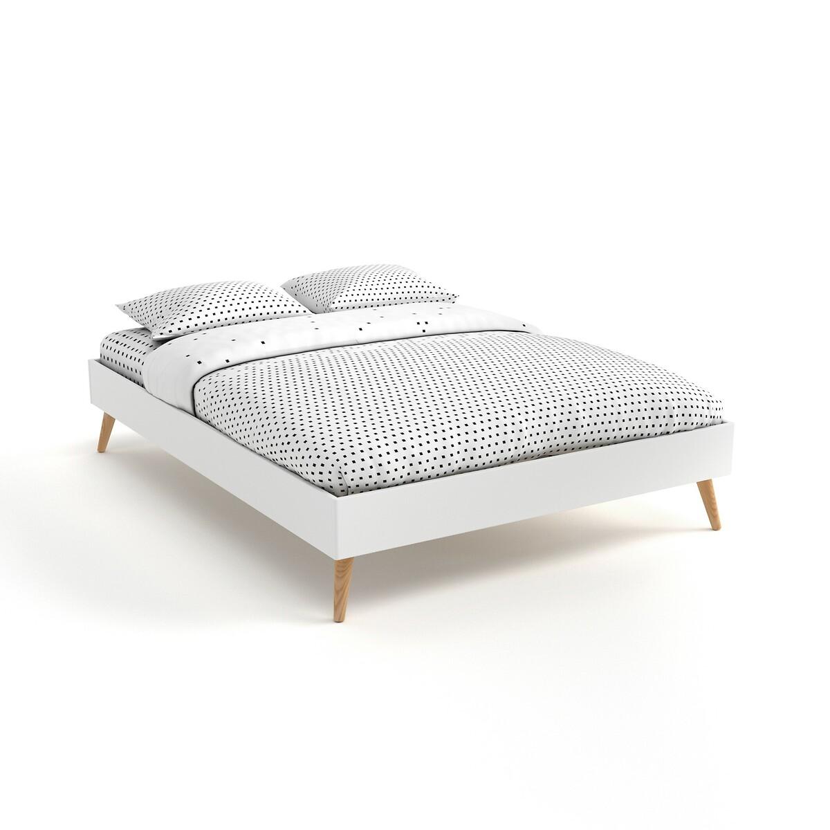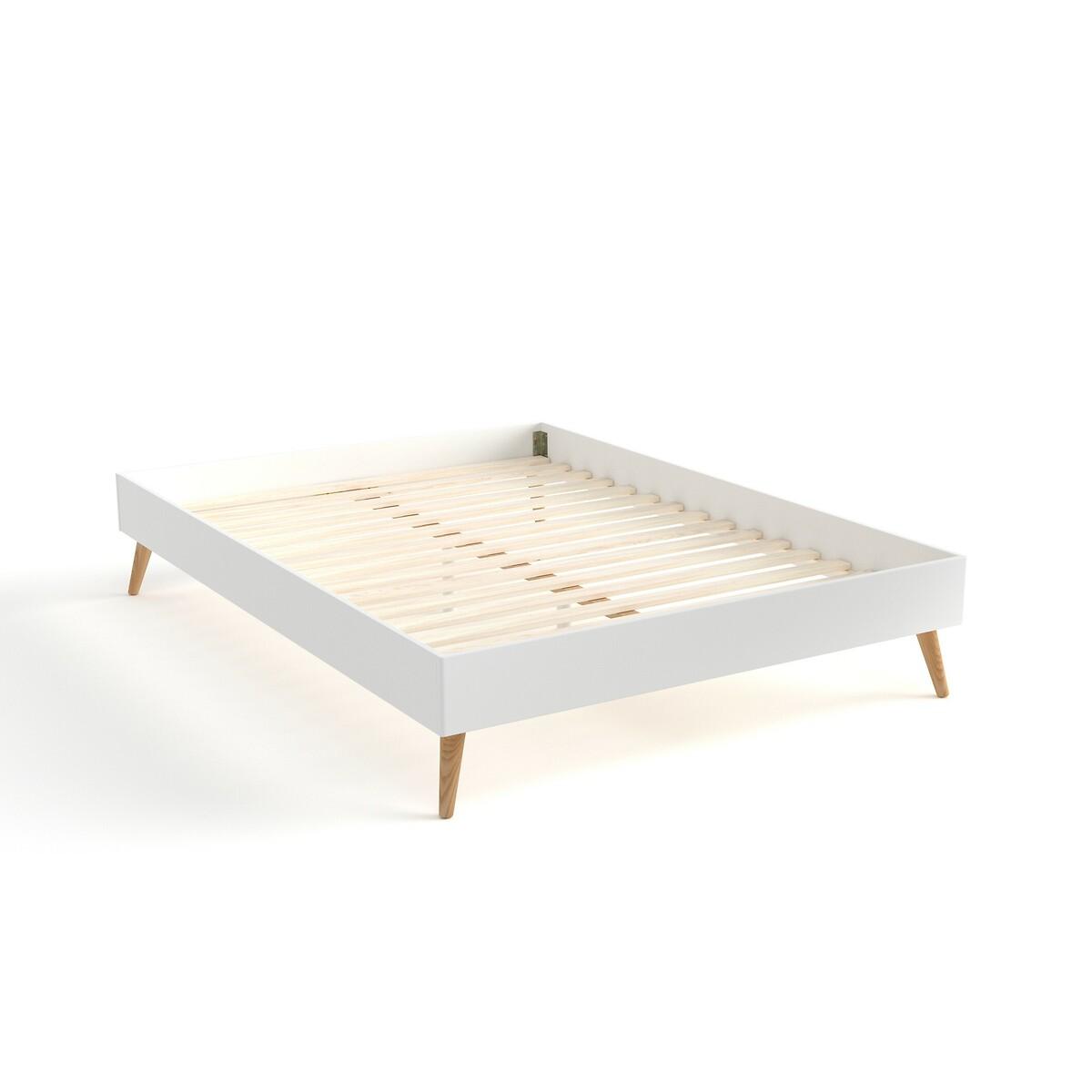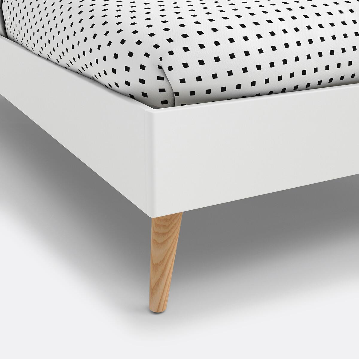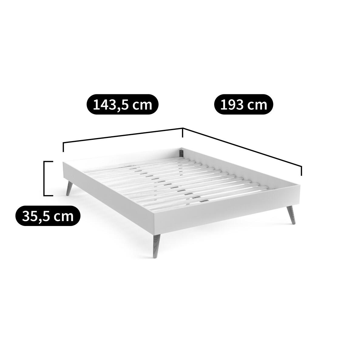 The Jimi bed. Its sleek and modern style matches all interiors.. Designed by La Redoute Intérieurs. Product Details • Lacquered MDF with acrylic finish (water-based paint without solvent) • Tapered legs in solid rubberwood with acrylic varnish finish • Central bar and reinforcing feet in raw solid pine • Integrated plywood slatted base • To move your bed, we advise you to lift it and not push or pull it. Dimensions Overall Size 140 (Double) • Width: 143.8cm • Height: 35.6cm • Length: 193.6cm • Height available under the bed: 18.6cm • Weight: 37kg. Size 160 (King) • Width: 163.8cm • Height: 35.7cm • Length: 203.6cm • Height available under the bed: 18.6cm • Weight: 41kg • Assembly required. • WOOD FROM MORE SUSTAINABLY MANAGED FORESTS AND CONTROLLED SOURCES. FSC® Mix wood contains at least 70% FSC® certified and/or recycled wood, the remainder being FSC® controlled wood. Dimensions and weight of parcel:1 parcel. Double SizeL20. 0 x D54 x H9.6cm, 40kg. King SizeL21. 6 x D54 x H9.6cm, 45kg