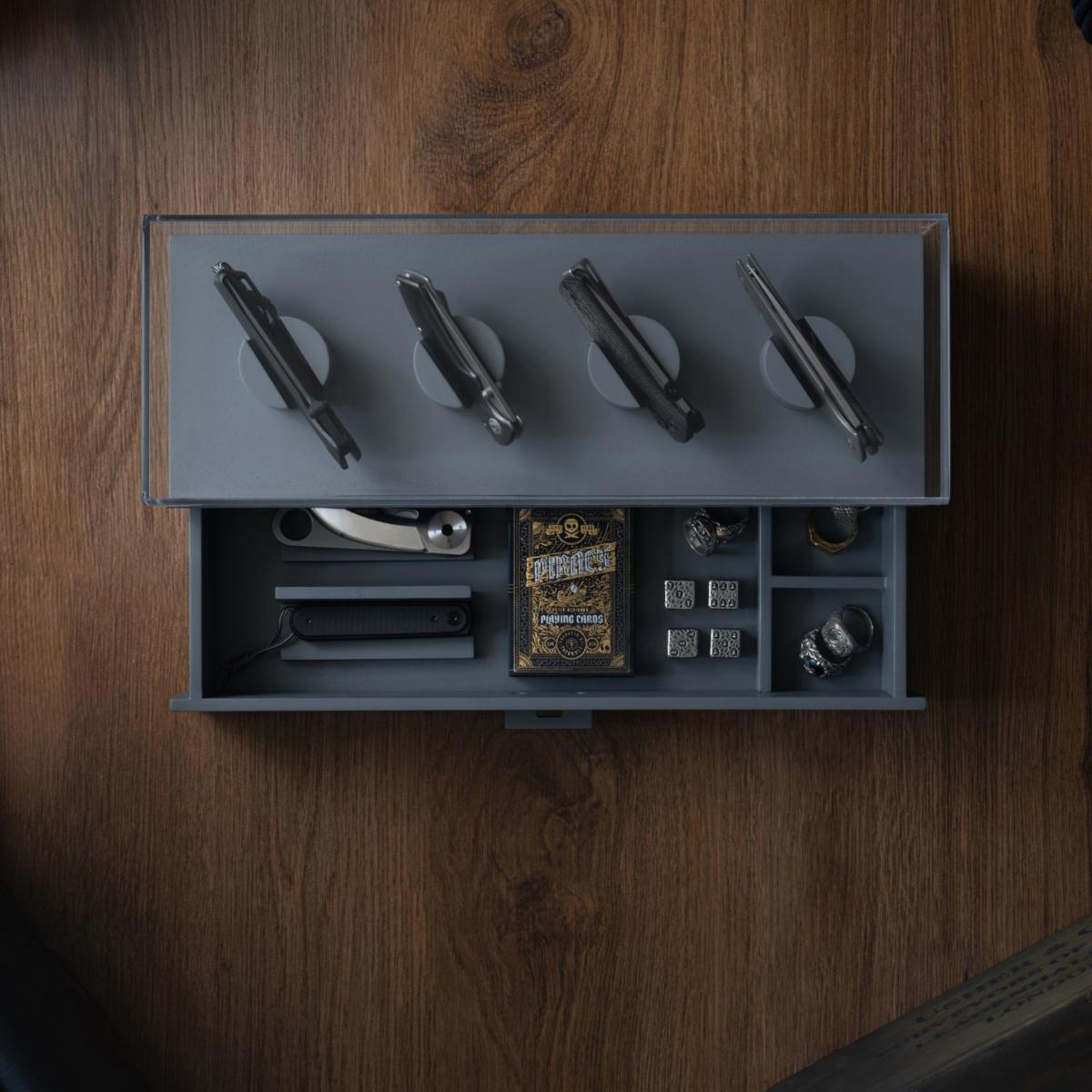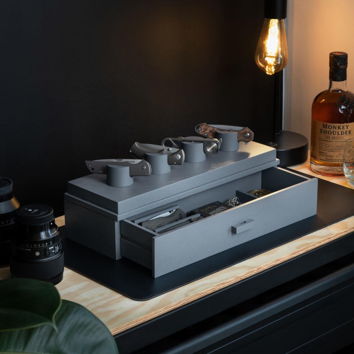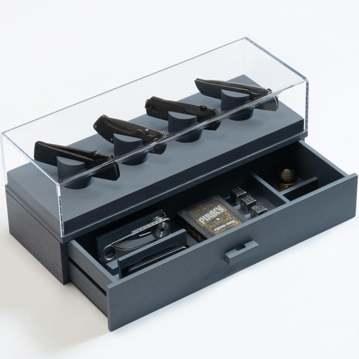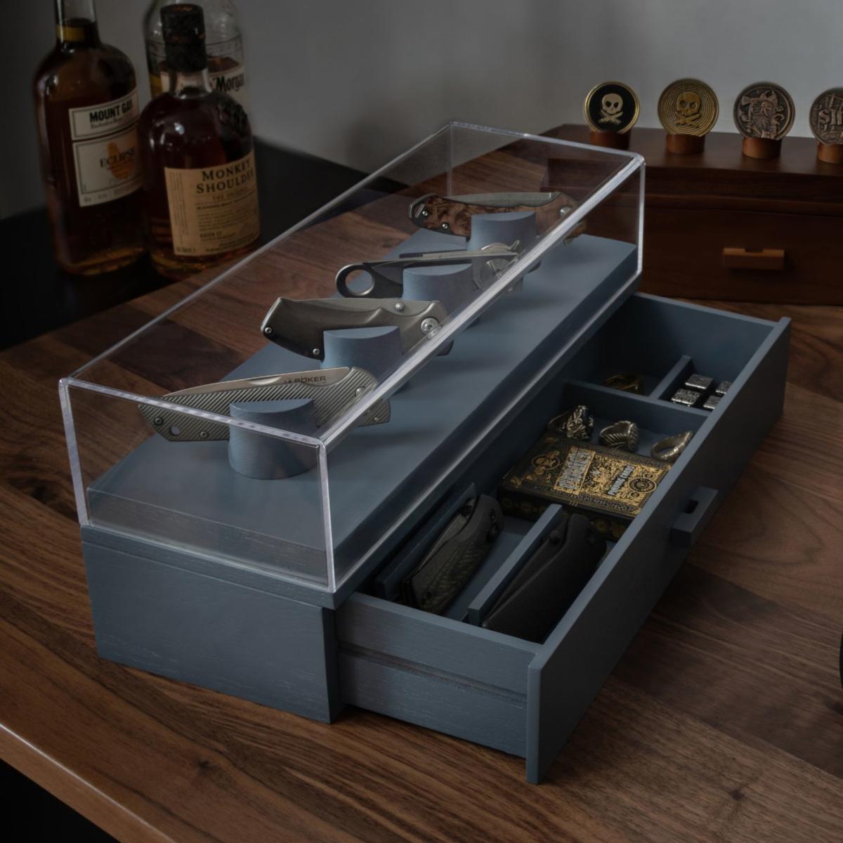 Your pocket knives are uniquely designed, and your knife display should be too. The days of housing your knives in a zip-up wallet or a dusty old cabinet are finally over. You can finally display and organize your whole collection! Designed to showcase your favorite knives, giving them the platform they deserve, while organizing the rest of your collection in the drawer. With a solid acrylic cover and felt lined drawer, you can provide the ultimate protection for your collection. Keep your favorite knives on display Drawer for additional 2 knives and your other EDC gear Designed to hold 4 - 6 knives. Protect your knives from dust with the acrylic cover Arrives fully assembled