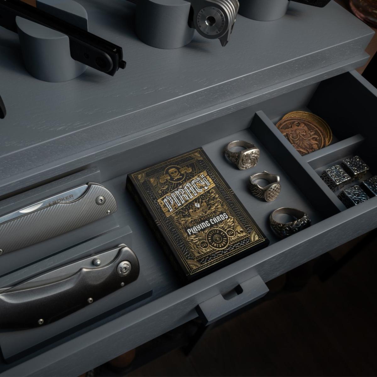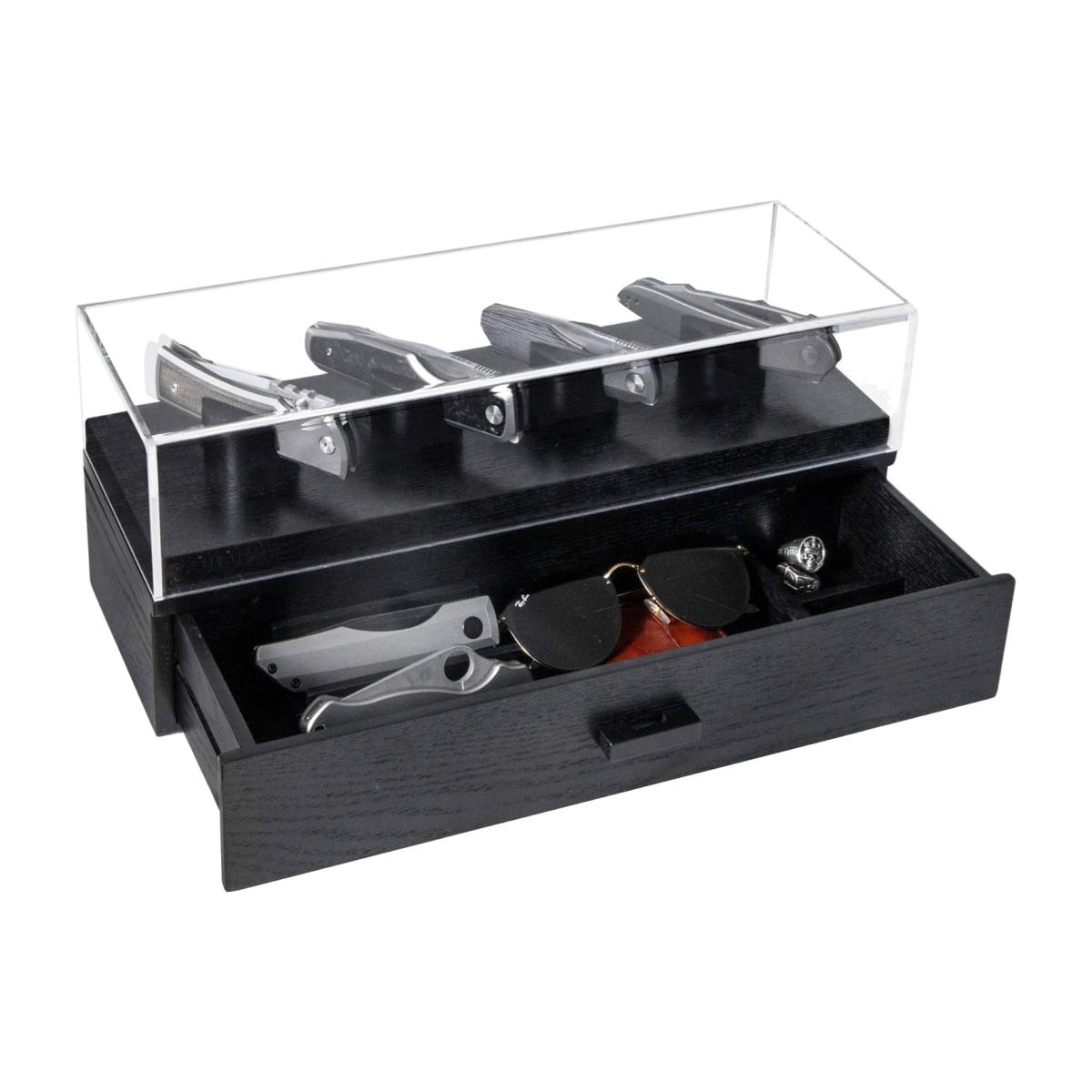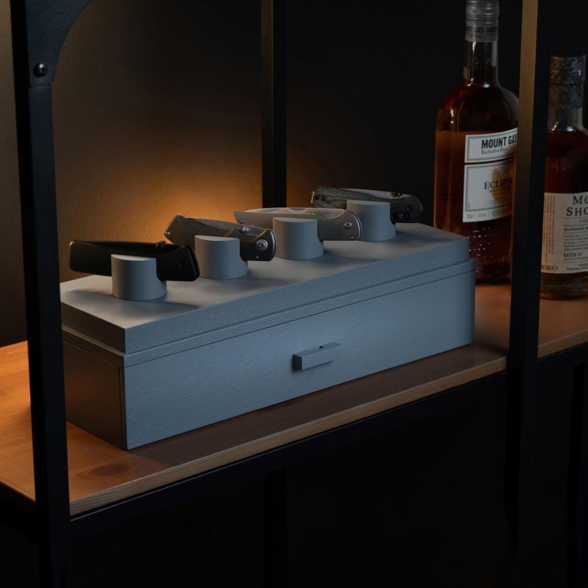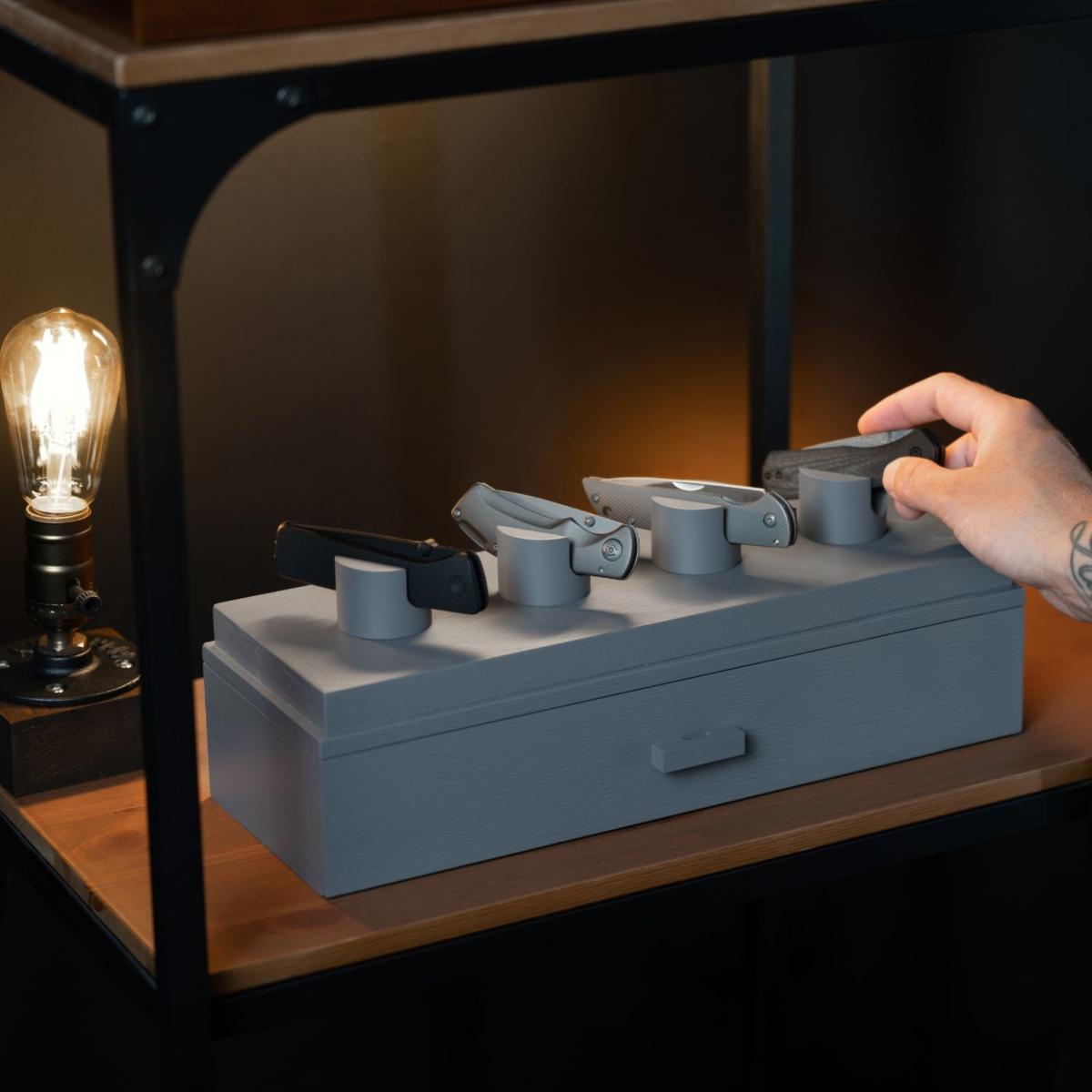 Your pocket knives are uniquely designed, and your knife display should be too. The days of housing your knives in a zip-up wallet or a dusty old cabinet are finally over. You can finally display and organize your whole collection! Designed to showcase your favorite knives, giving them the platform they deserve, while organizing the rest of your collection in the drawer. With a solid acrylic cover and felt lined drawer, you can provide the ultimate protection for your collection. Keep your favorite knives on display Drawer for additional 2 knives and your other EDC gear Designed to hold 4 - 6 knives. Protect your knives from dust with the acrylic cover Arrives fully assembled