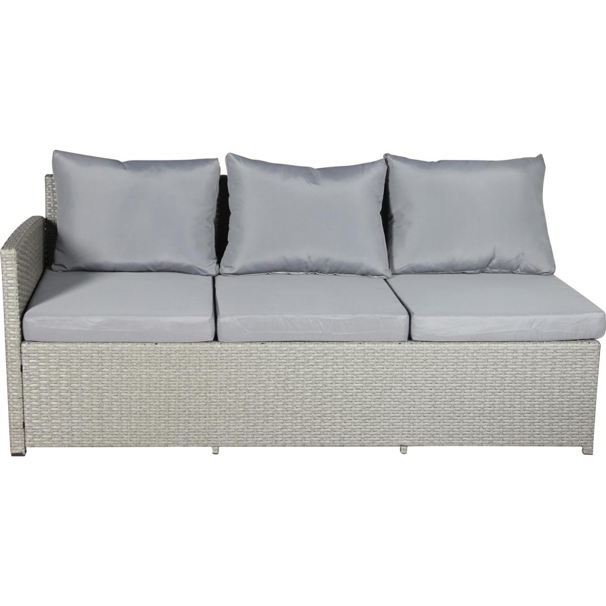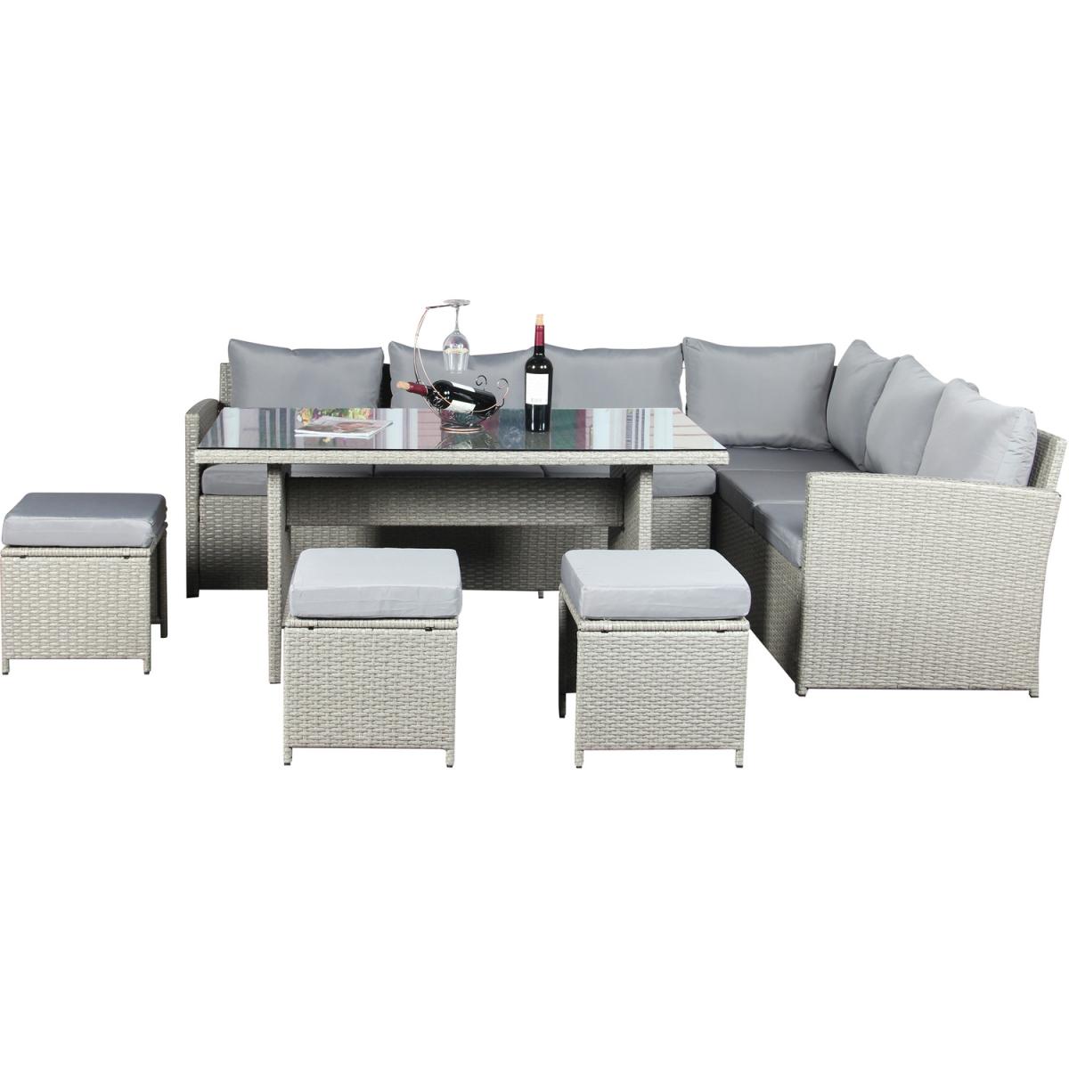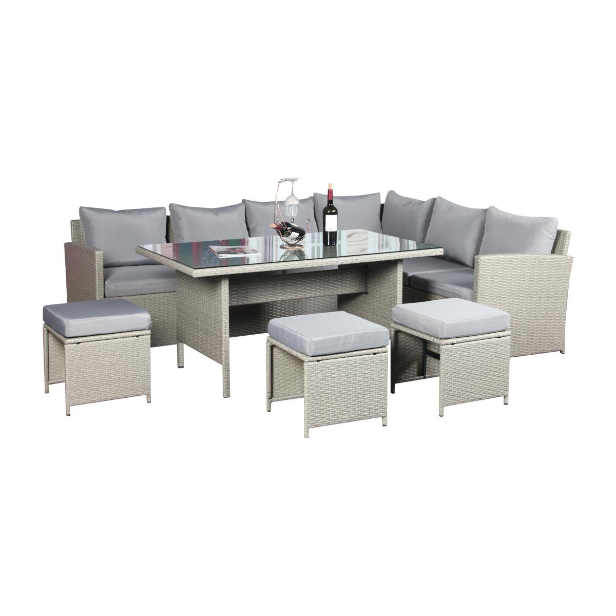 The Knutsford 9-seat corner rattan set from our Cheshire range is perfect for big gatherings. If you have the space available in your garden, you deserve the luxury of this set. This stylish seating area allows all your family and friends to sit together in comfort and style whilst enjoying the outdoors. The Grey rattan is a blend of tones to match any surroundings, this corner sofa set will fit perfectly into any modern or contemporary garden and is easy to maintain. The set includes a 3-seater sofa, 3-sided sofa, glass-topped garden table and three footstools, so there's no excuse not to take the weight off your feet. The deep filled cushions guarantee comfort and full support. A classic choice for outdoor living, this beautiful corner set will look the part in any contemporary or traditional garden. Made from all-weather garden fabric to withstand British weather! Our Rattan is premium PE and the frame is coated to offer longstanding protection against all the elements. Tempered glass tabletop ensures durability and makes it easy to wipe clean. Weather and water-resistant cushions (Please read care label - bring cushions indoors in harsh weather conditions).
